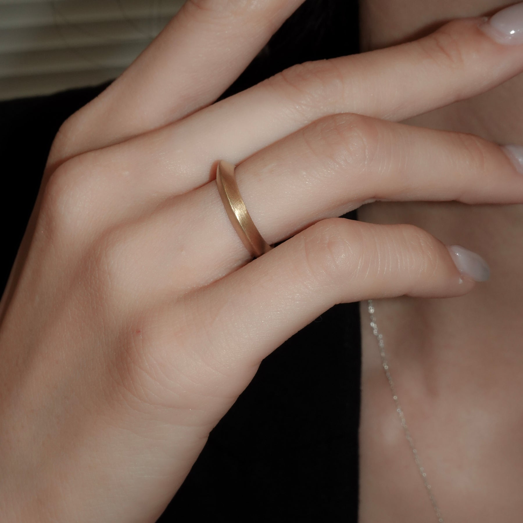 シャープなフォルムのリング。表面は美しいマット仕上げで、コーディネートの主役にも名脇役にもなってくれます。