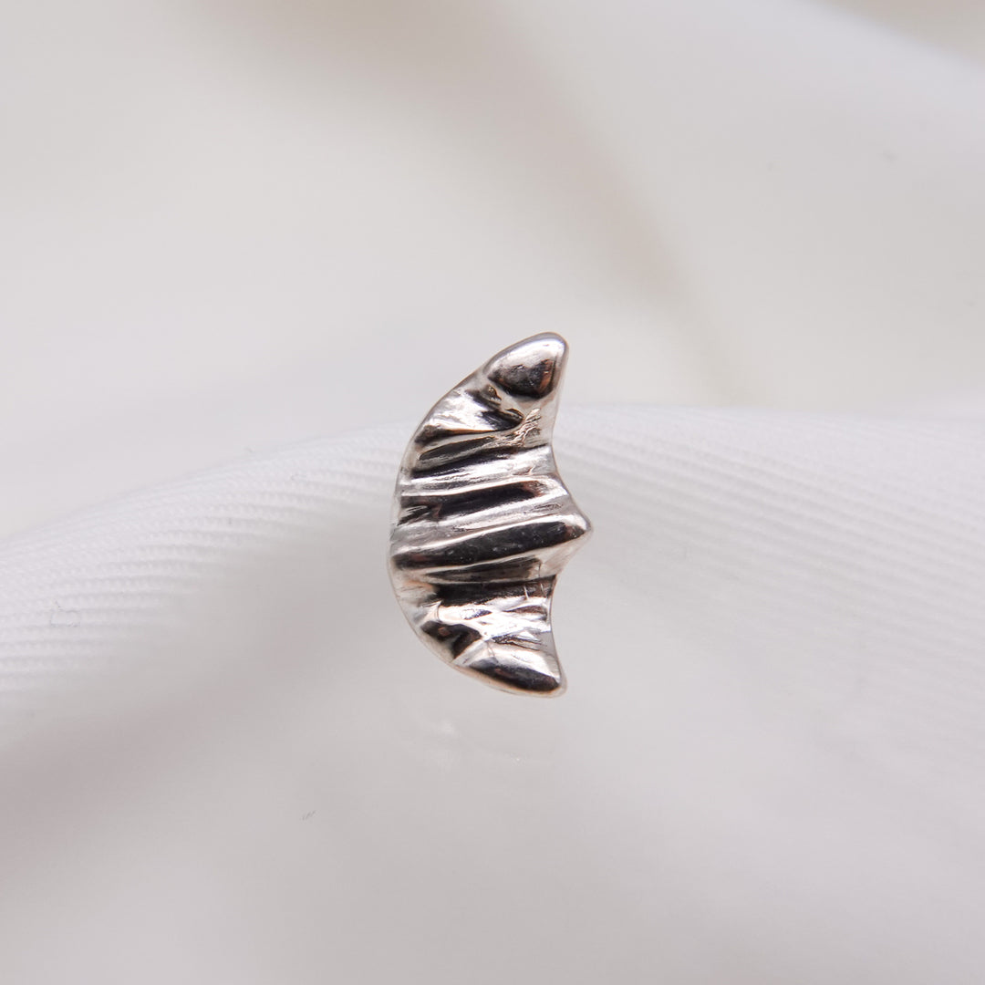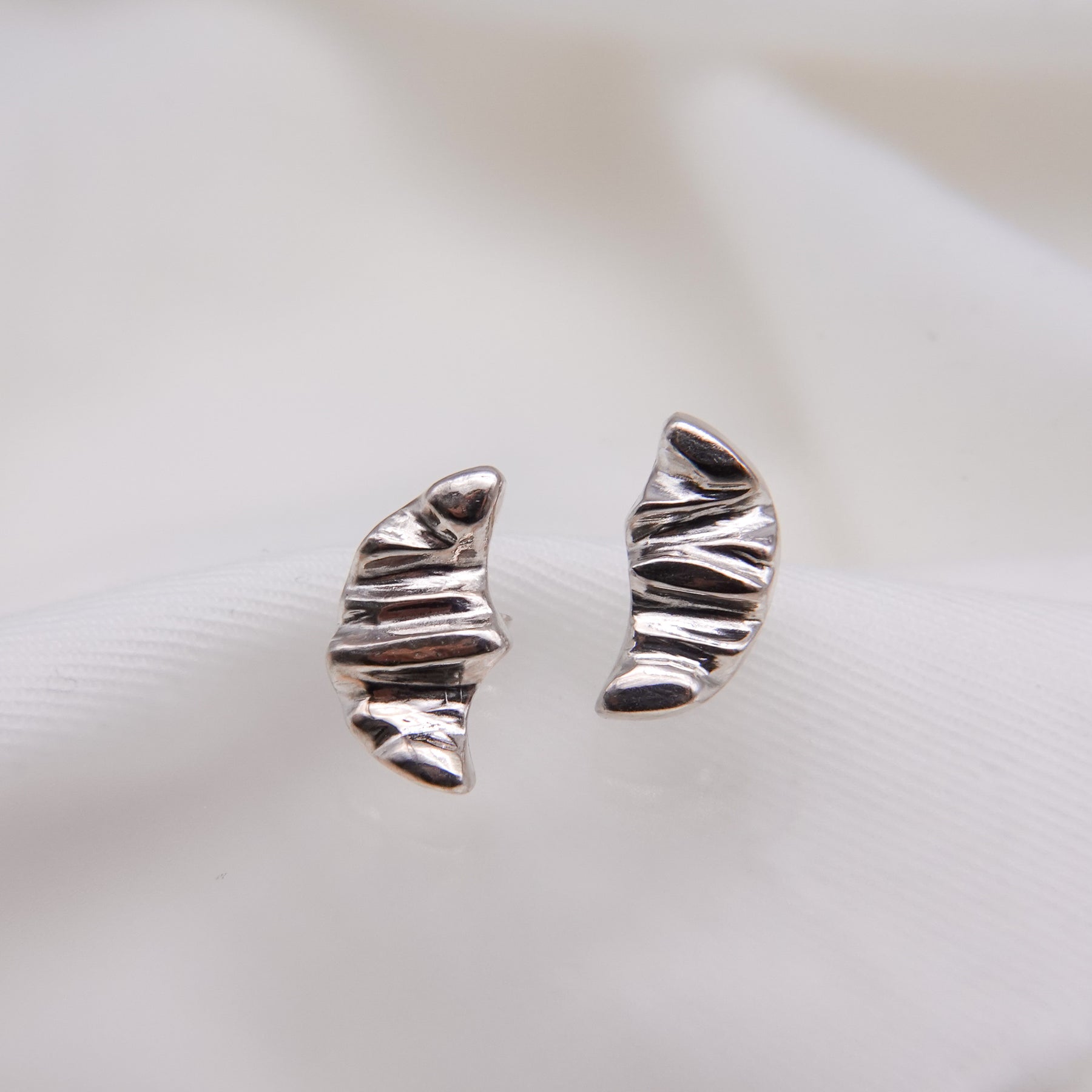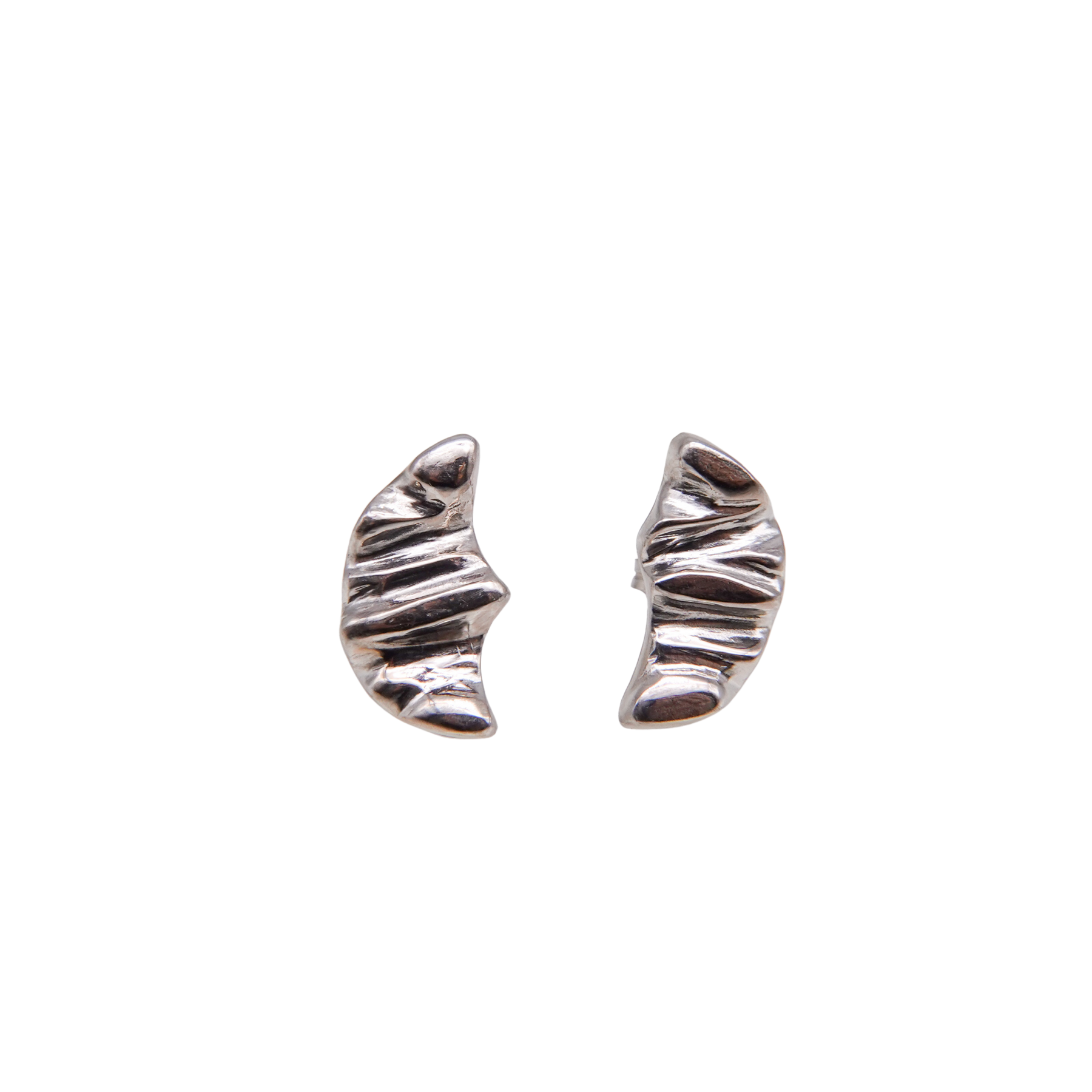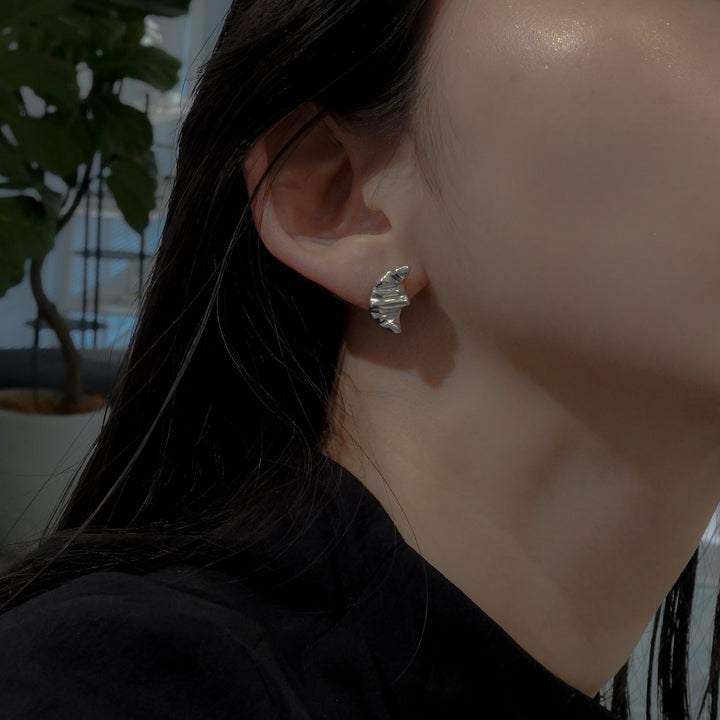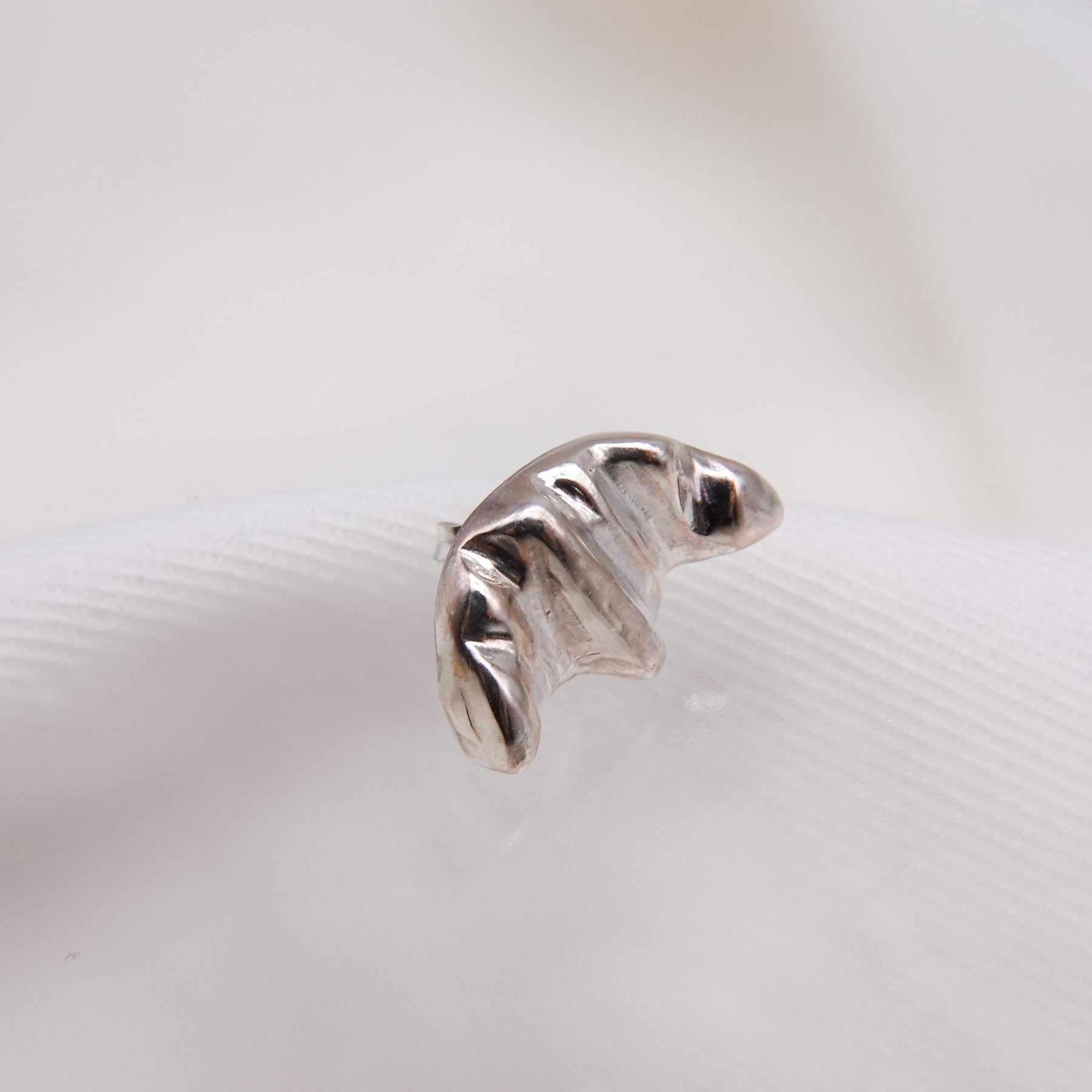三日月のような、クロワッサンのようにも見えるピアス。シルバーで表現する柔らかい起伏が特徴的。控えめの左右非対称のデザインがミニマルなスタイルからトレンド感のあるスタイルまで幅広く楽しめるアイテムです。