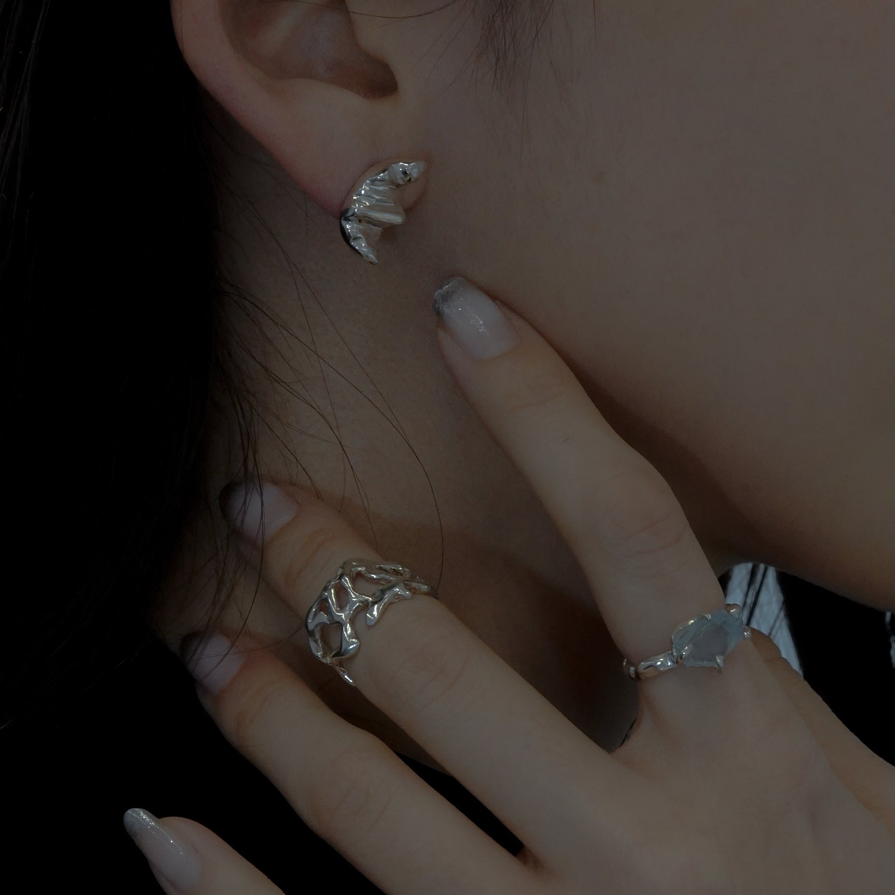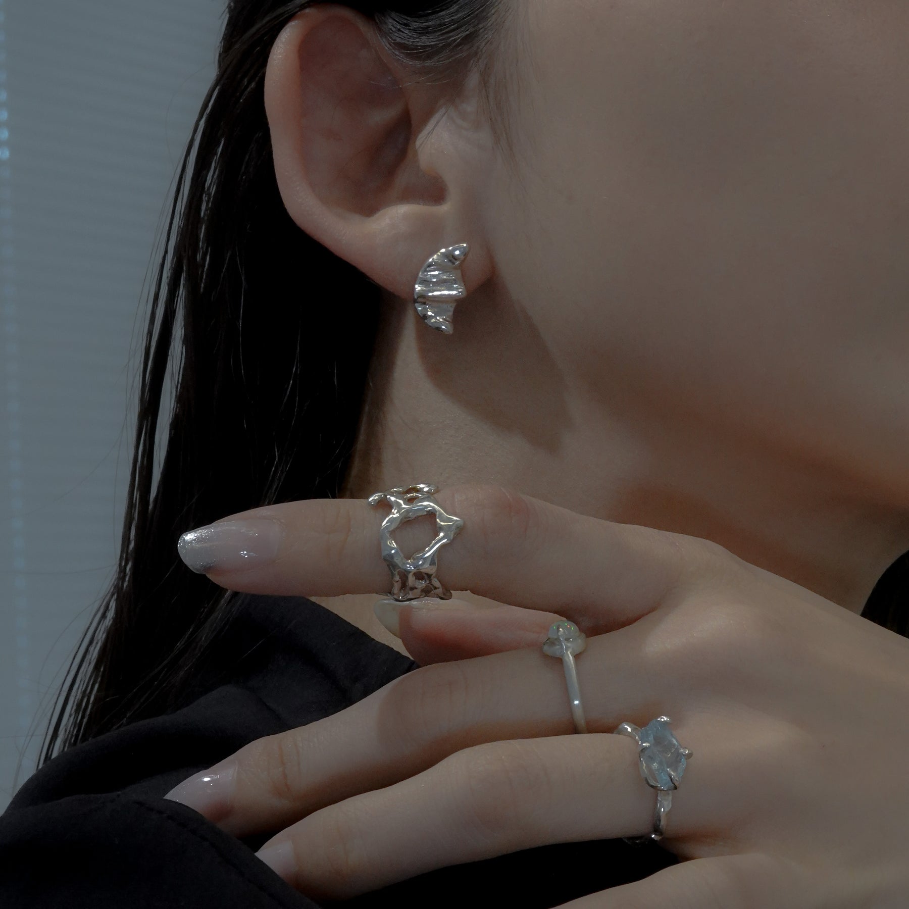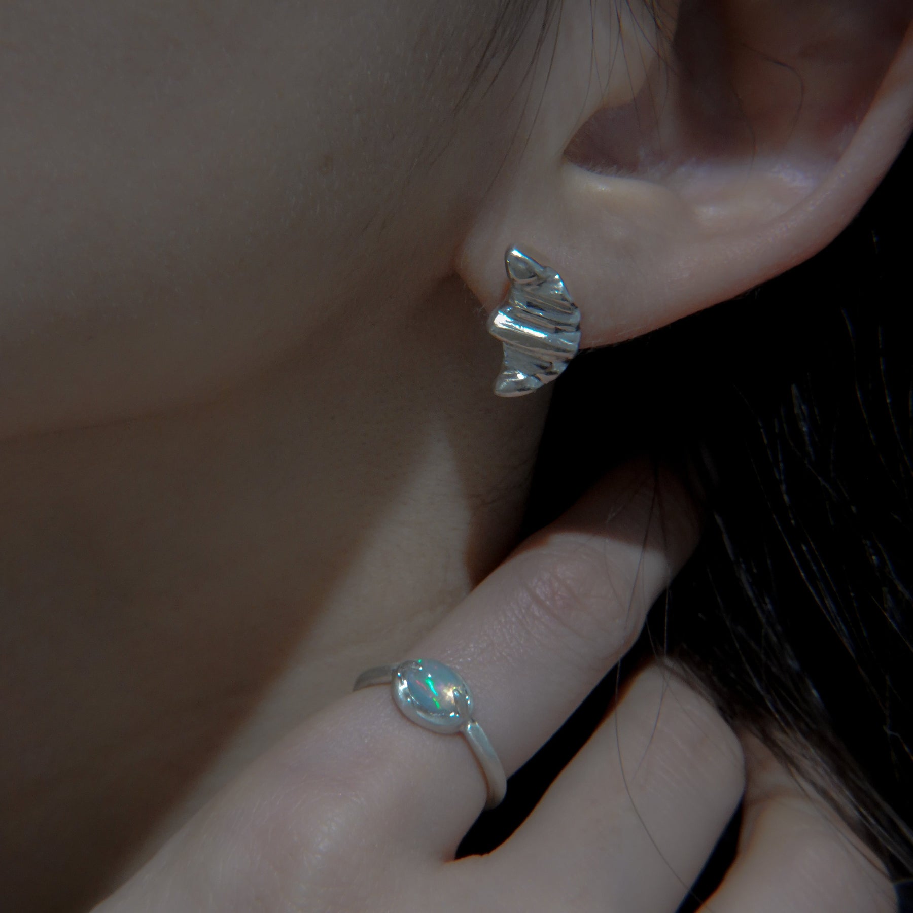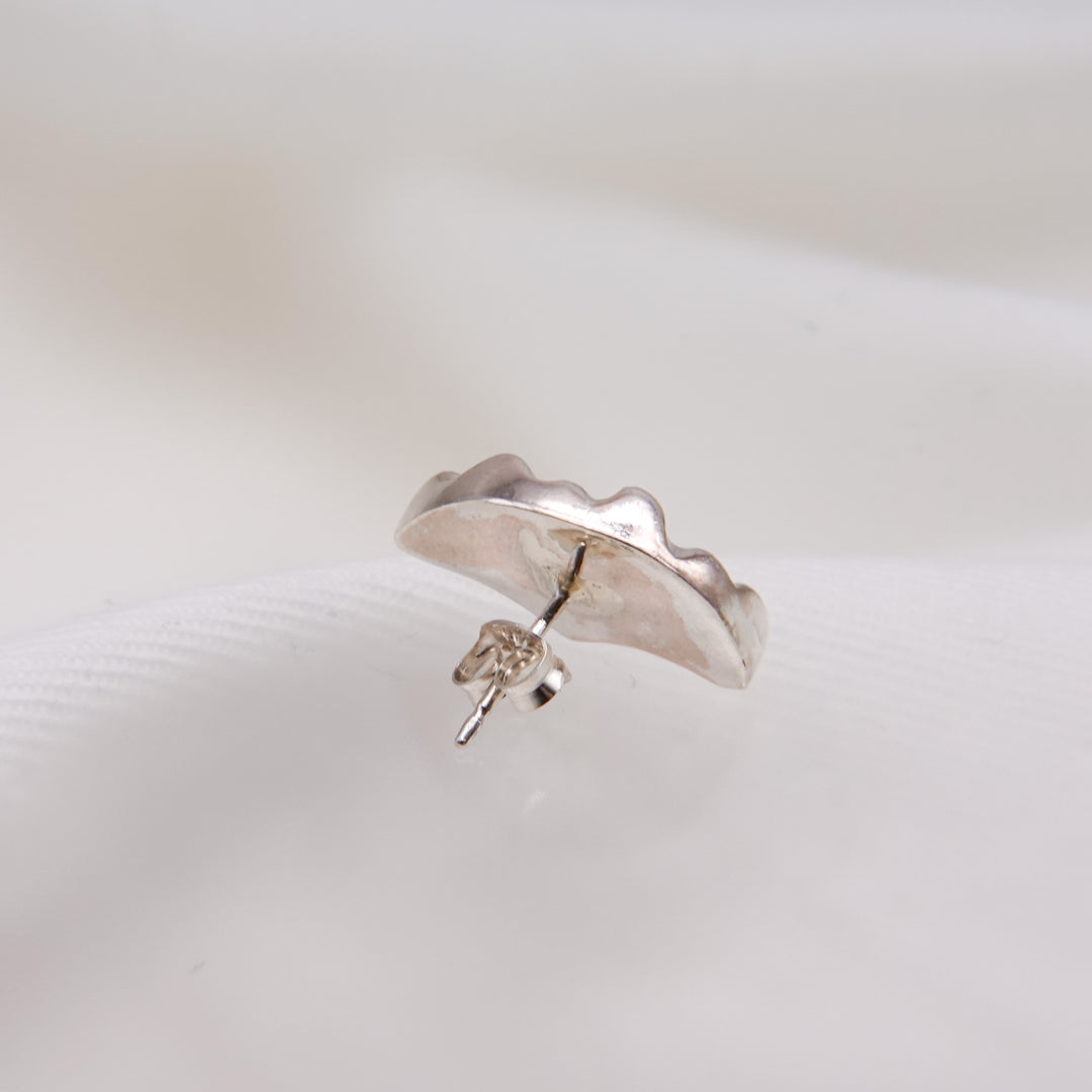 三日月のような、クロワッサンのようにも見えるピアス。シルバーで表現する柔らかい起伏が特徴的。控えめの左右非対称のデザインがミニマルなスタイルからトレンド感のあるスタイルまで幅広く楽しめるアイテムです。