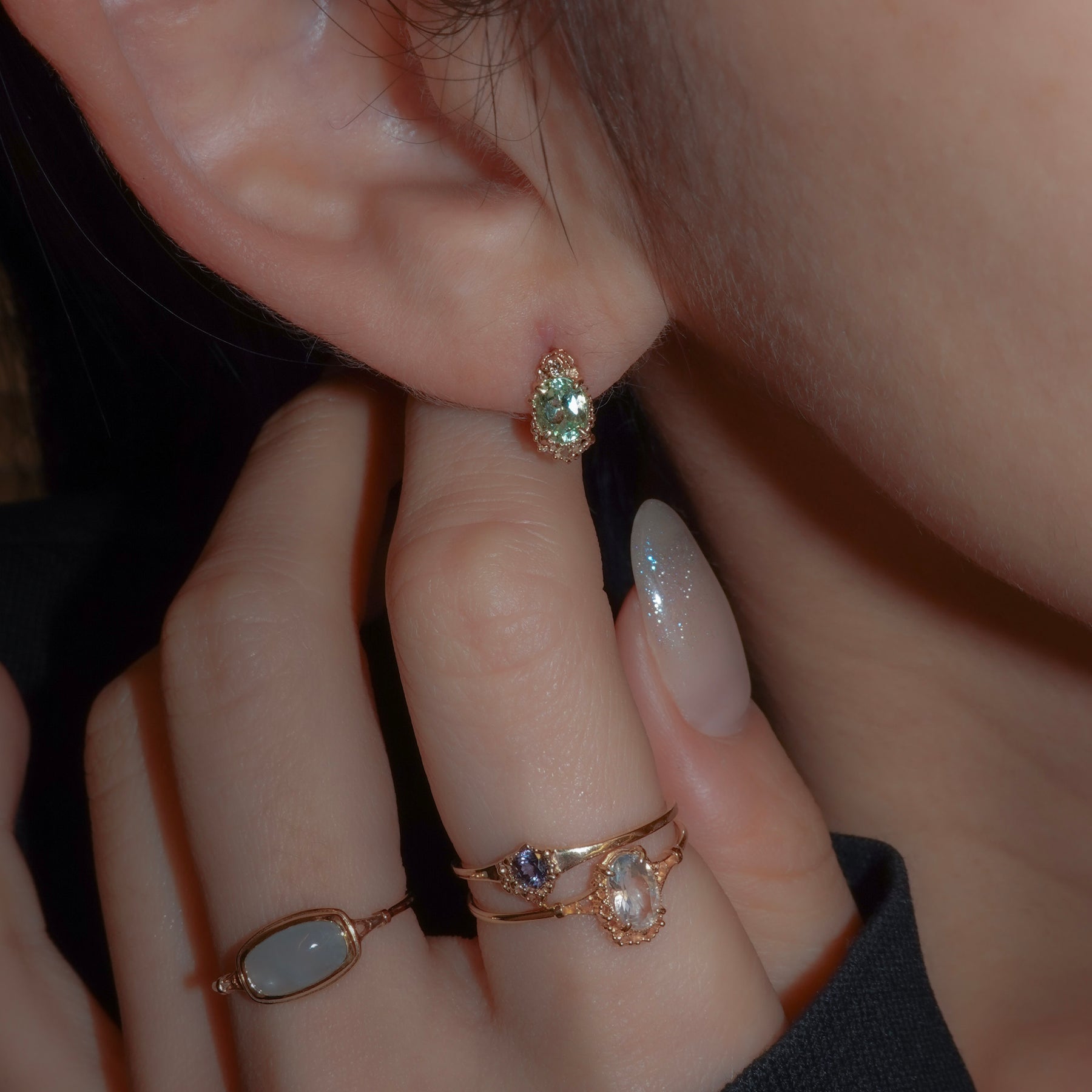 MYACALE JEWELRY(ミャカレ ジュエリー)は1点ずつ石を仕入れ、仕立てている日本のジュエリーブランド。石座やアームには繊細な装飾が施され、一本でも重ね付けでも楽しめる絶妙なバランスのアイテムが揃う。