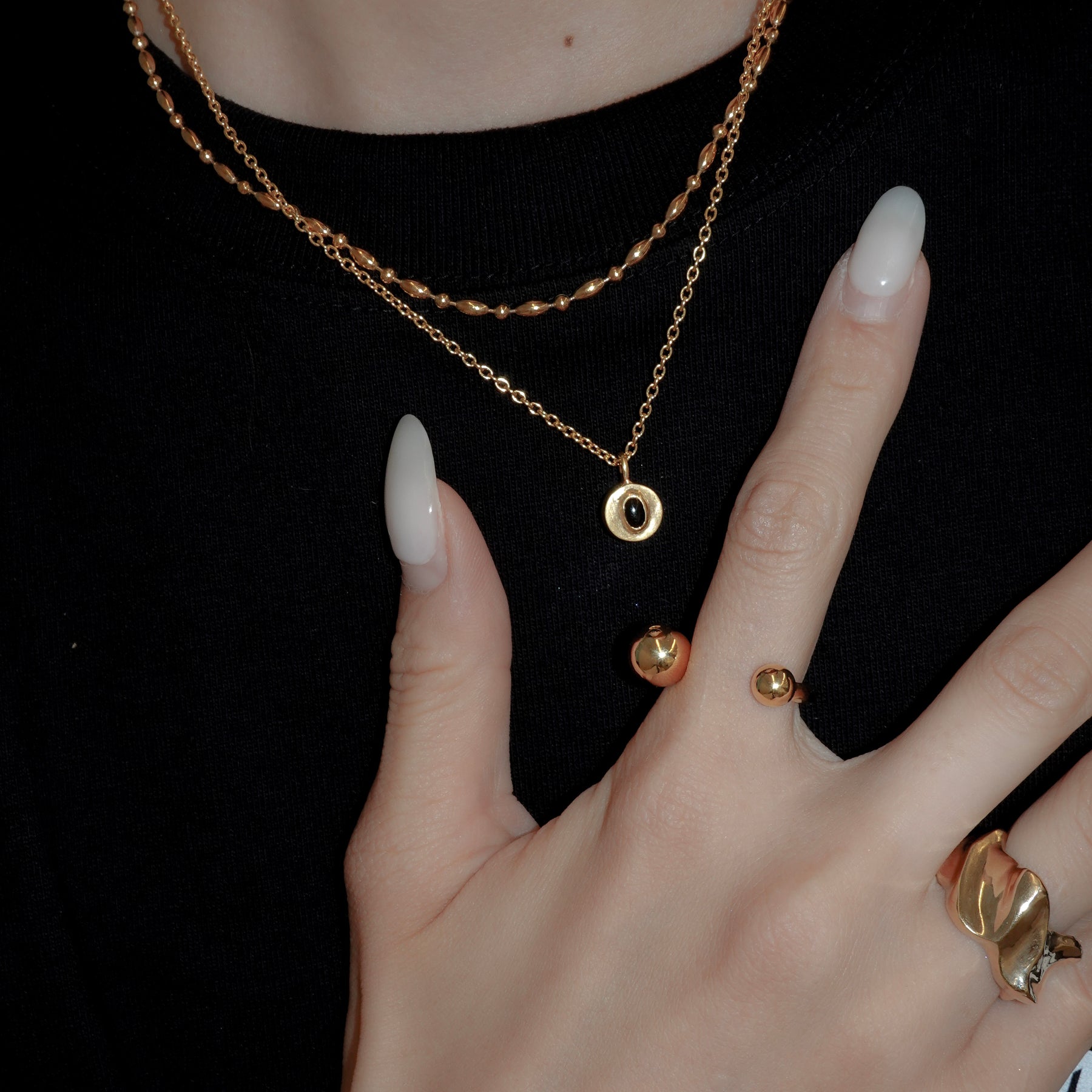 ストーンは引き締まった印象のマットなオニキス、動くたびにさりげないきらめきを放つ優しげな印象のグレームーンストーンの2種類。