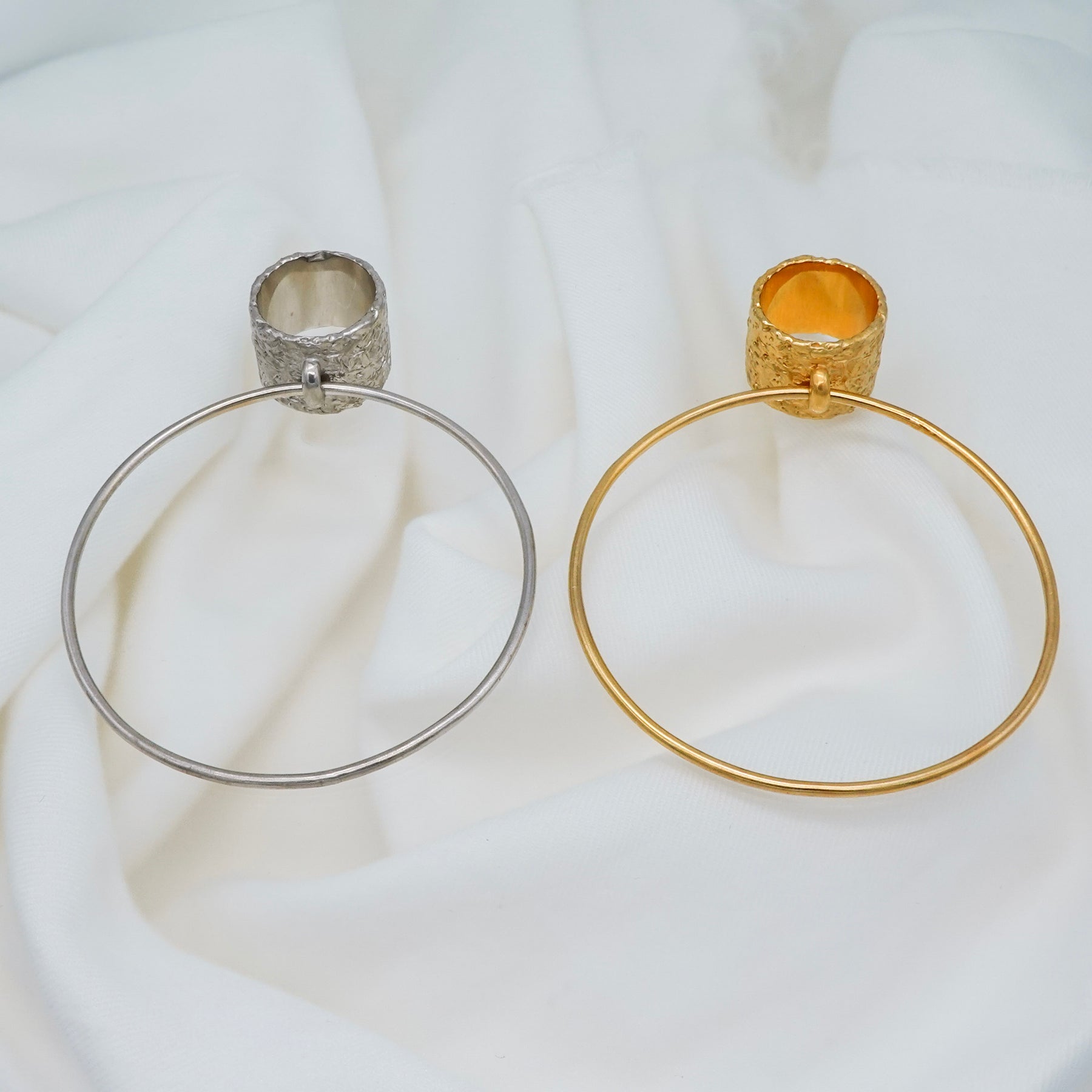 1本でインパクト抜群のフープが付いたリング。リング部分には凸凹のテクスチャがつけられており、華やかな装いにも負けず、シンプルなコーディネートを格上げしてくれます。