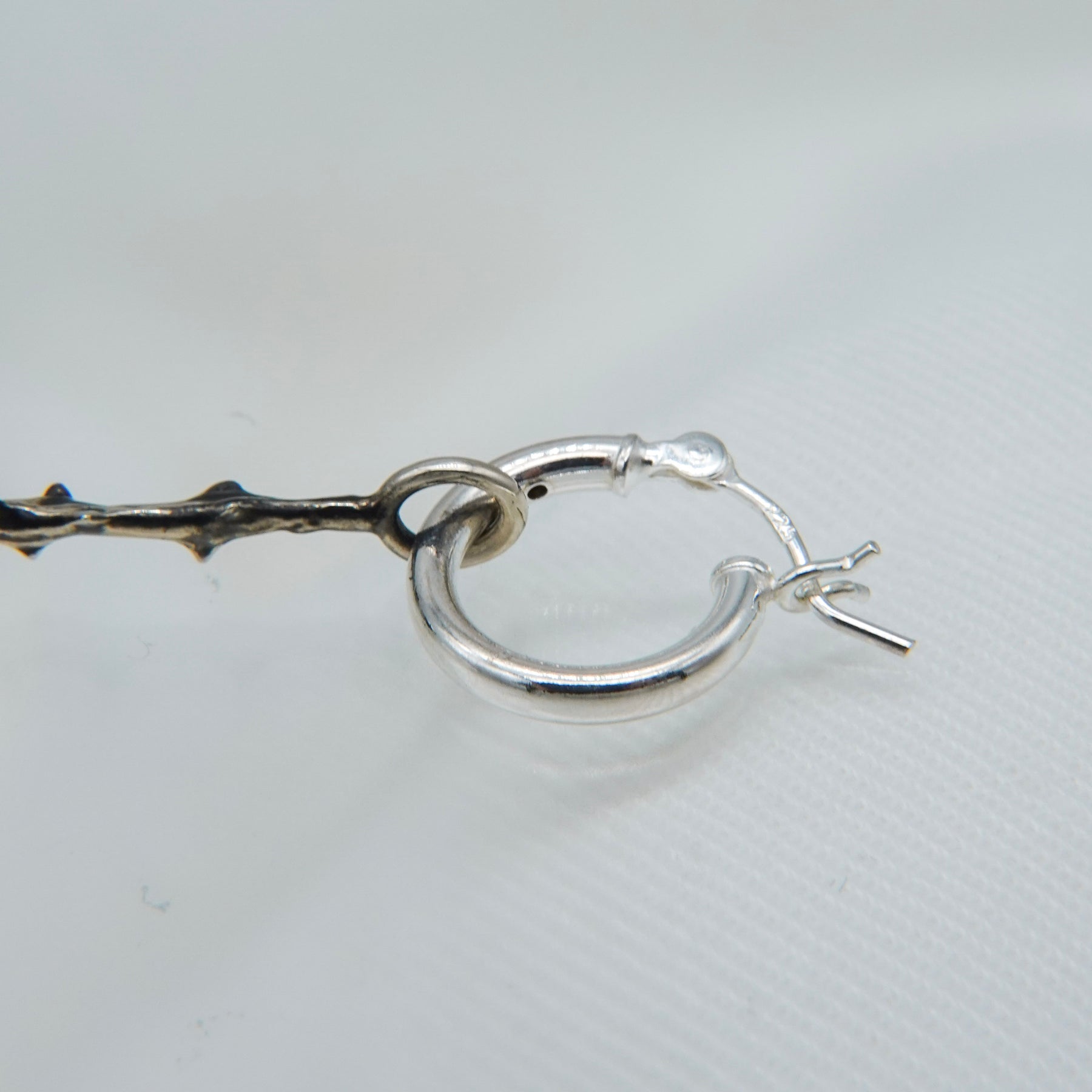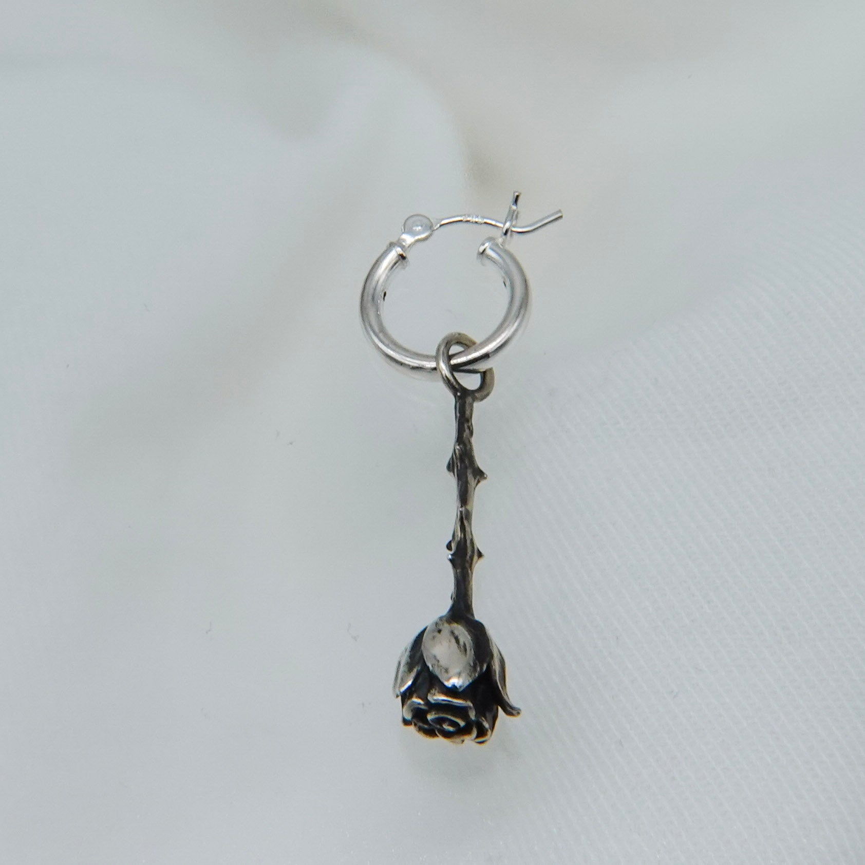 細部まで繊細に作れらた薔薇チャーム。揺れ動く薔薇チャームは、燻し加工と身につける人の動きで生まれる陰影と表情を楽しむことができます。薔薇のチャームと、フープピアスがセットになっており、取り外しが可能です。