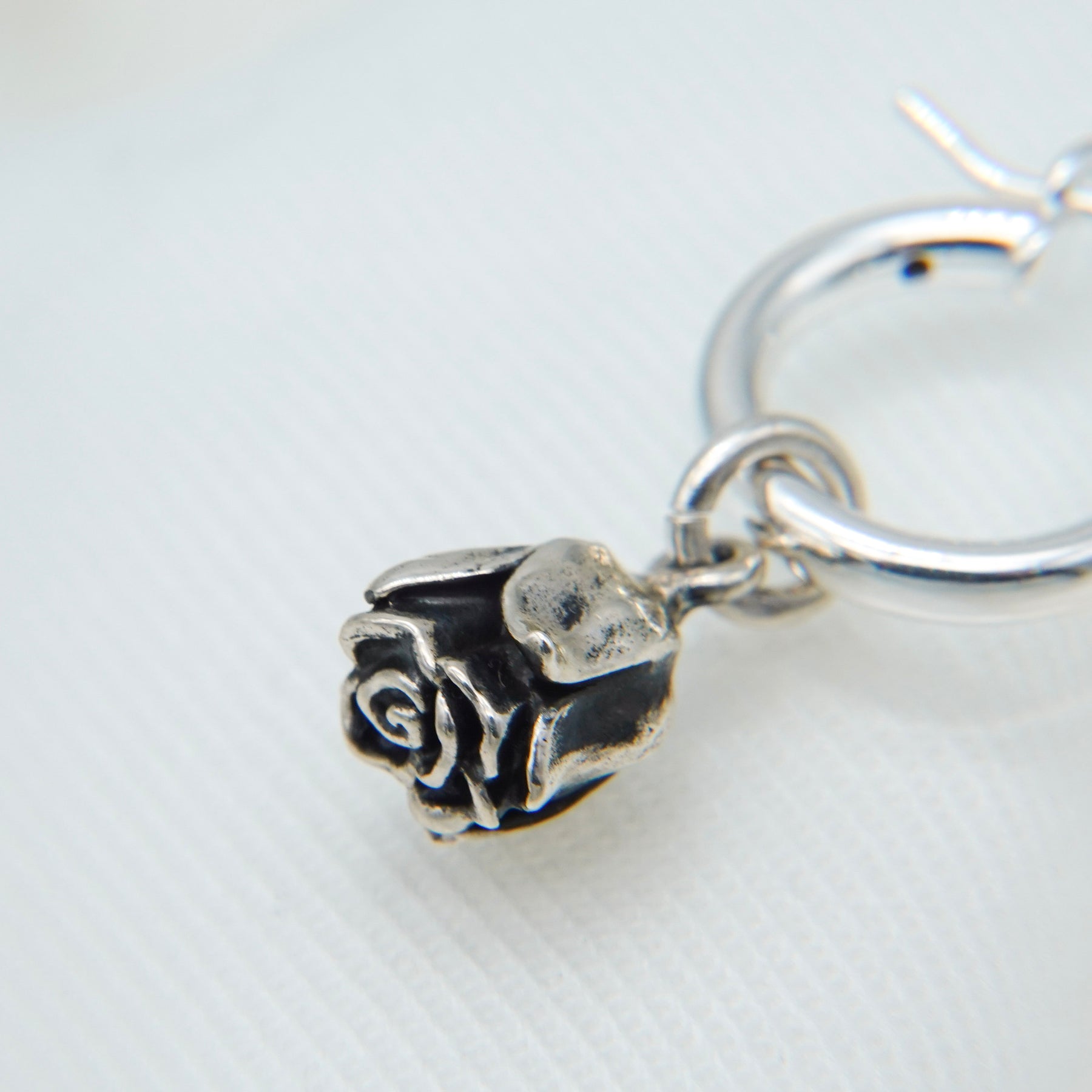 揺れ動く薔薇チャームは、燻し加工と身につける人の動きで生まれる陰影と表情を楽しむことができます。