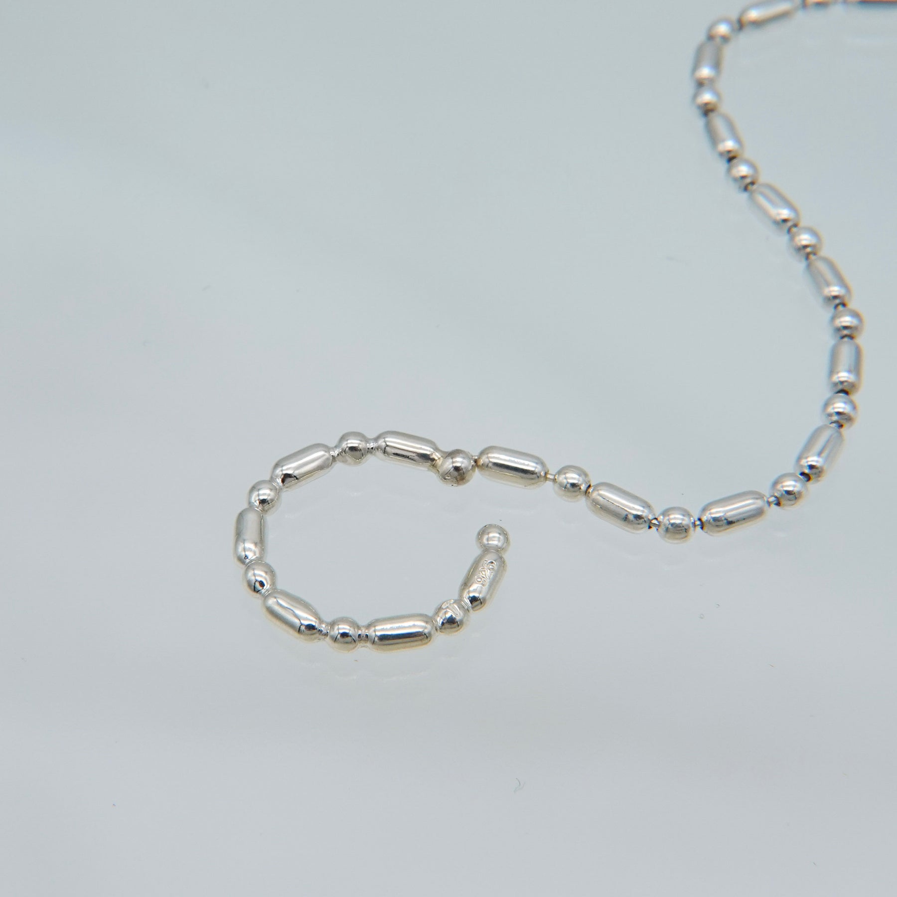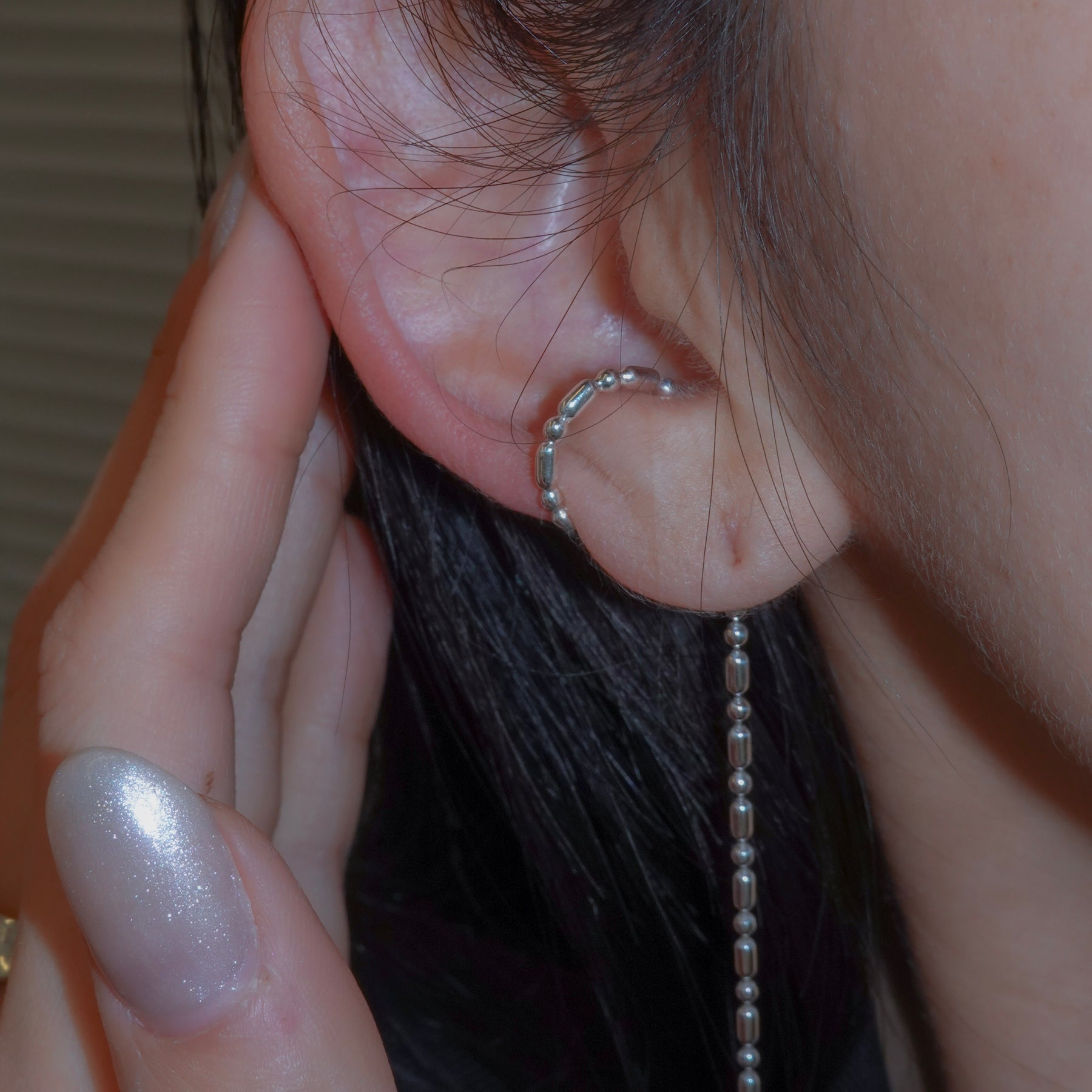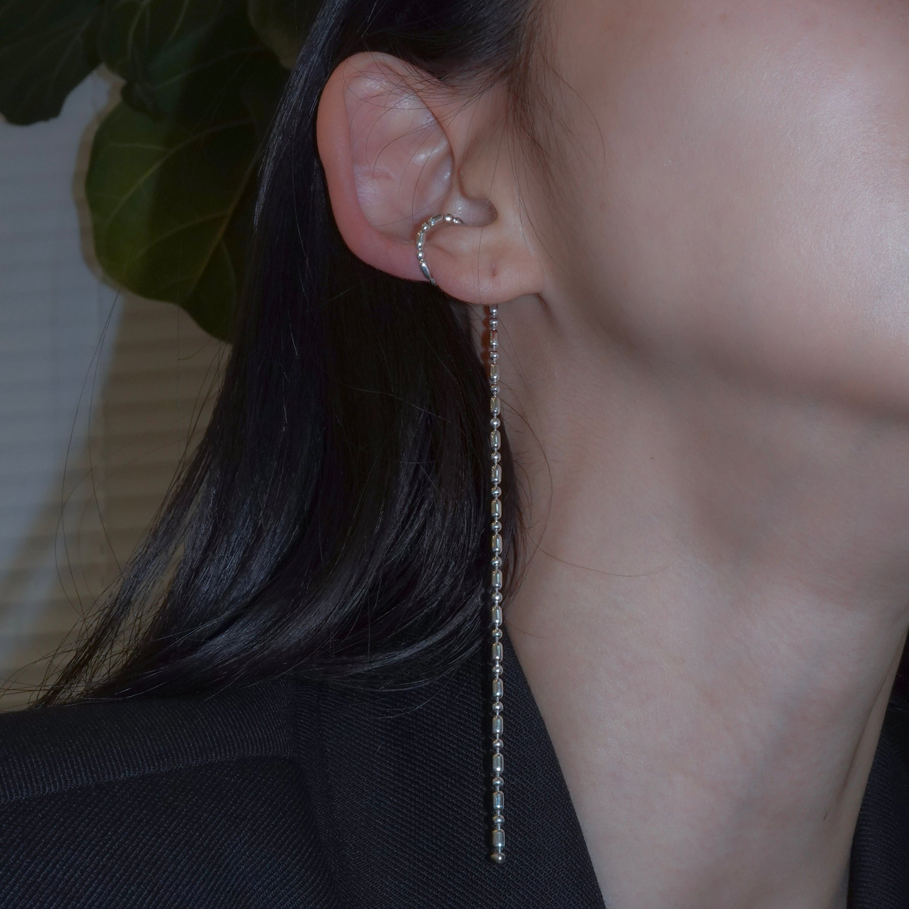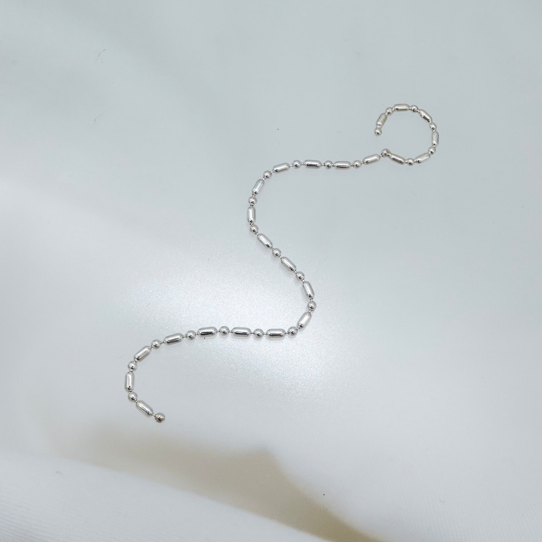耳の後ろから、静かに落ちる。丸と楕円が交互に連なるチェーンのイヤカフ。耳輪にかけるだけで、チェーンは耳の後ろへまっすぐに落ちていきます。無駄のないその動線が、すっきりとした印象をつくります。単体でミニマルに、重ね着けで変化をつけても。