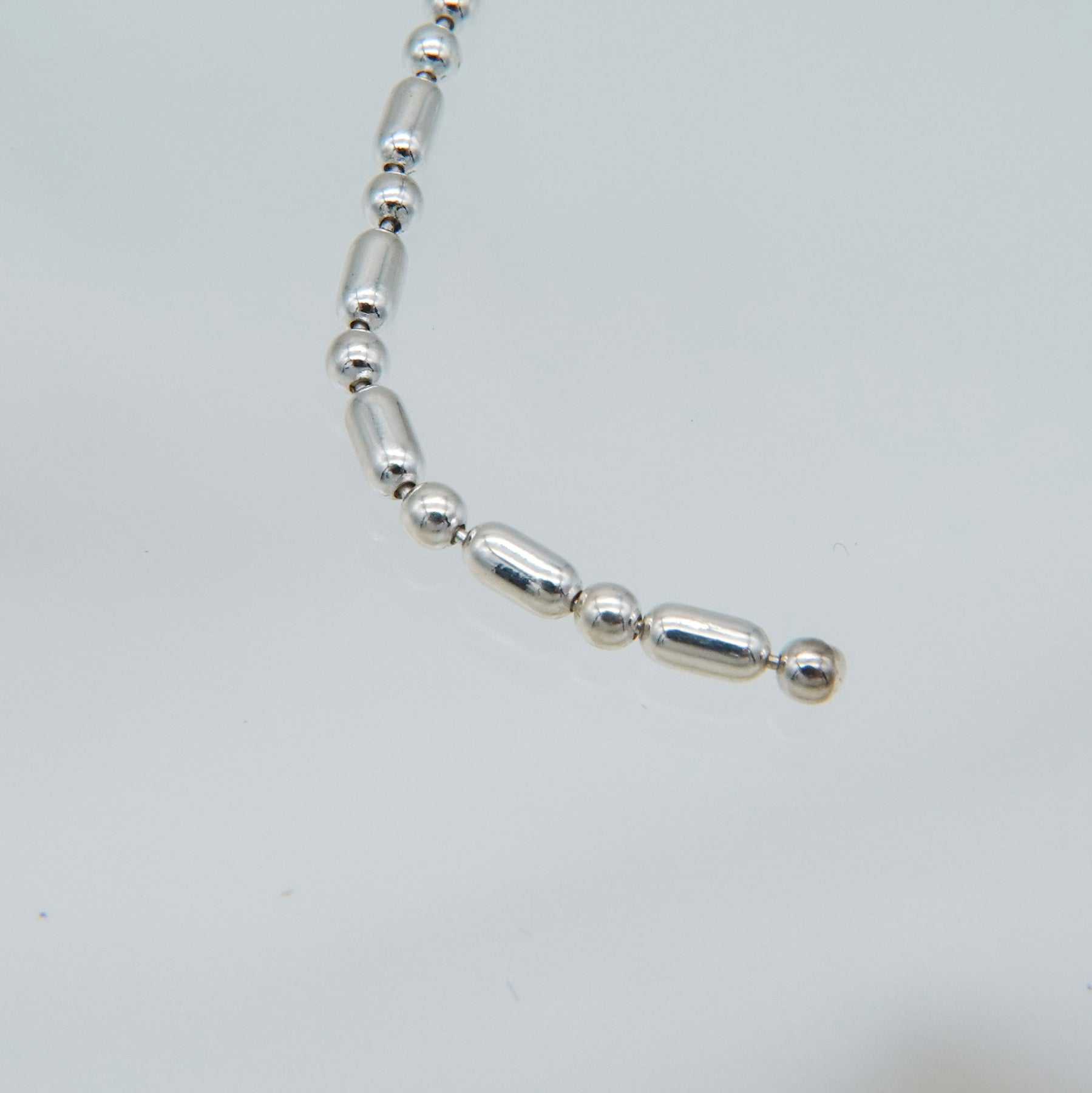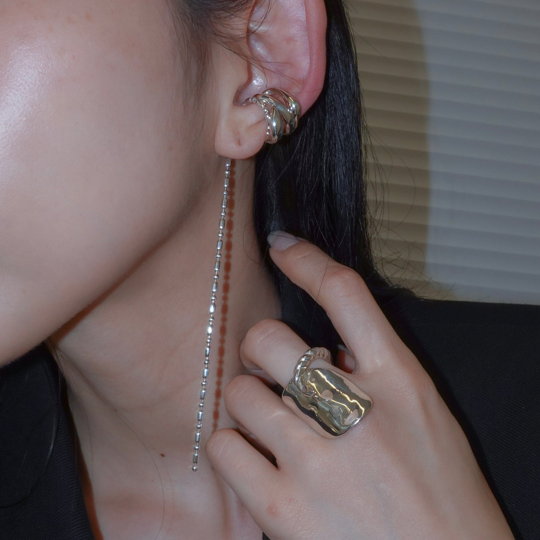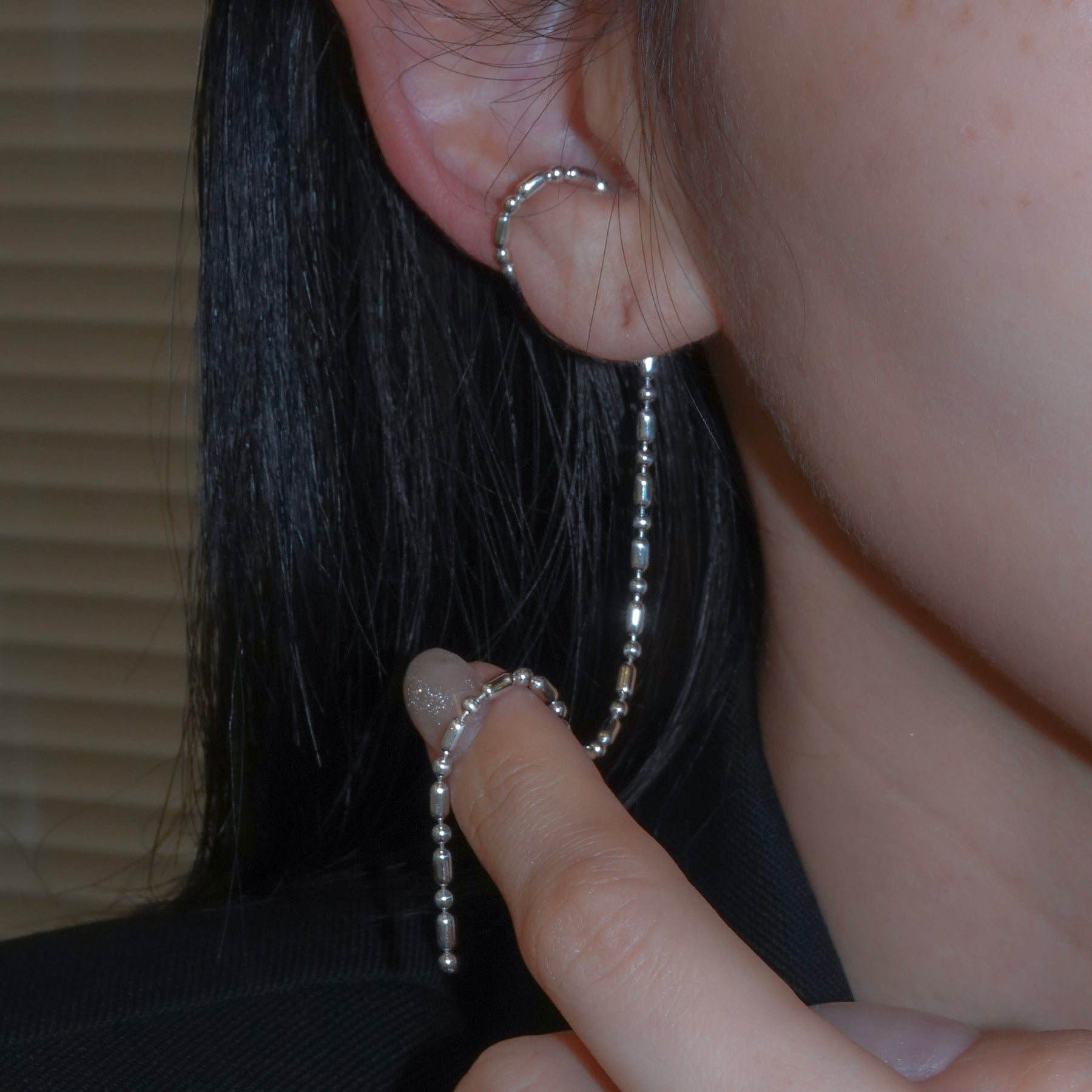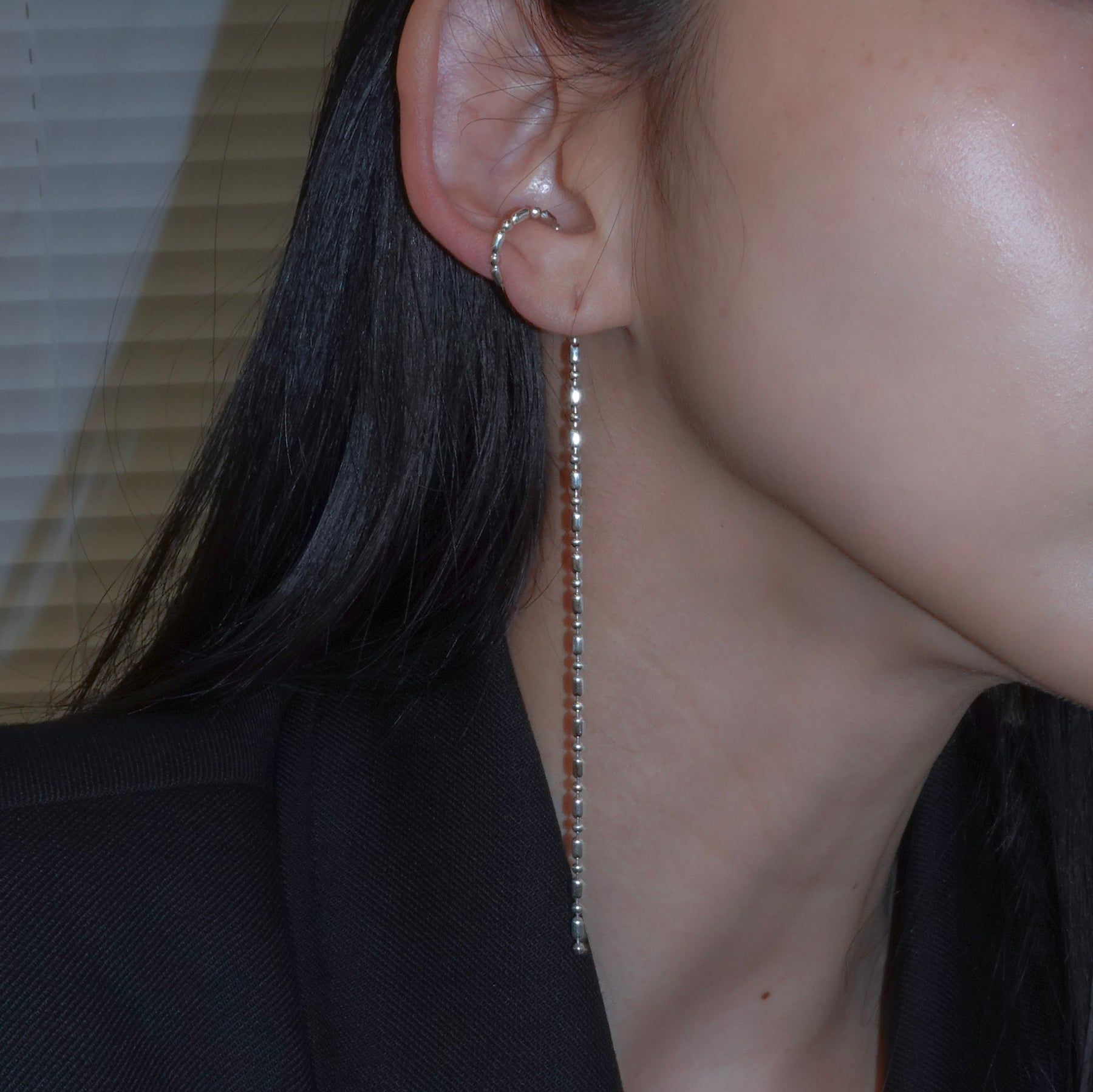 耳の後ろから、静かに落ちる。丸と楕円が交互に連なるチェーンのイヤカフ。耳輪にかけるだけで、チェーンは耳の後ろへまっすぐに落ちていきます。無駄のないその動線が、すっきりとした印象をつくります。単体でミニマルに、重ね着けで変化をつけても。
