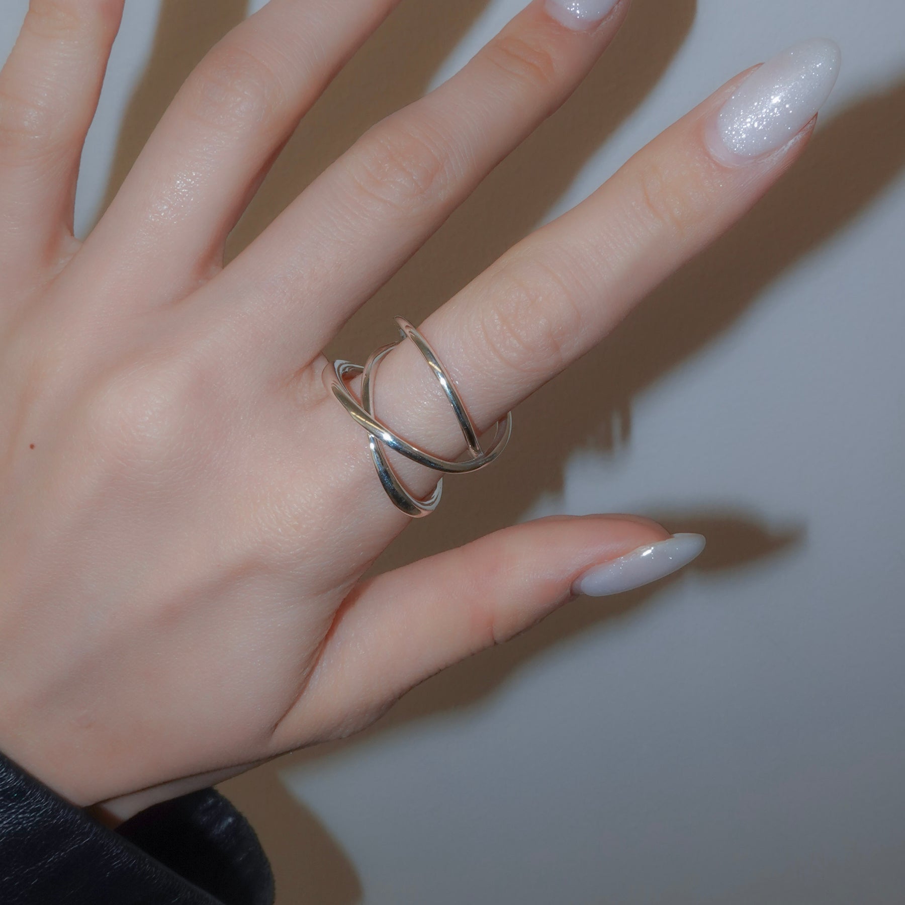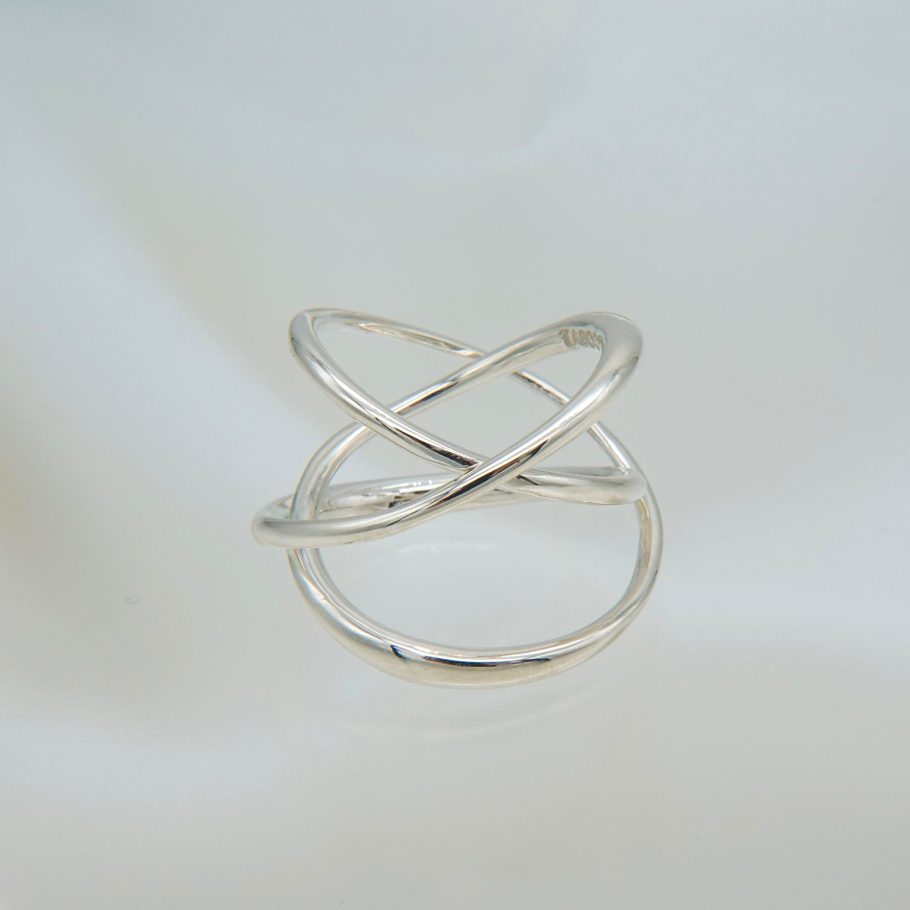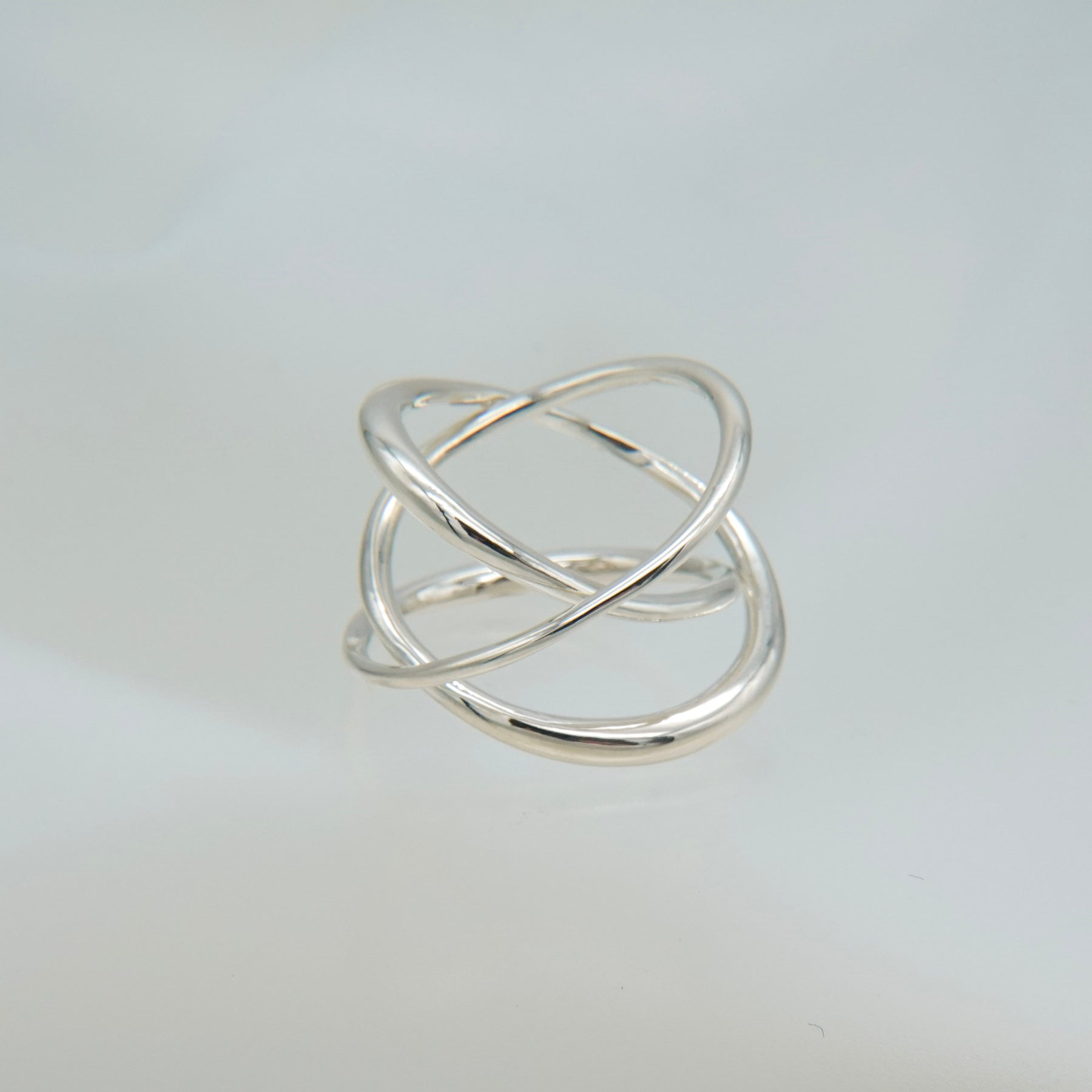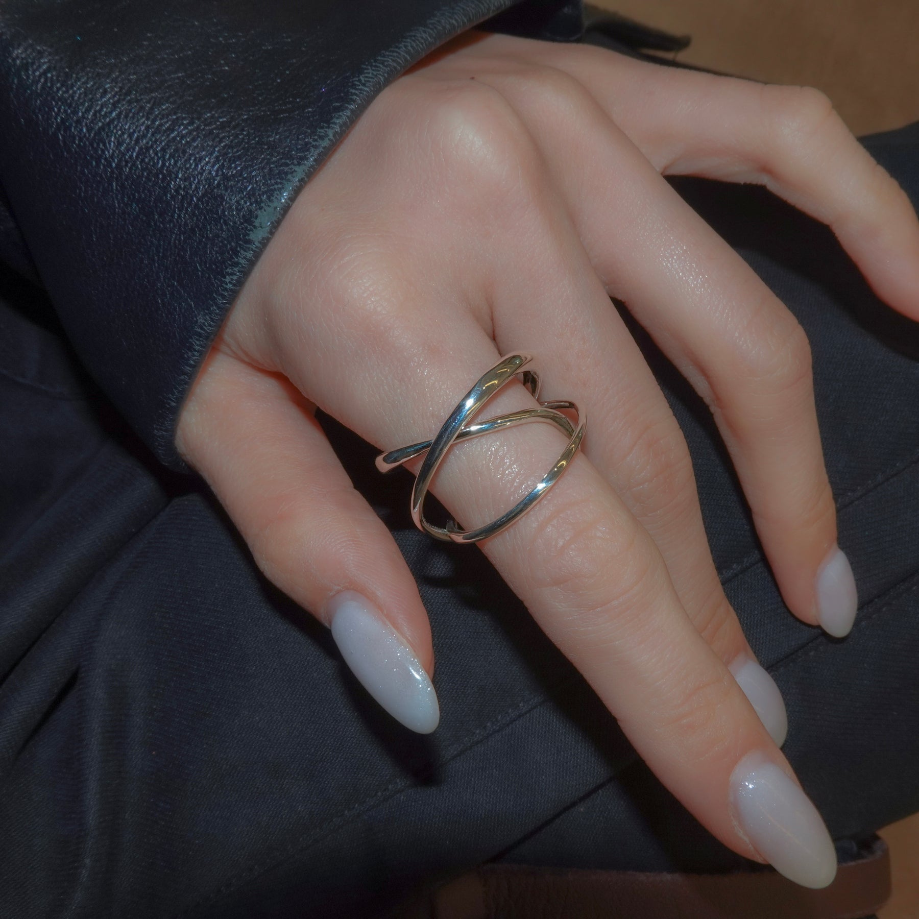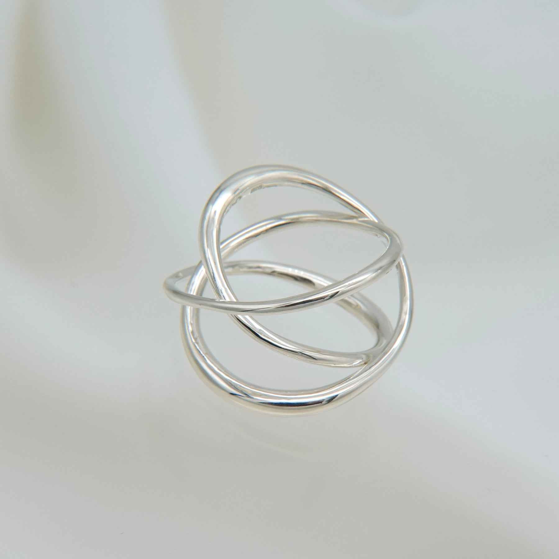 複数のラインが交差しながら軌道を描く、立体的なボリュームのリングです。
