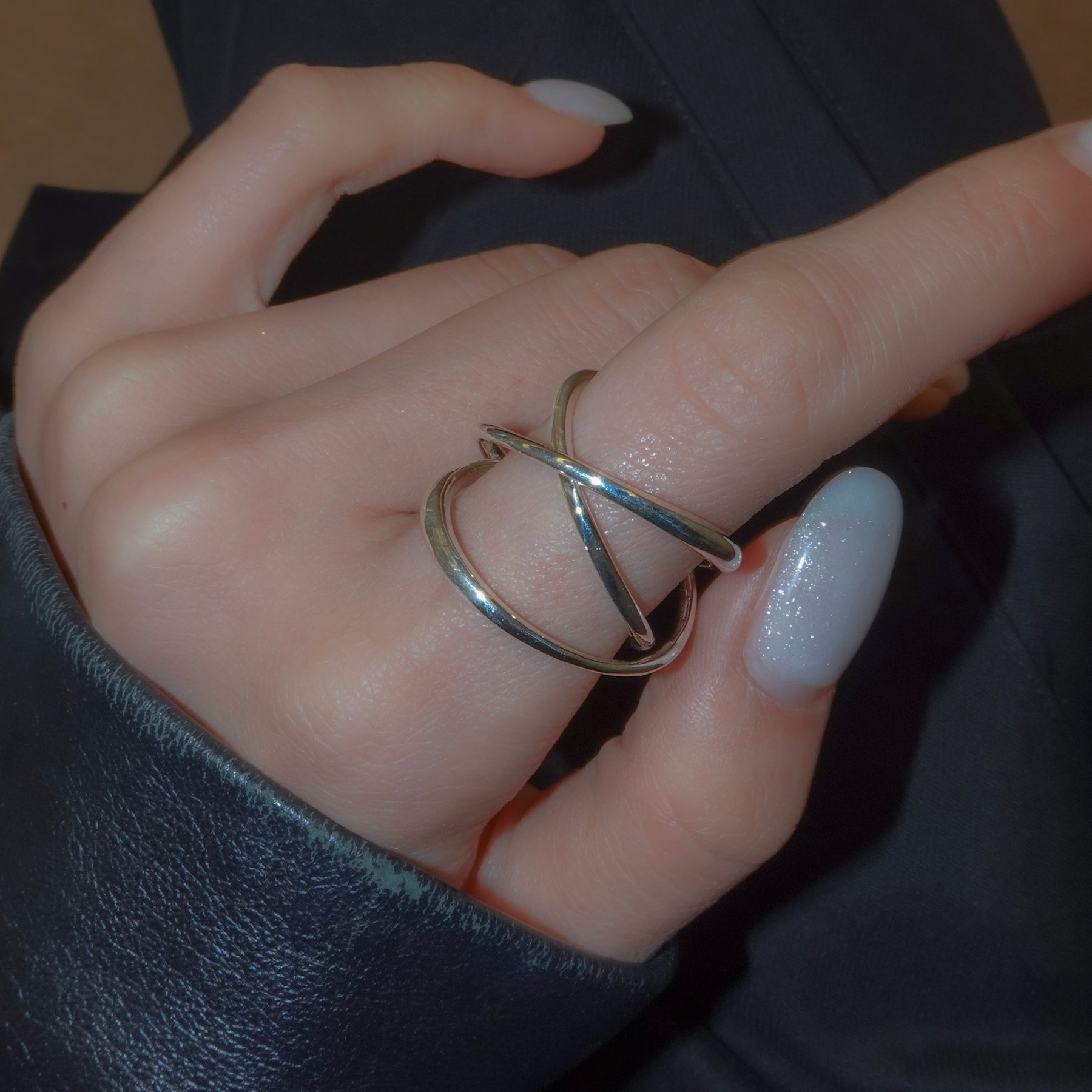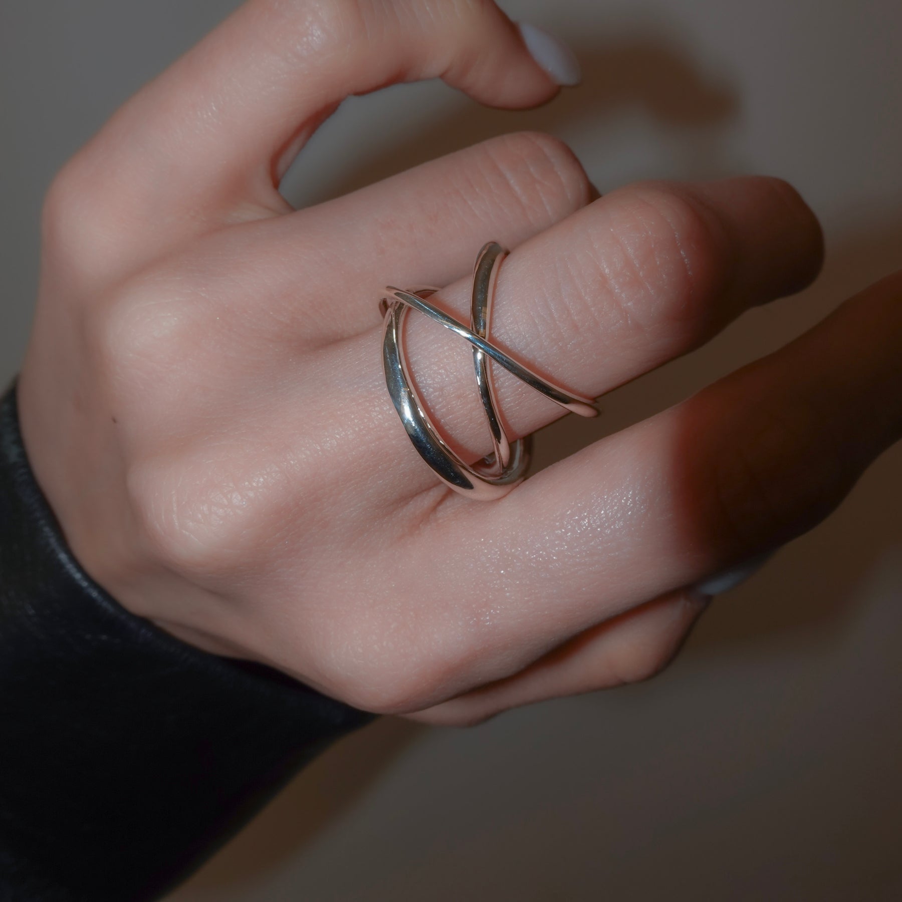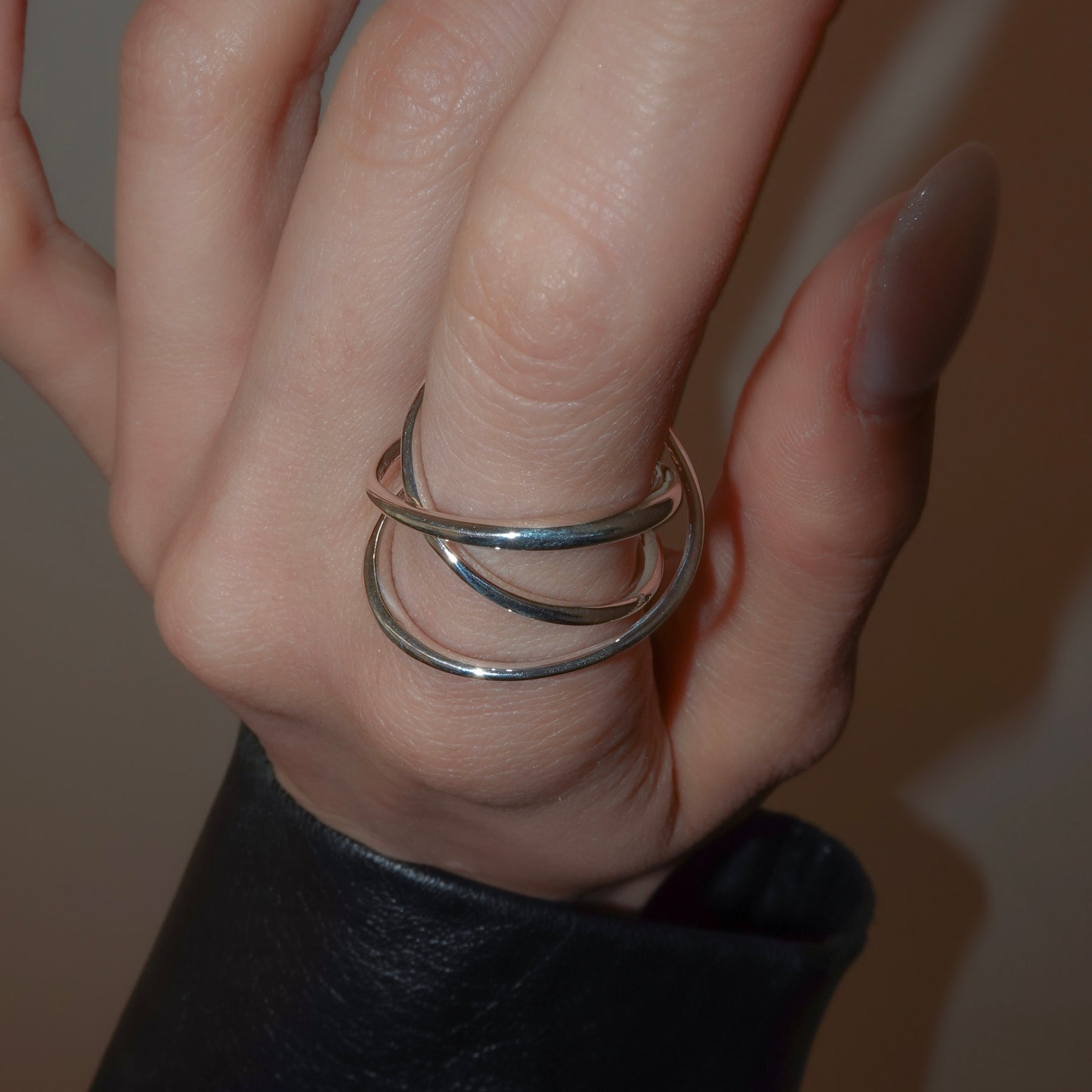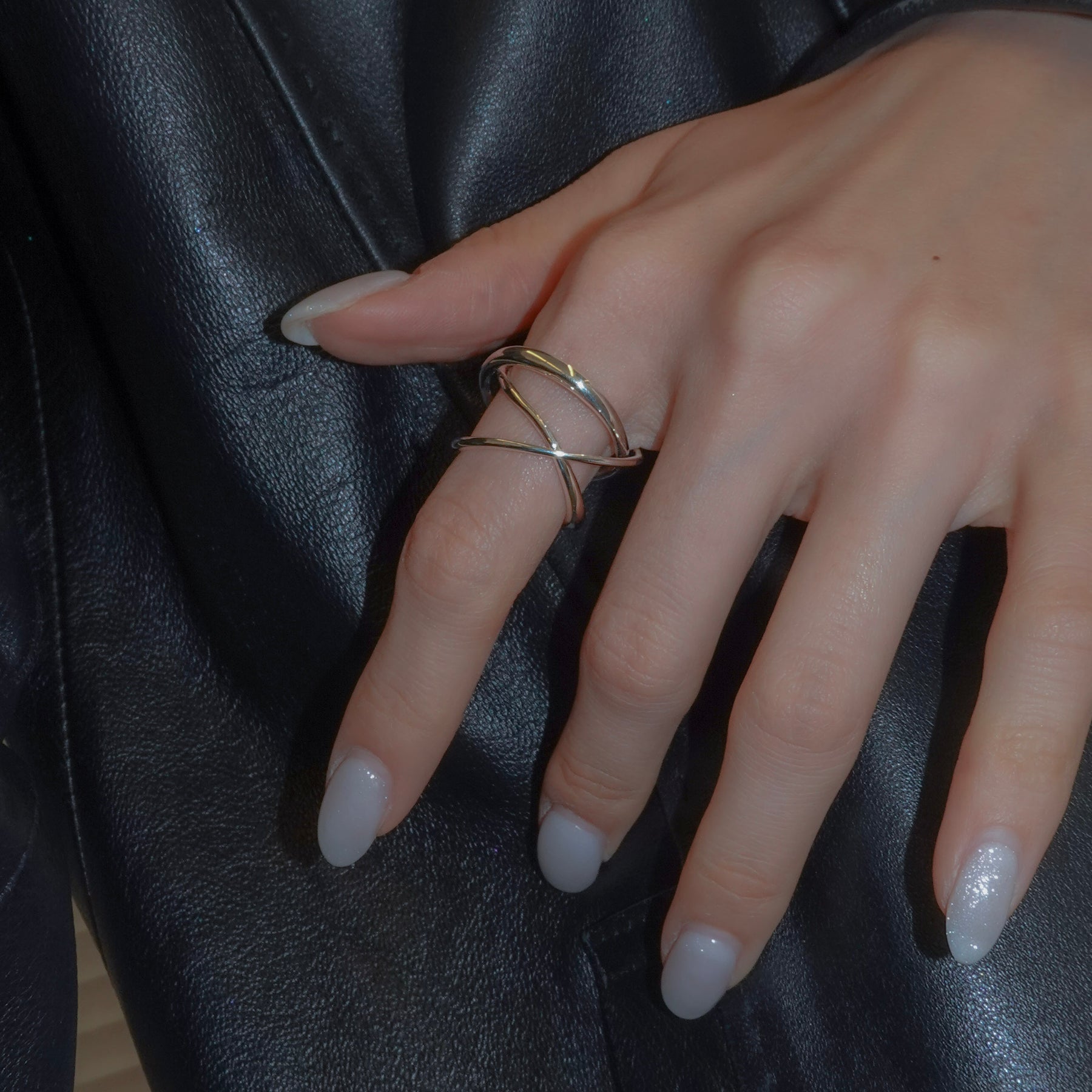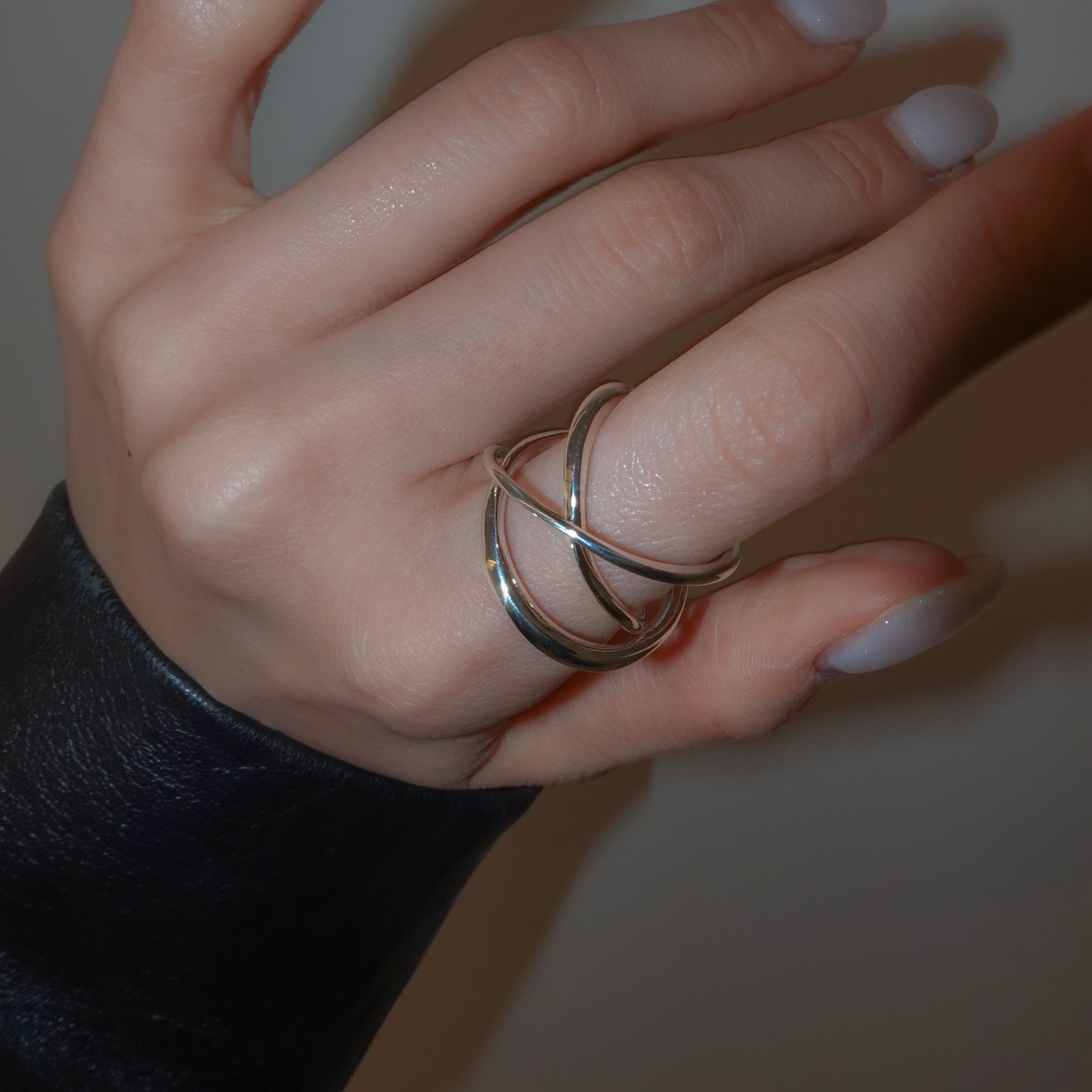 複数のラインが交差しながら軌道を描く、立体的なボリュームのリングです。