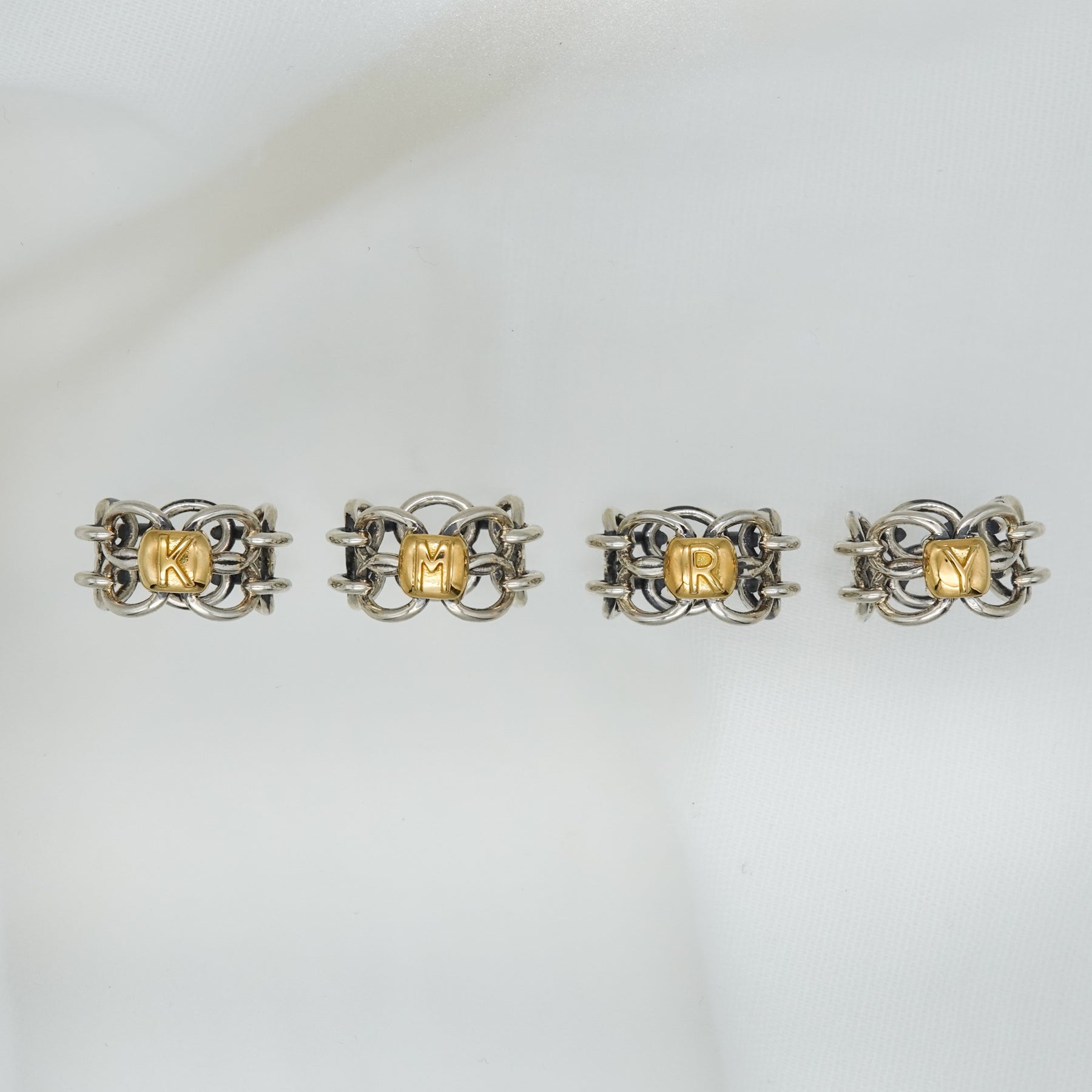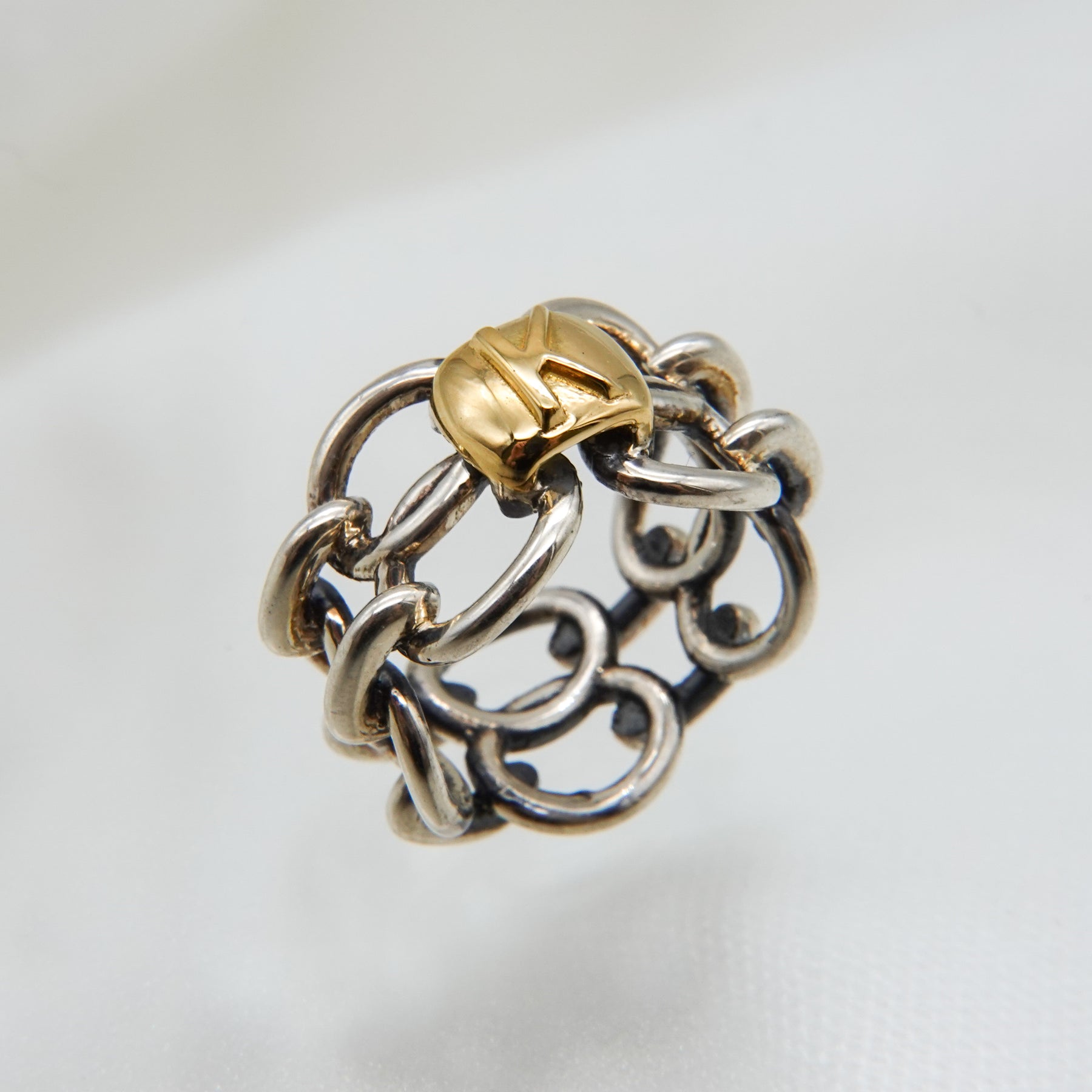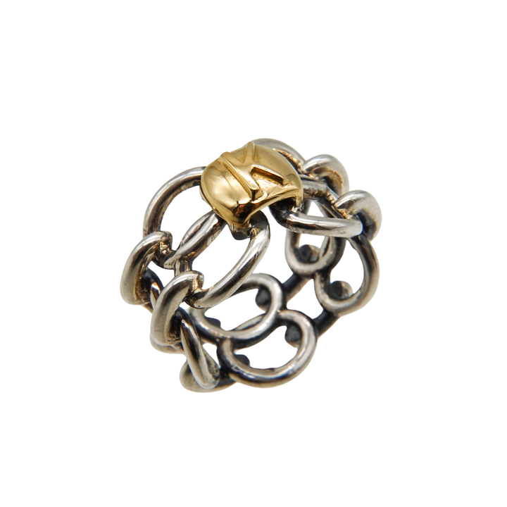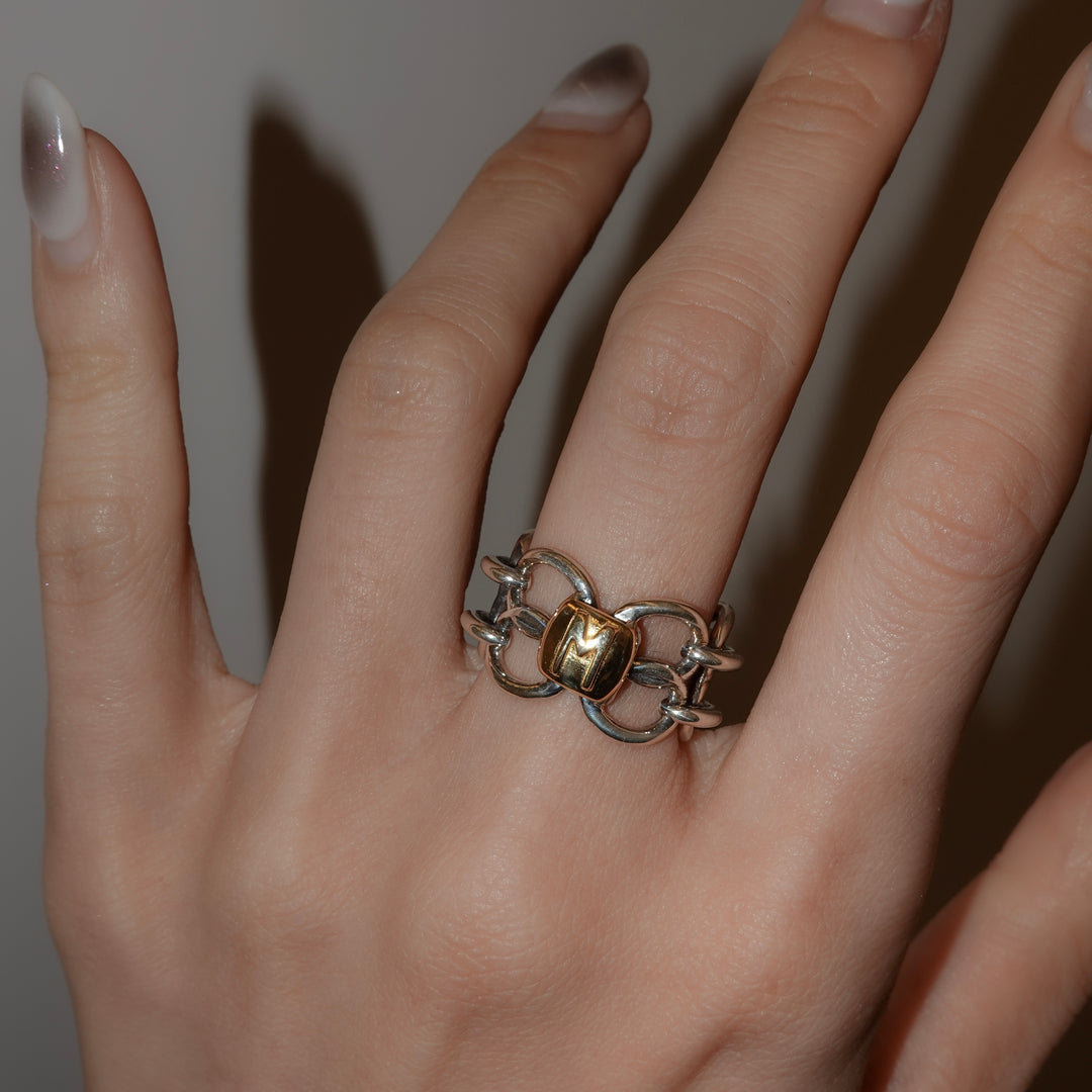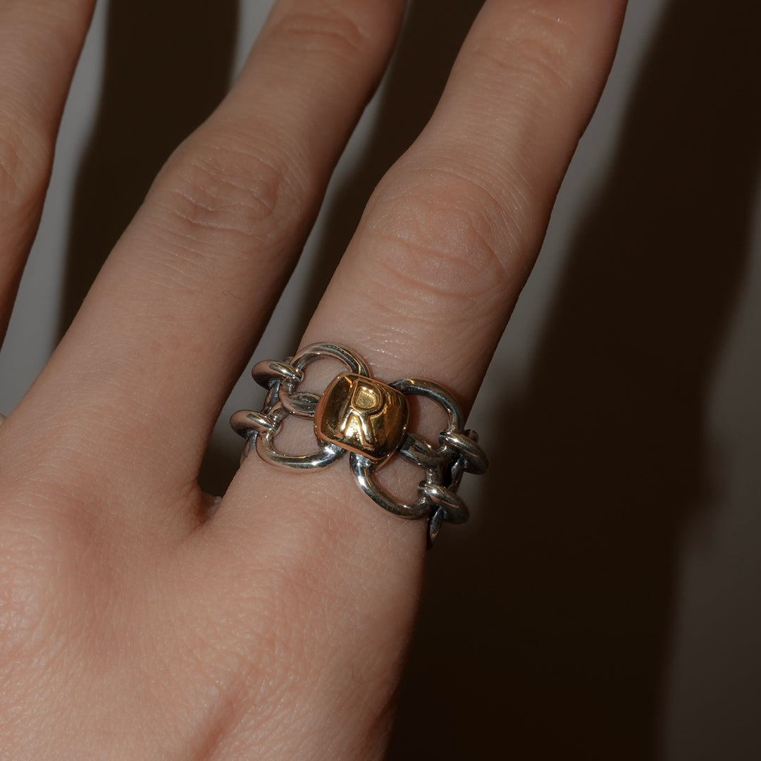 イニシャルを選んでカスタマイズできるチェーンリング。ご自身はもちろん、大切な人のイニシャルでも。燻し加工を施してあり、何とも言えないヴィンテージな風合いです。ボリュームがあり、1つ身に着けるだけで手元が洗練された印象となります。