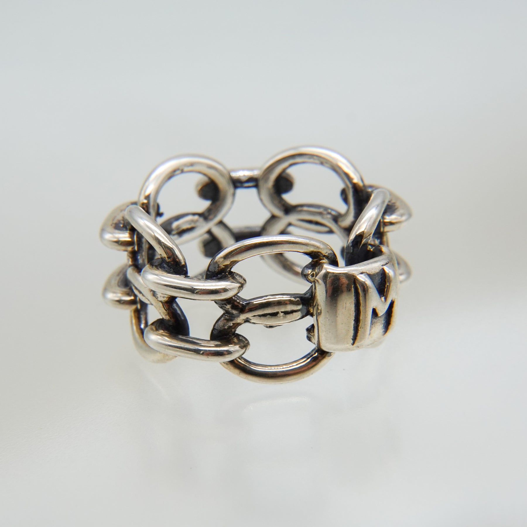 イニシャルプレートとのカスタマイズが可能なチェーンリング。ご自身はもちろん、大切な人のイニシャルでも。燻し加工を施してあり、何とも言えないヴィンテージな風合いです。ボリュームがあり、1つ身に着けるだけで手元が洗練された印象となります。ピンキーリングサイズもおすすめです。