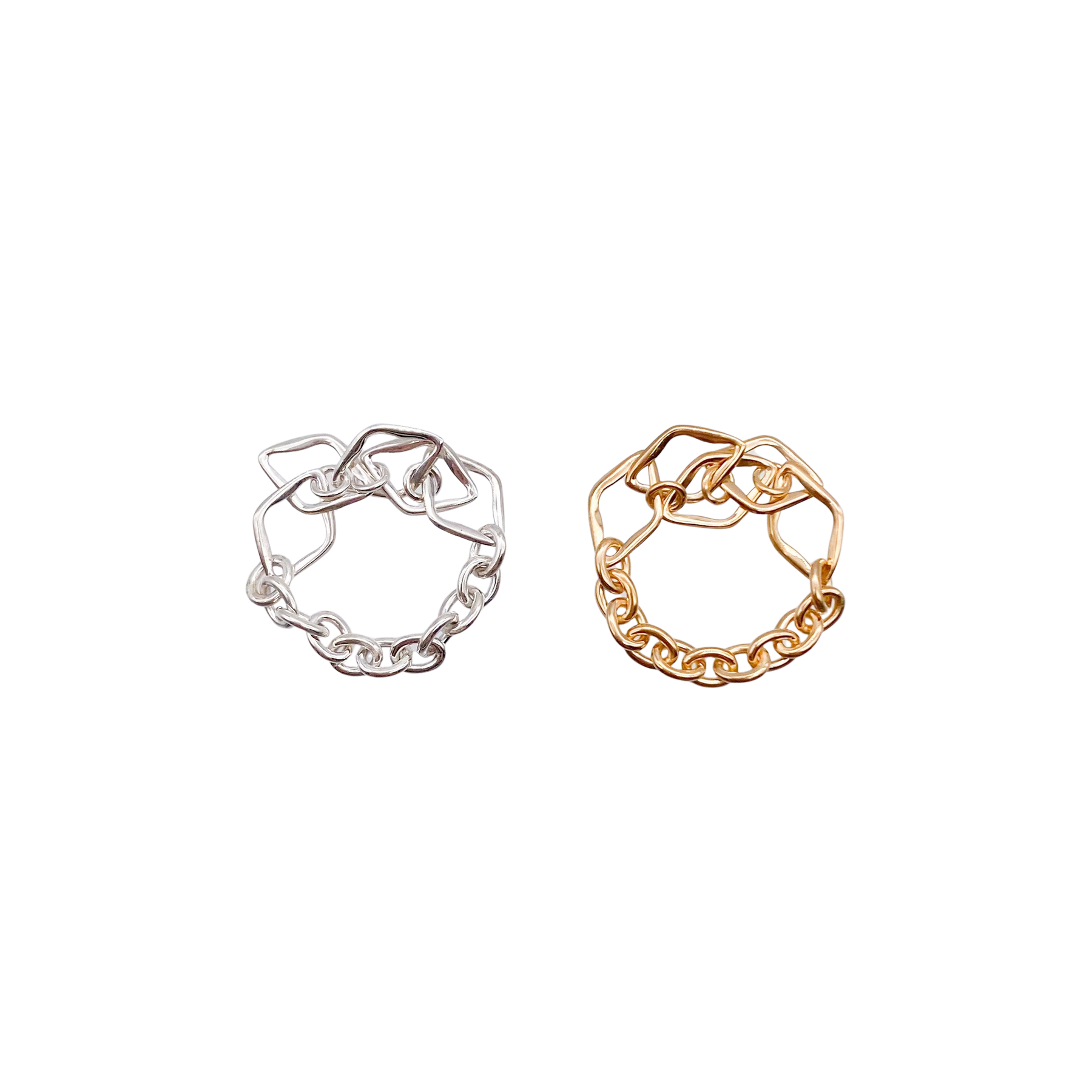 複雑に組み上げたひし形のパーツが印象的なリング。ひし型部分のエッジ感を丸カンで繋ぐ事で立体感が生まれ、他にはない個性を演出してくれます。 リング腕部分はストレスフリーなシンプルチェーン。