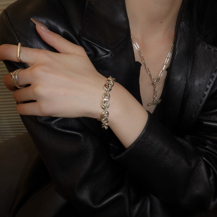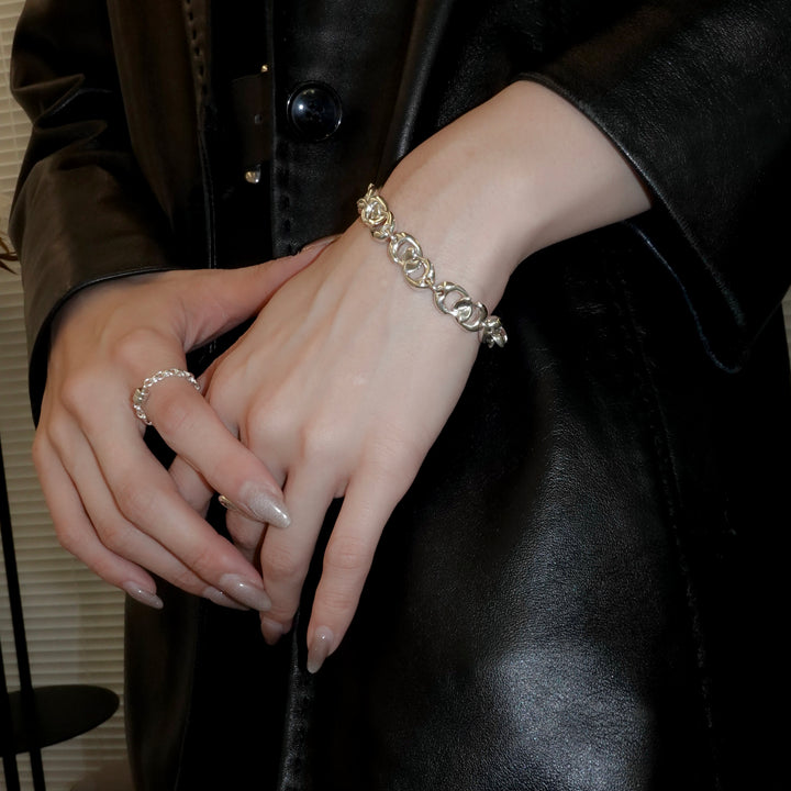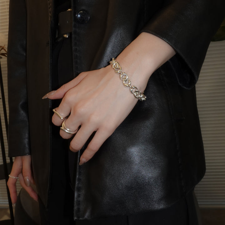 LISOO オリジナルのパーツを一つ一つ丁寧に組み合わせたブレスレット。程よいボリューム感があり、コマの内寸を狭めることでミニマルな印象です。表面、側面、裏面でデザインの見え方が変わるのもポイント。