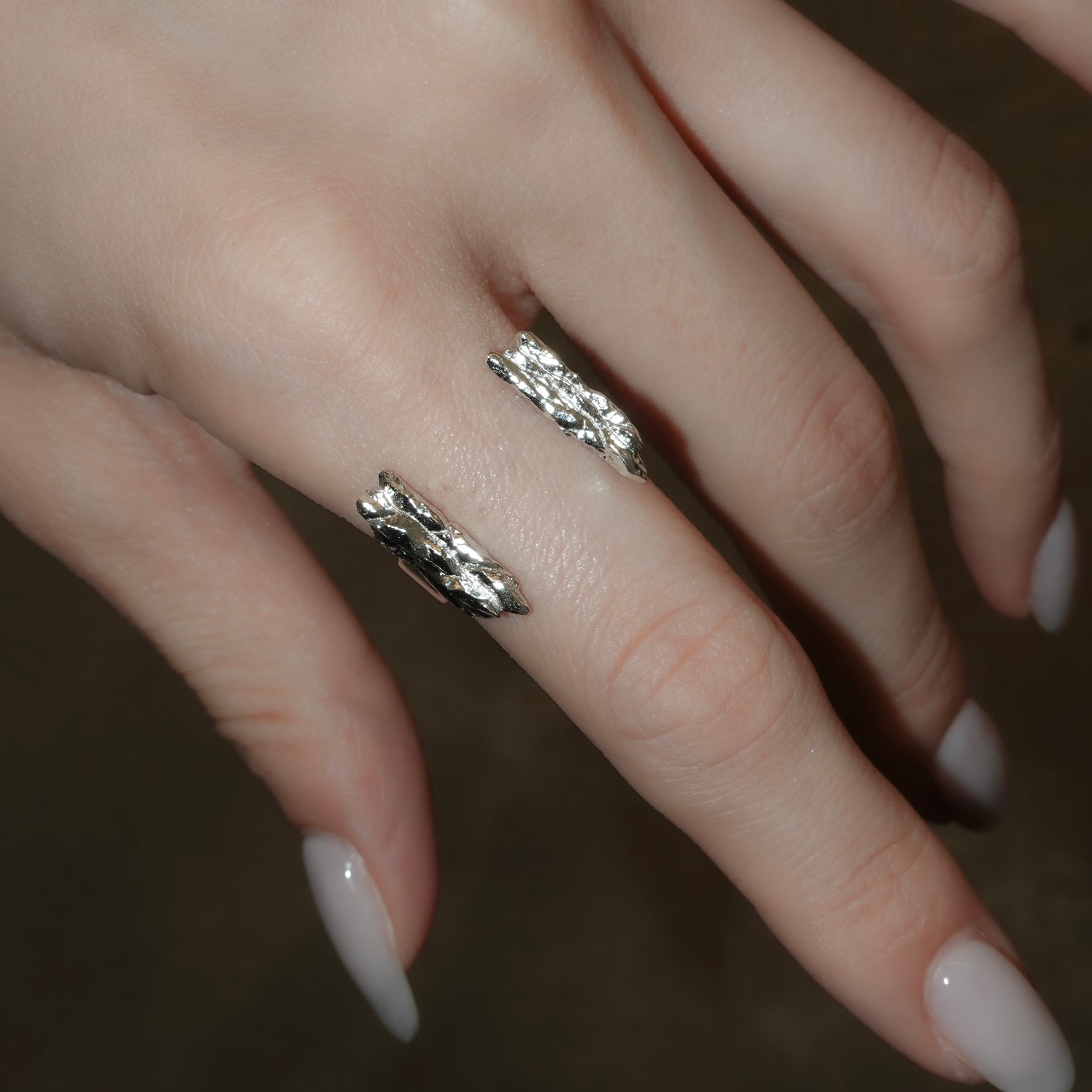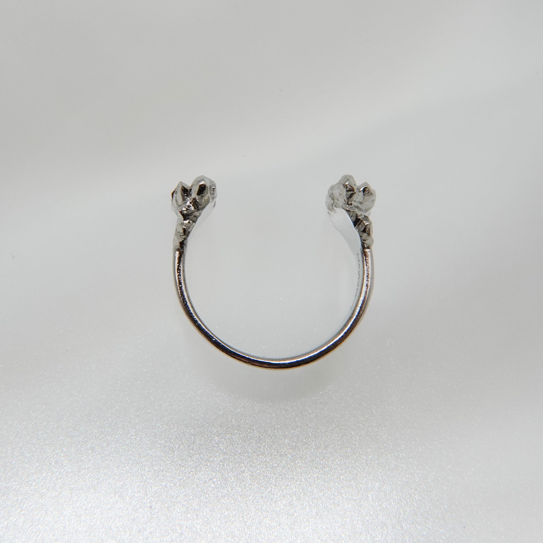 着用するとフラットなリング部分が隠れ、指と指の間に崖だけが見えるようになります。