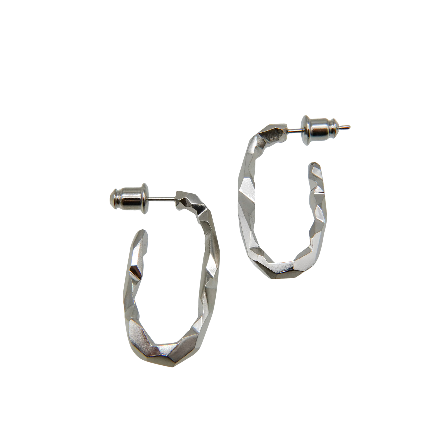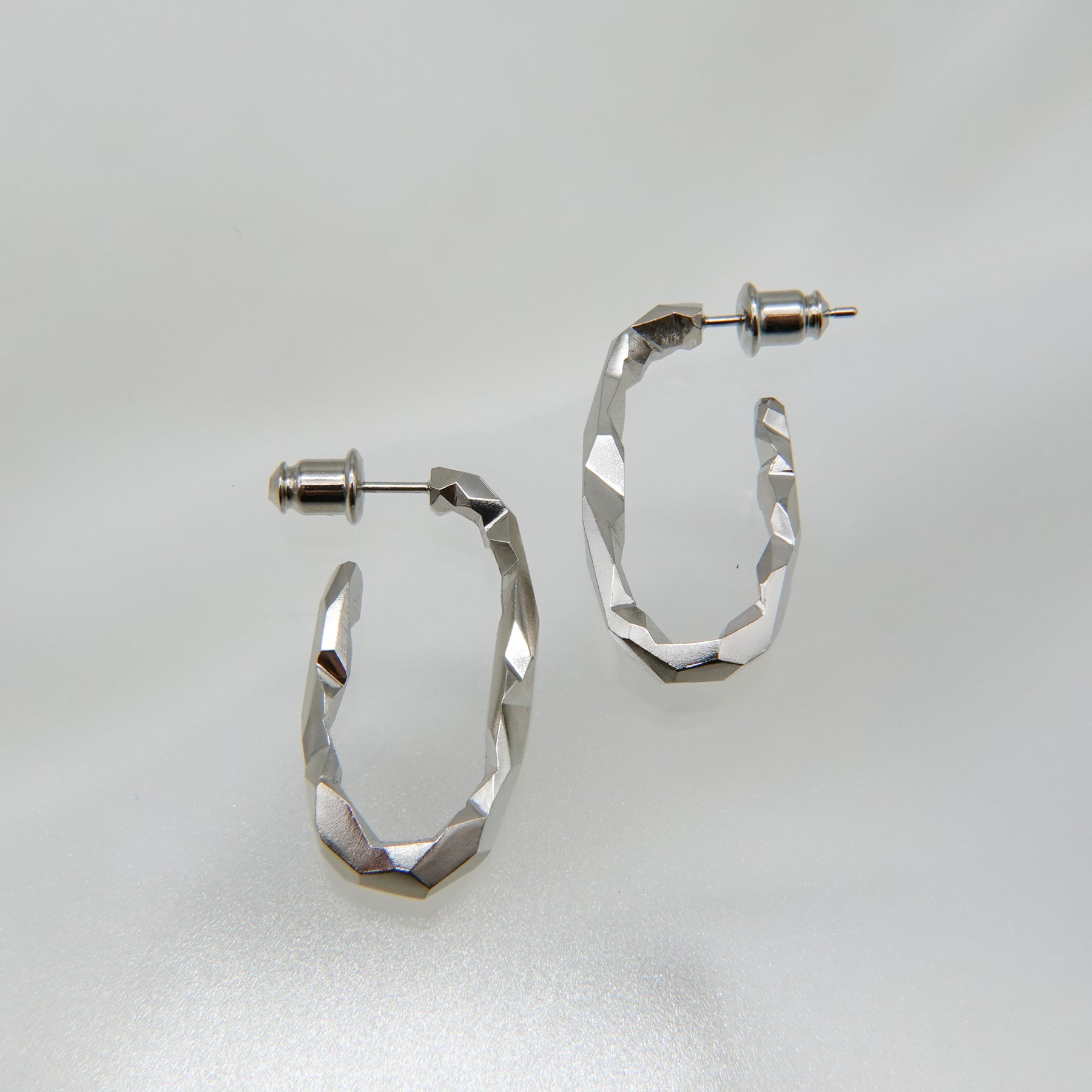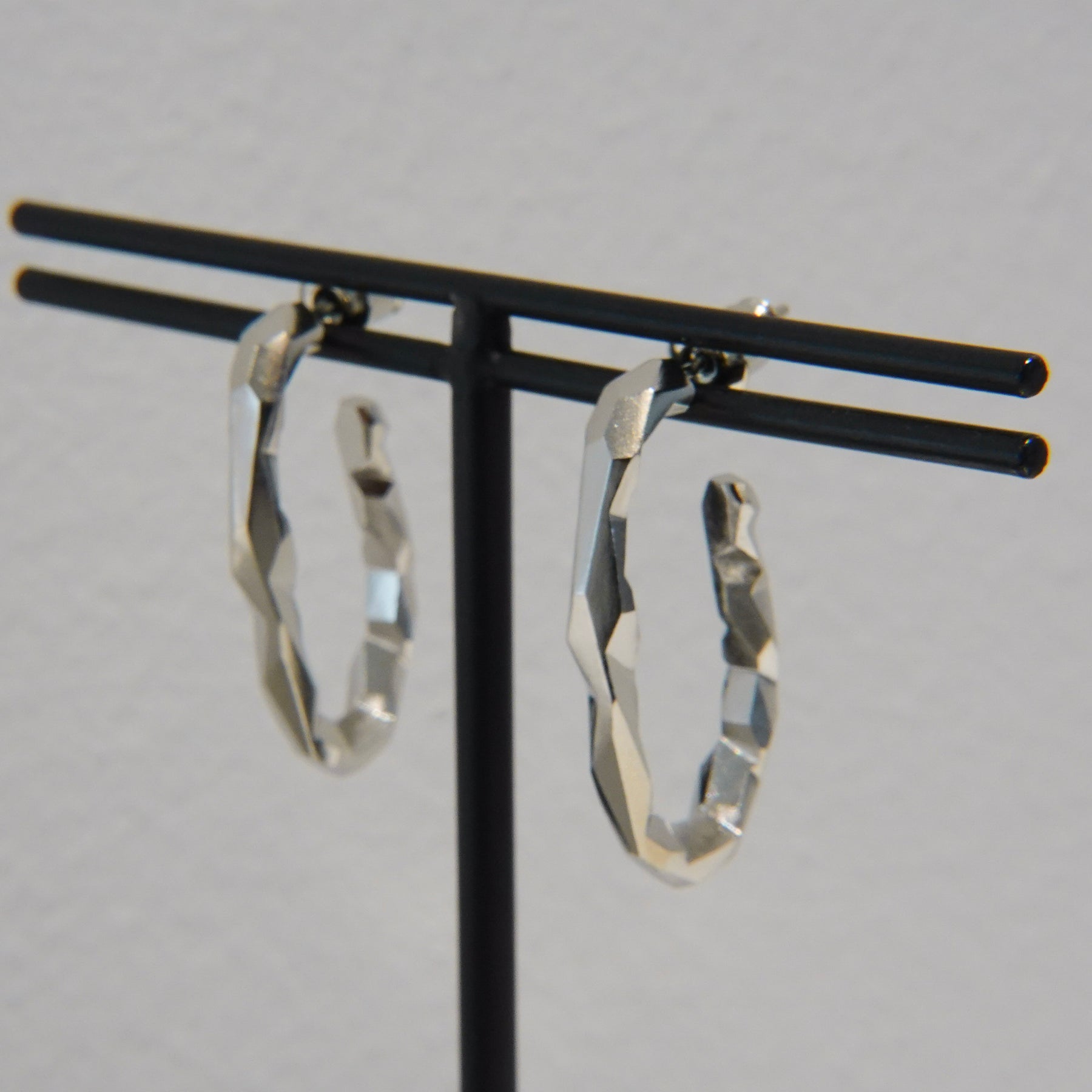 複雑な面で構成されたピアス。光をパキパキと反射し、程よい揺れ感があるサイズです。