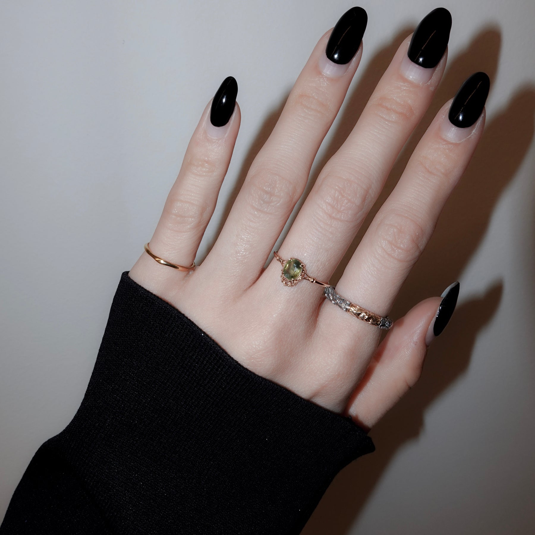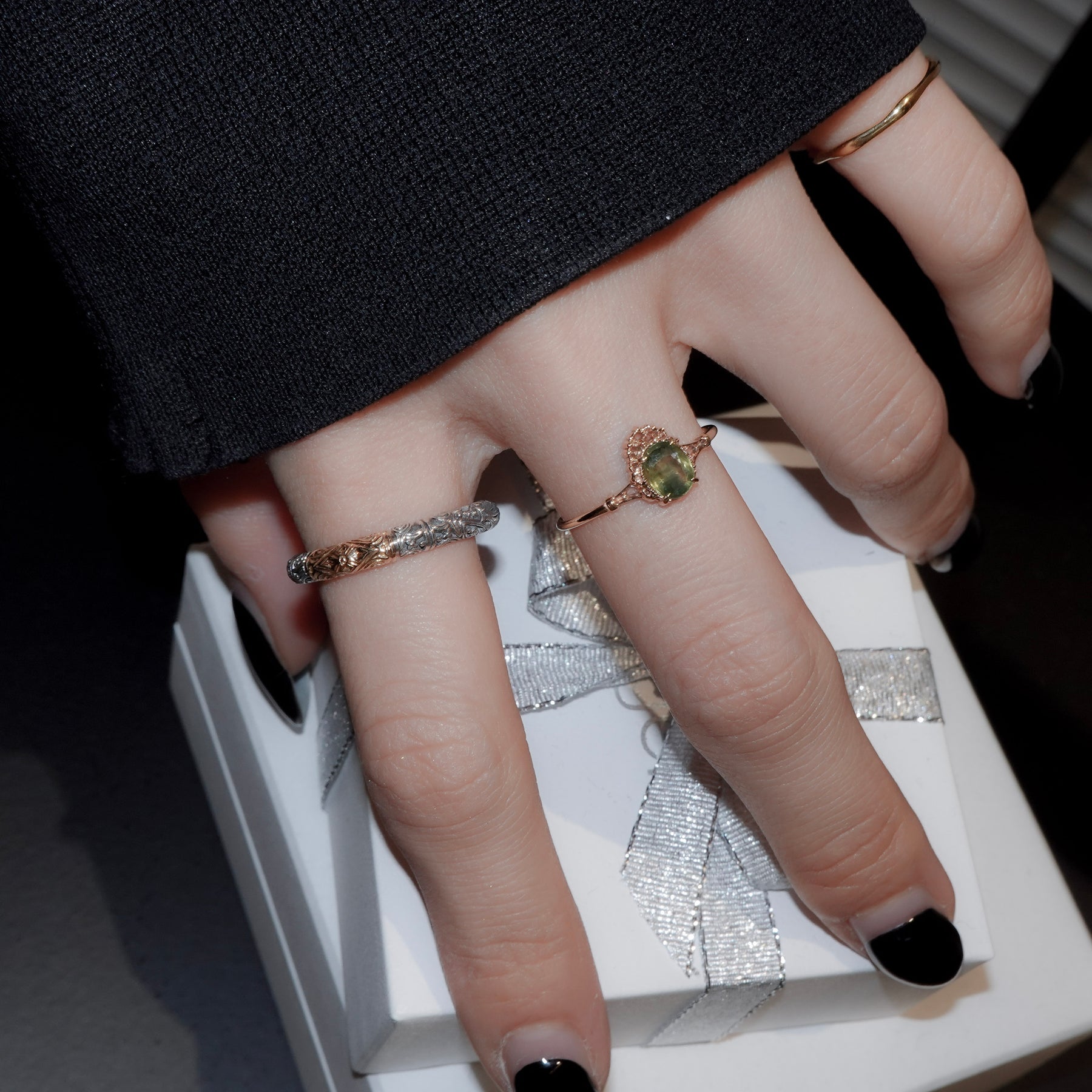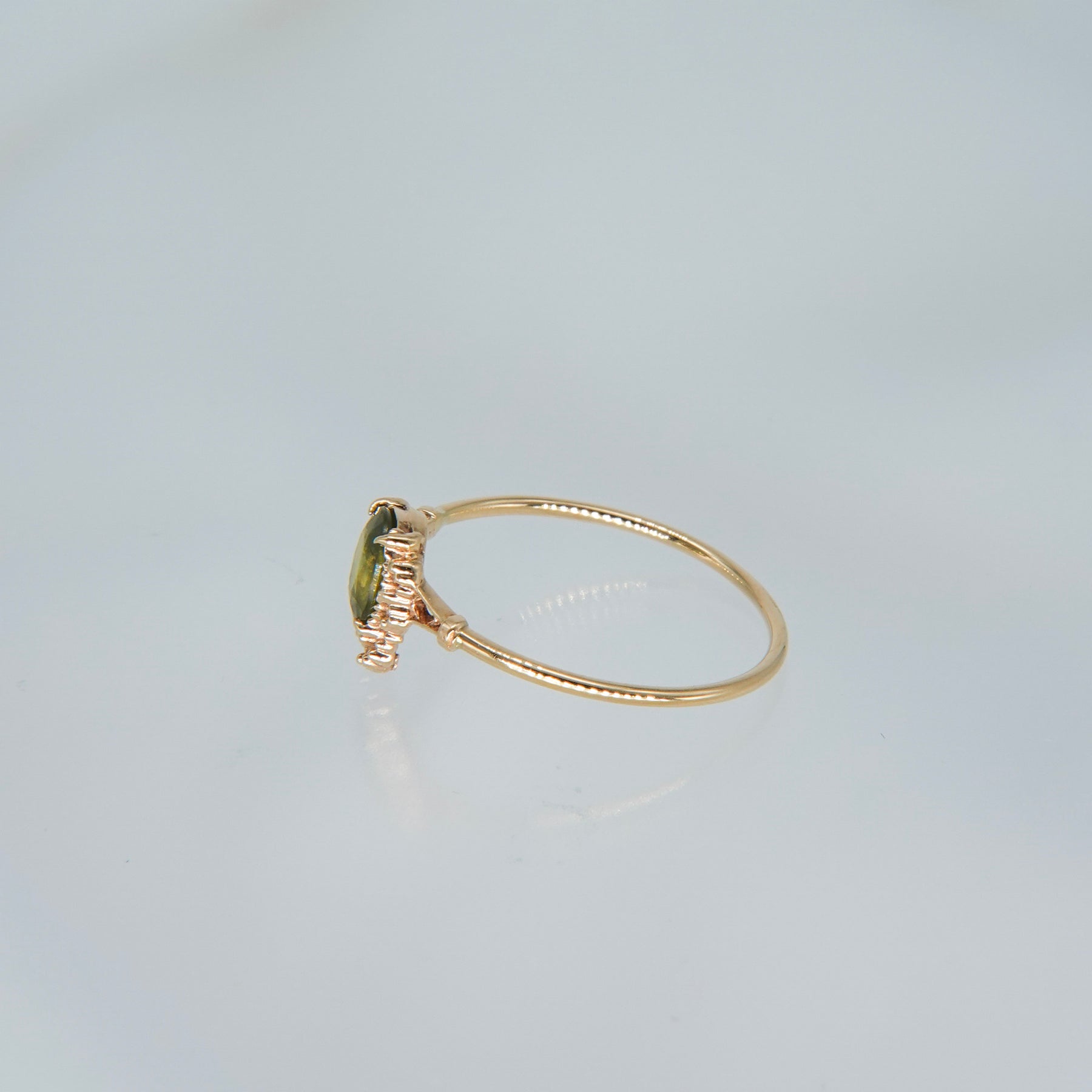 リングアームは1mm幅のゴールド。装飾を抑えたプレーンな仕上げがストーンの存在感を引き立て、手元にすっきりとした品格を添えます。