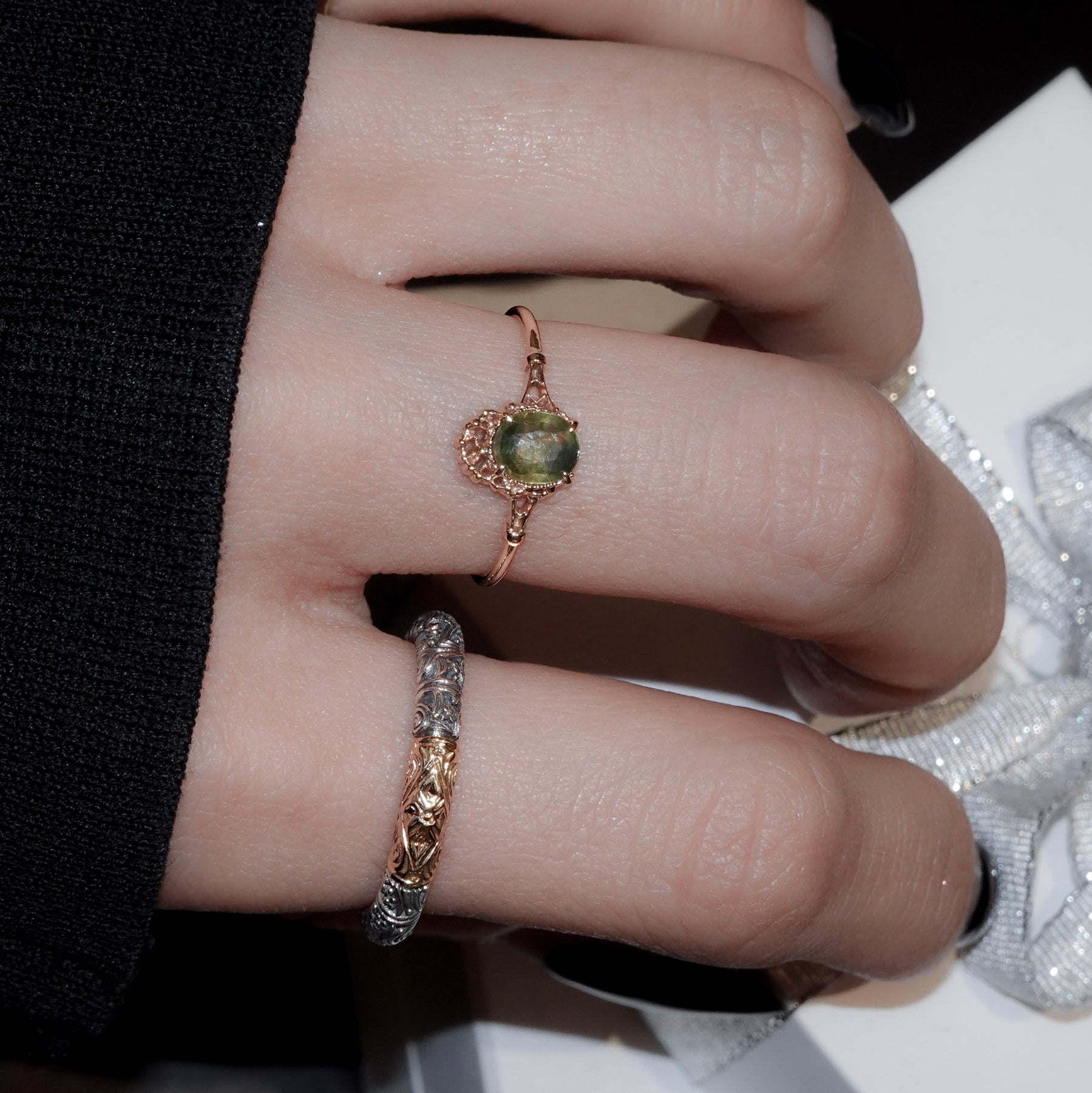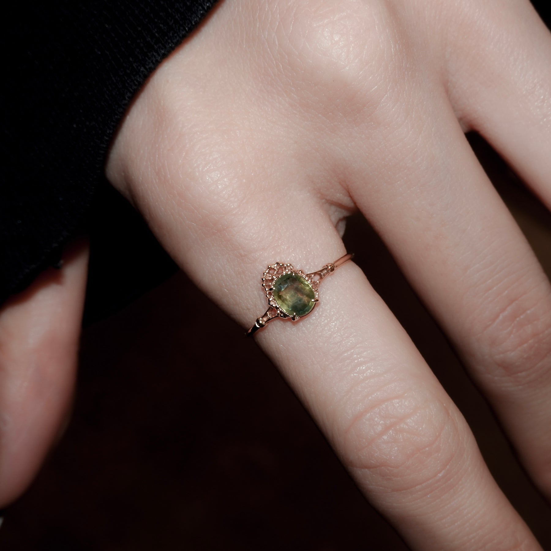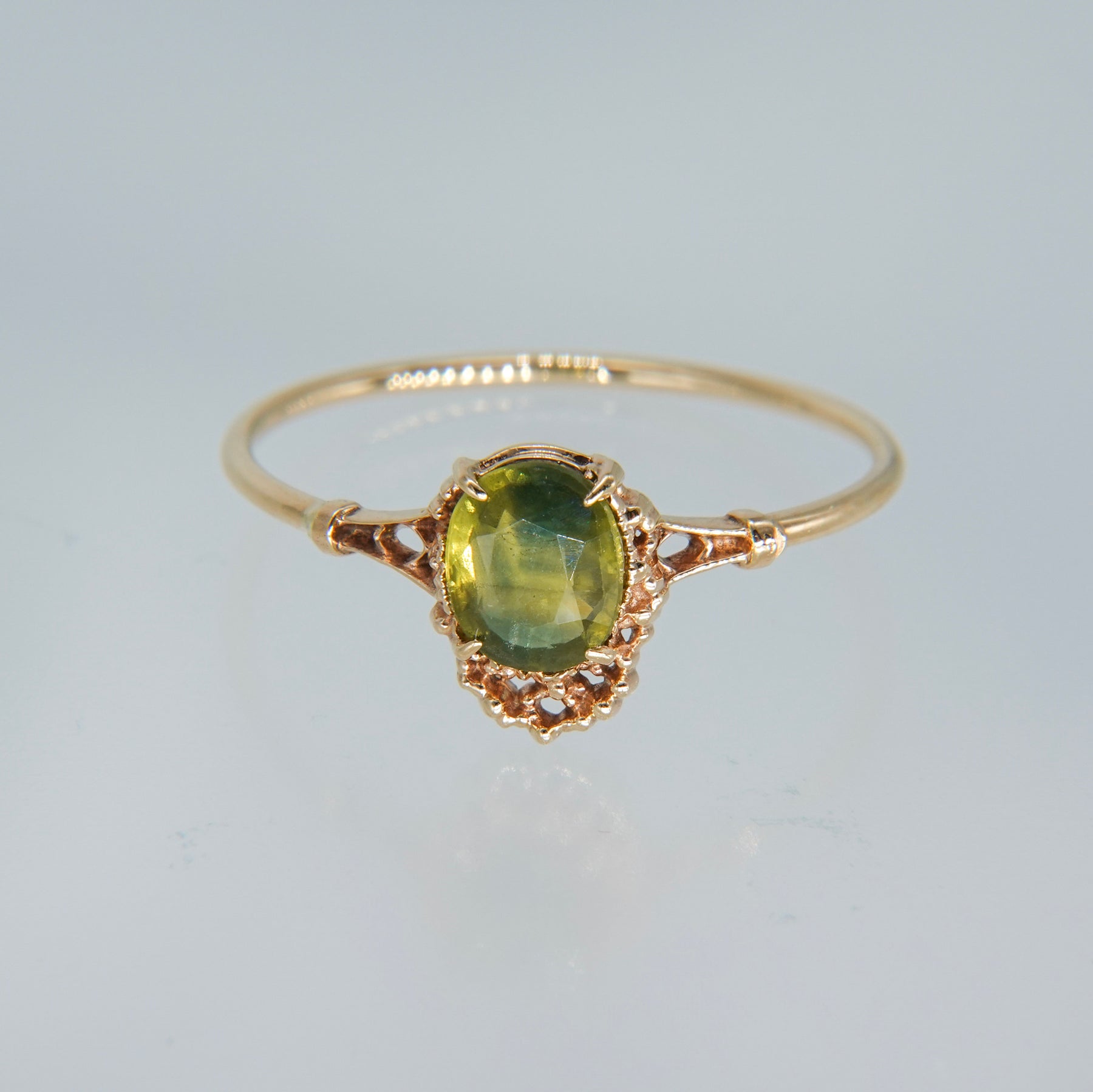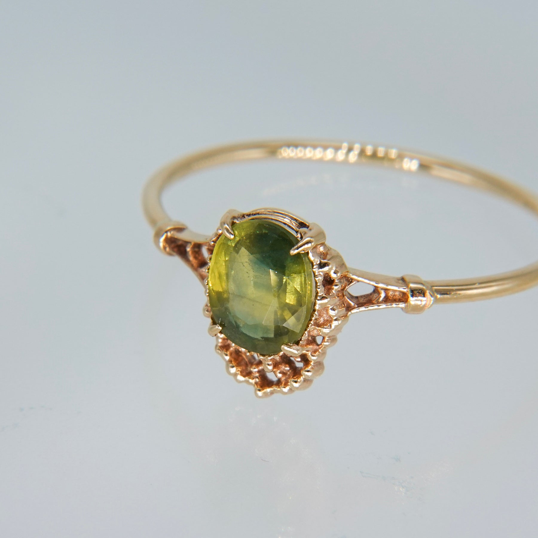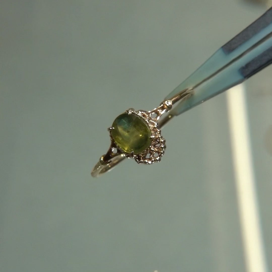 バイカラーサファイアならではの色の移ろいを楽しめるリングです。オーバルのファセットカットが施された石は、黄緑を基調とした色彩を持ち、内部にわずかに深いグリーンのニュアンスを含むことで、唯一無二の表情を見せます。