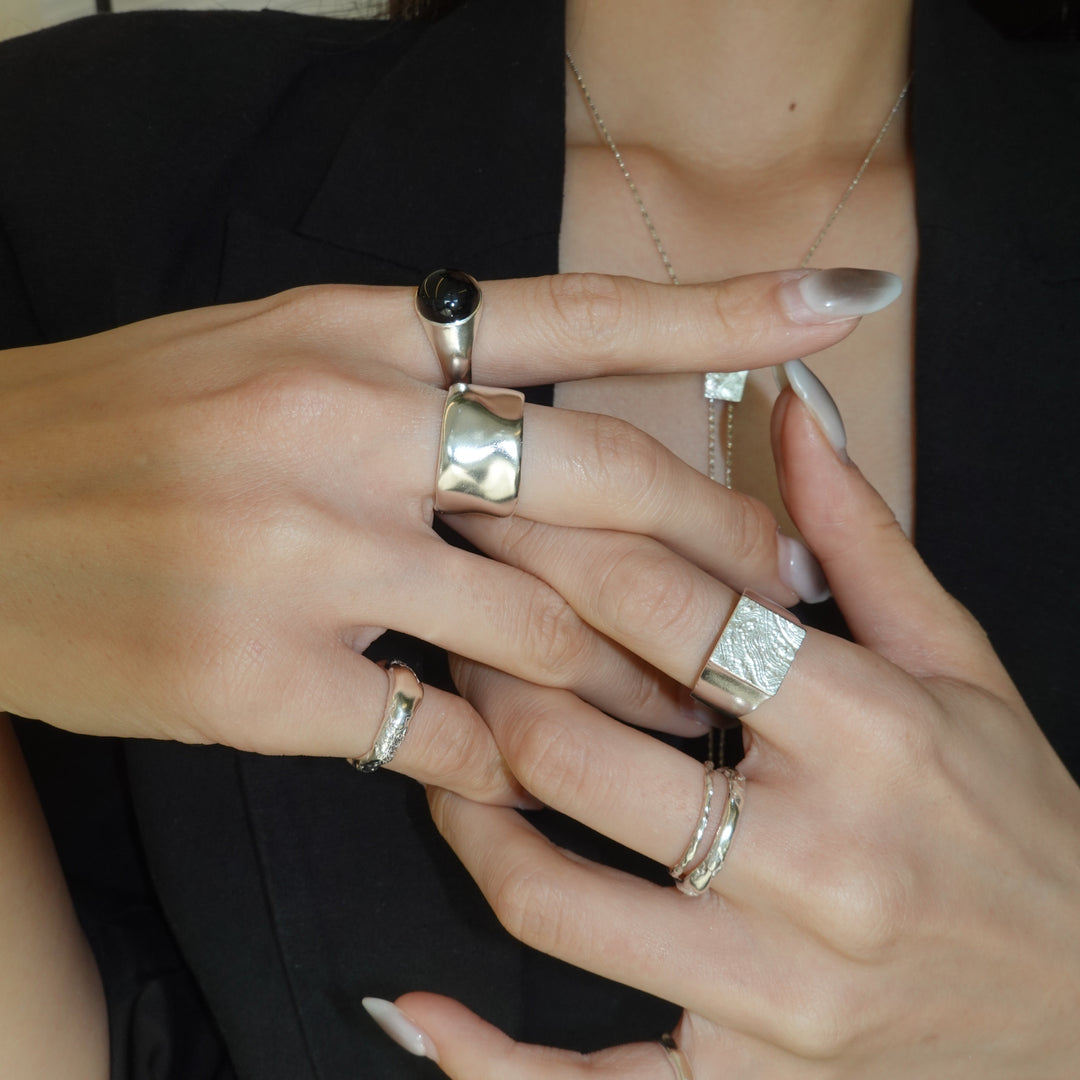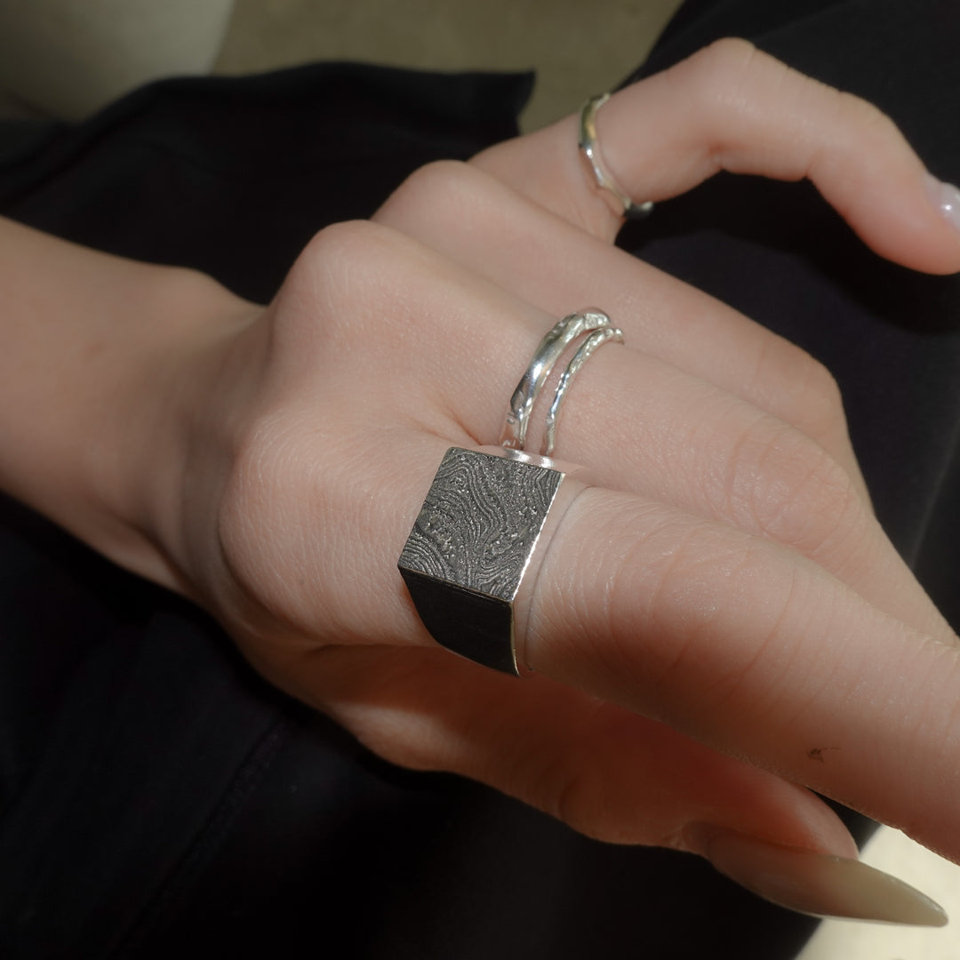 表面のテクスチャが木の年輪を思わせるシグネットリング。トップは裏抜きされており、軽い着け心地です。