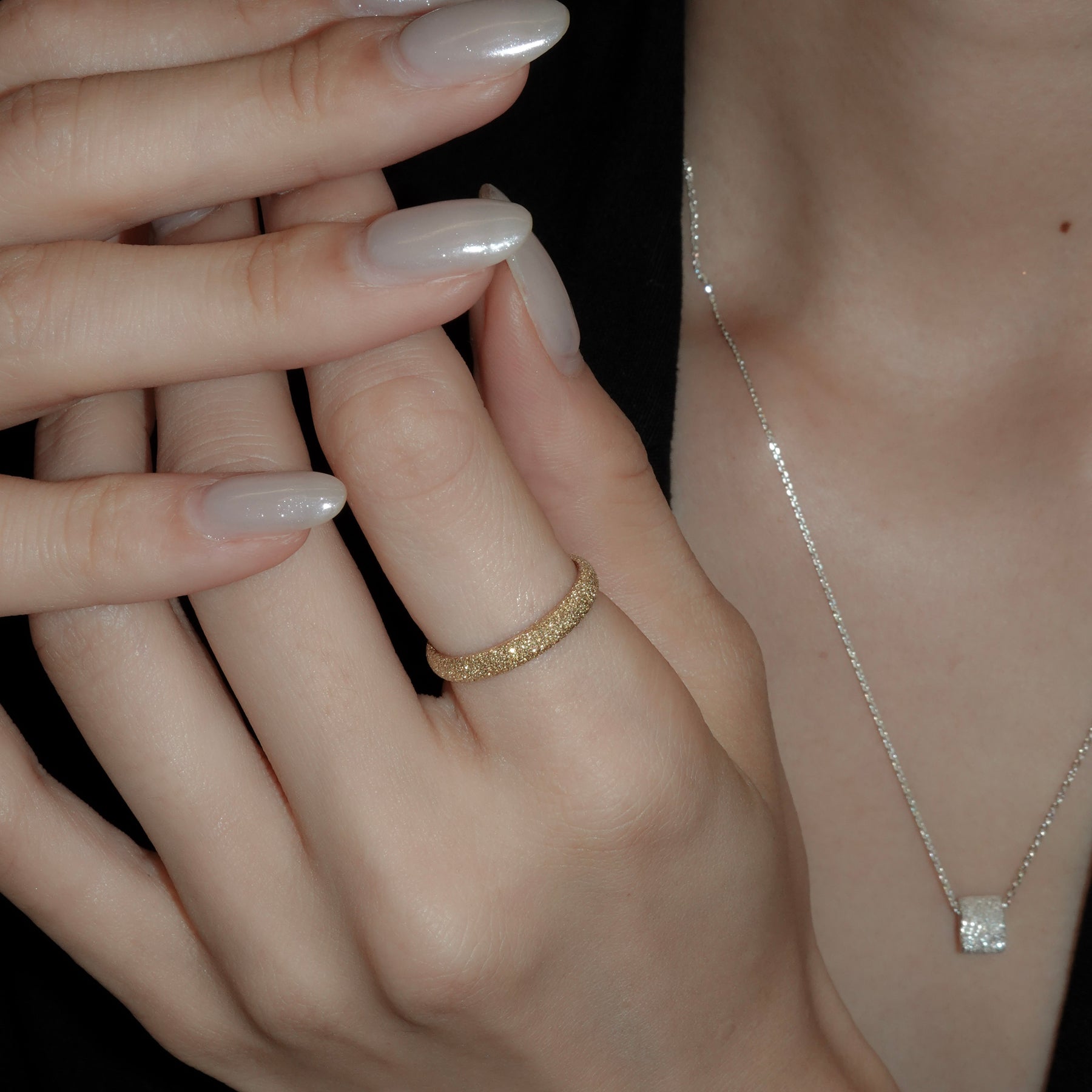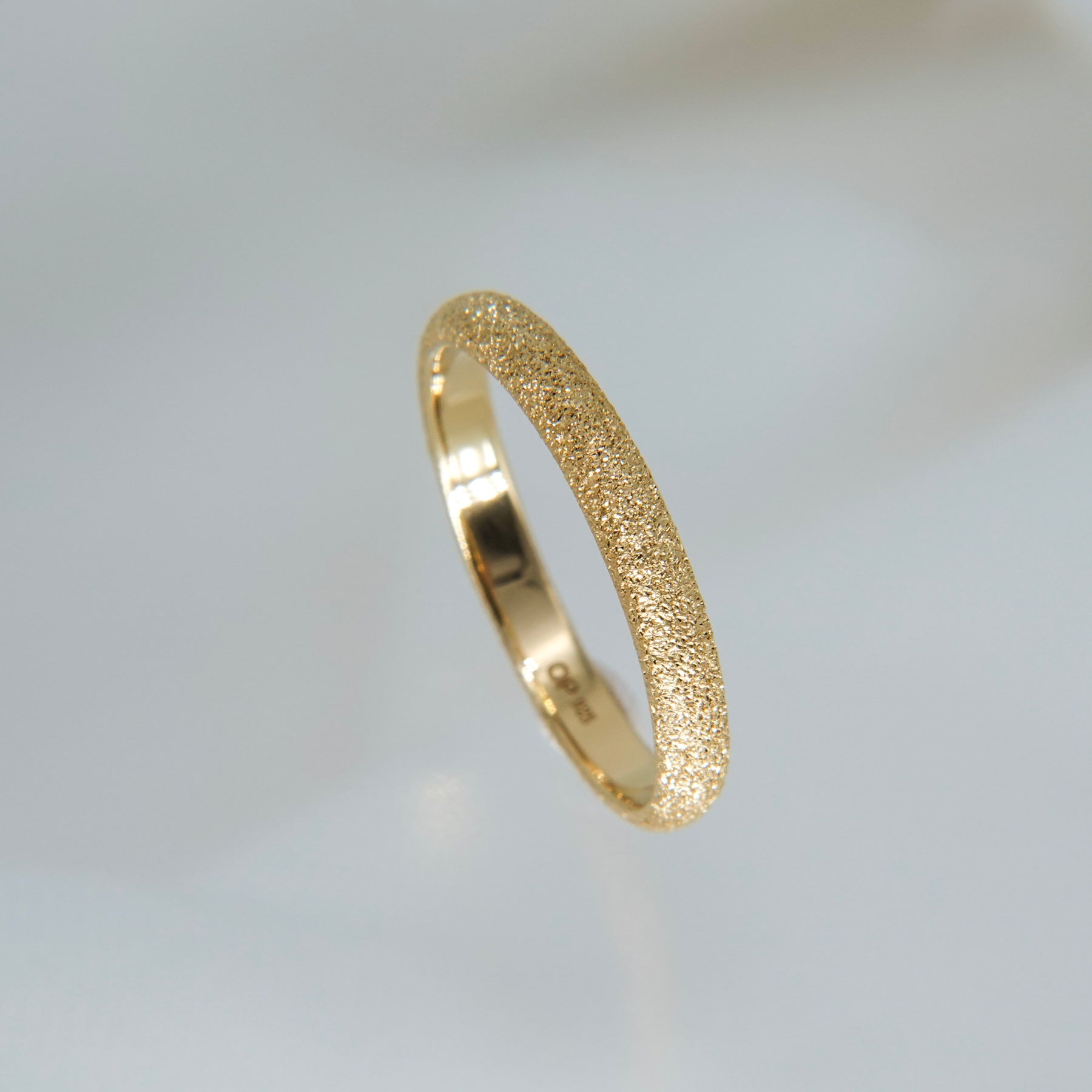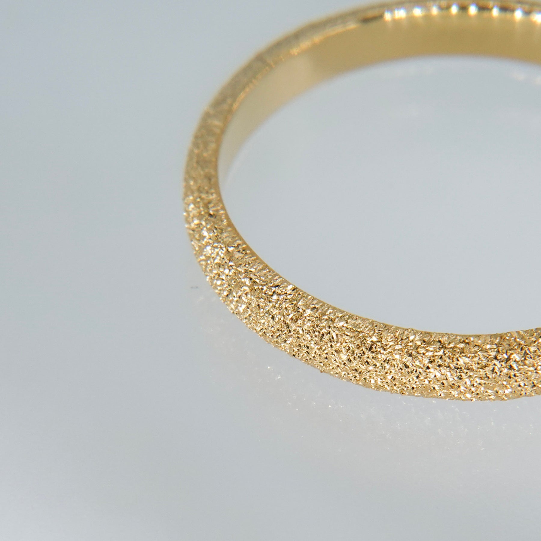 幅2.6mmと細身なアームながら、グラニートによる輝きにより存在感があり、1本でも重ねづけでも重宝するリングです。甲丸タイプで優しい印象です。
