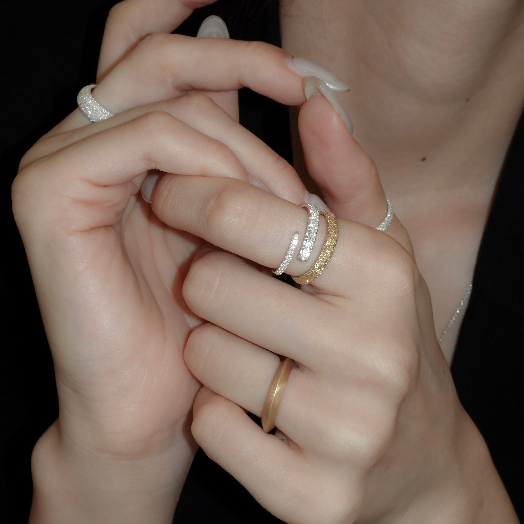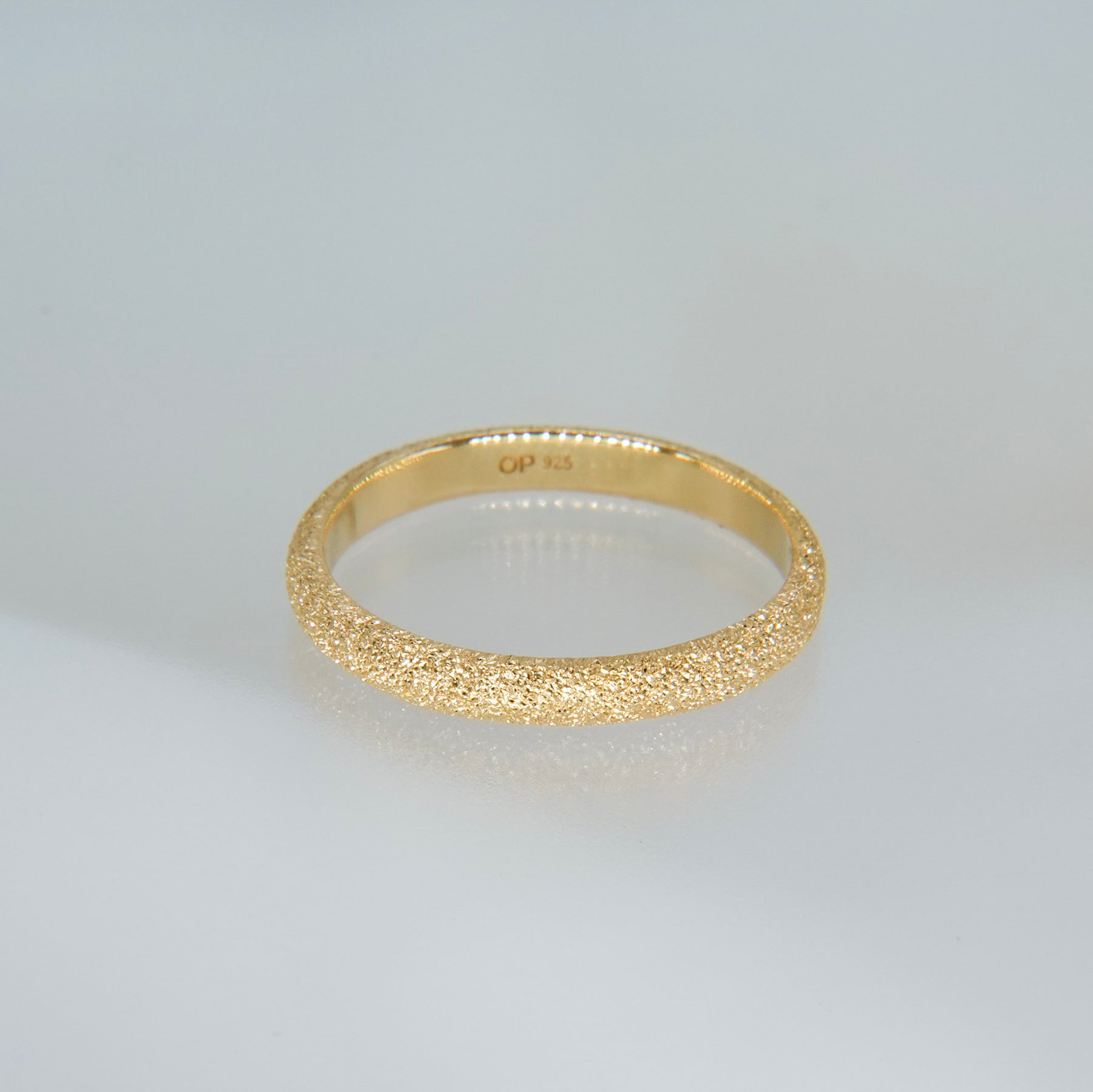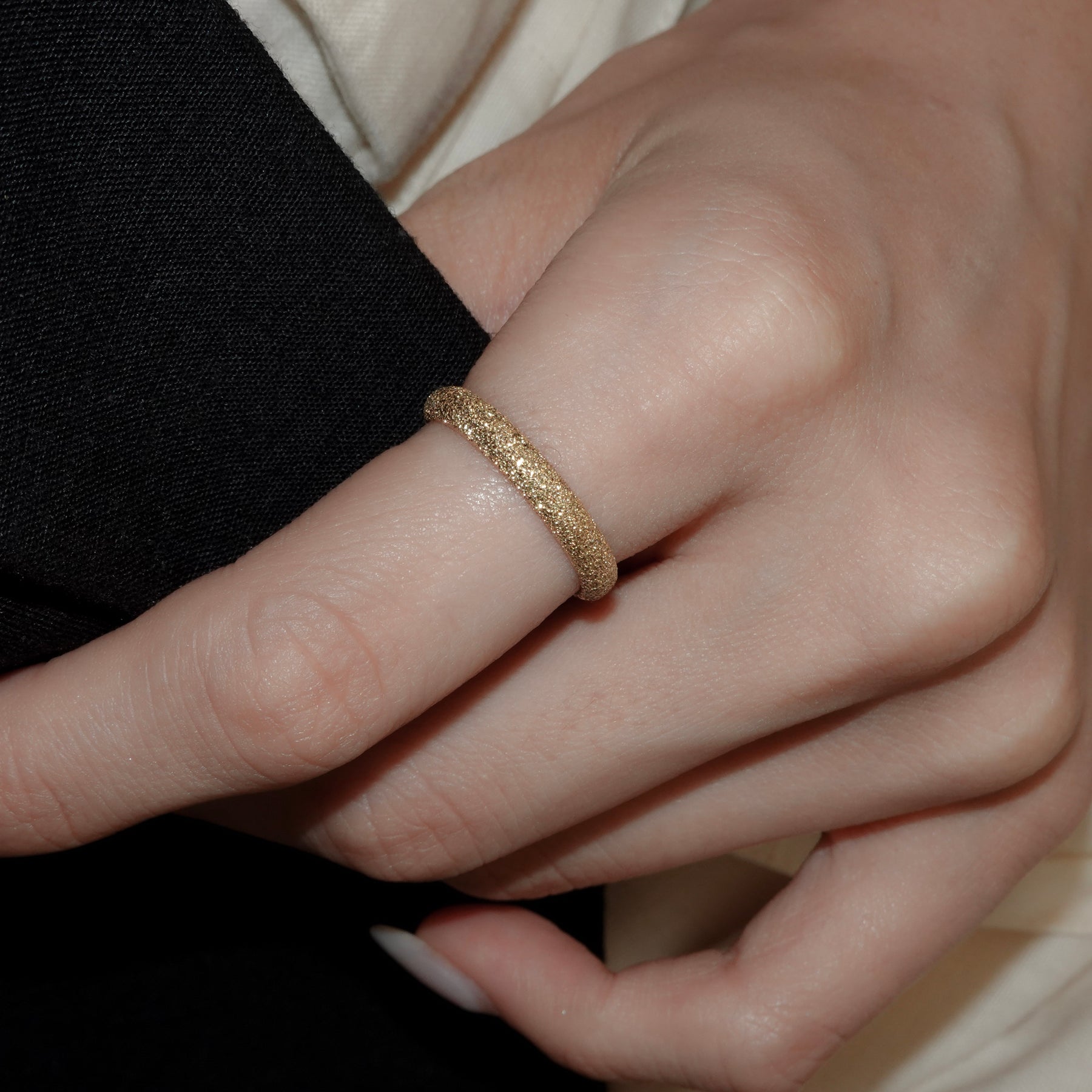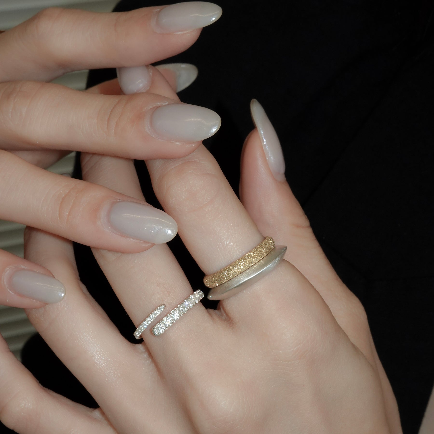 幅2.6mmと細身なアームながら、グラニートによる輝きにより存在感があり、1本でも重ねづけでも重宝するリングです。甲丸タイプで優しい印象です。