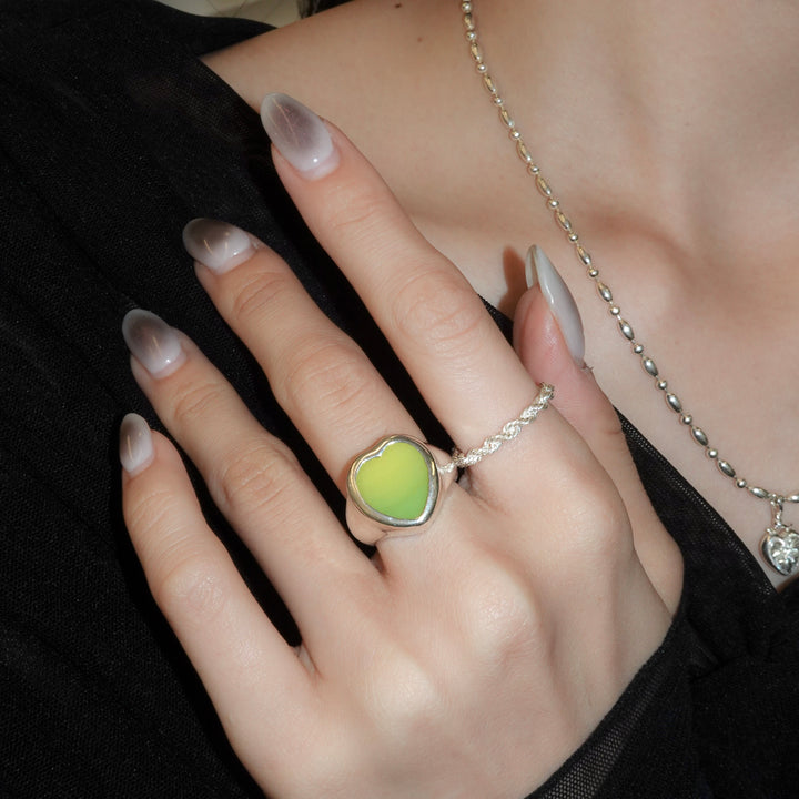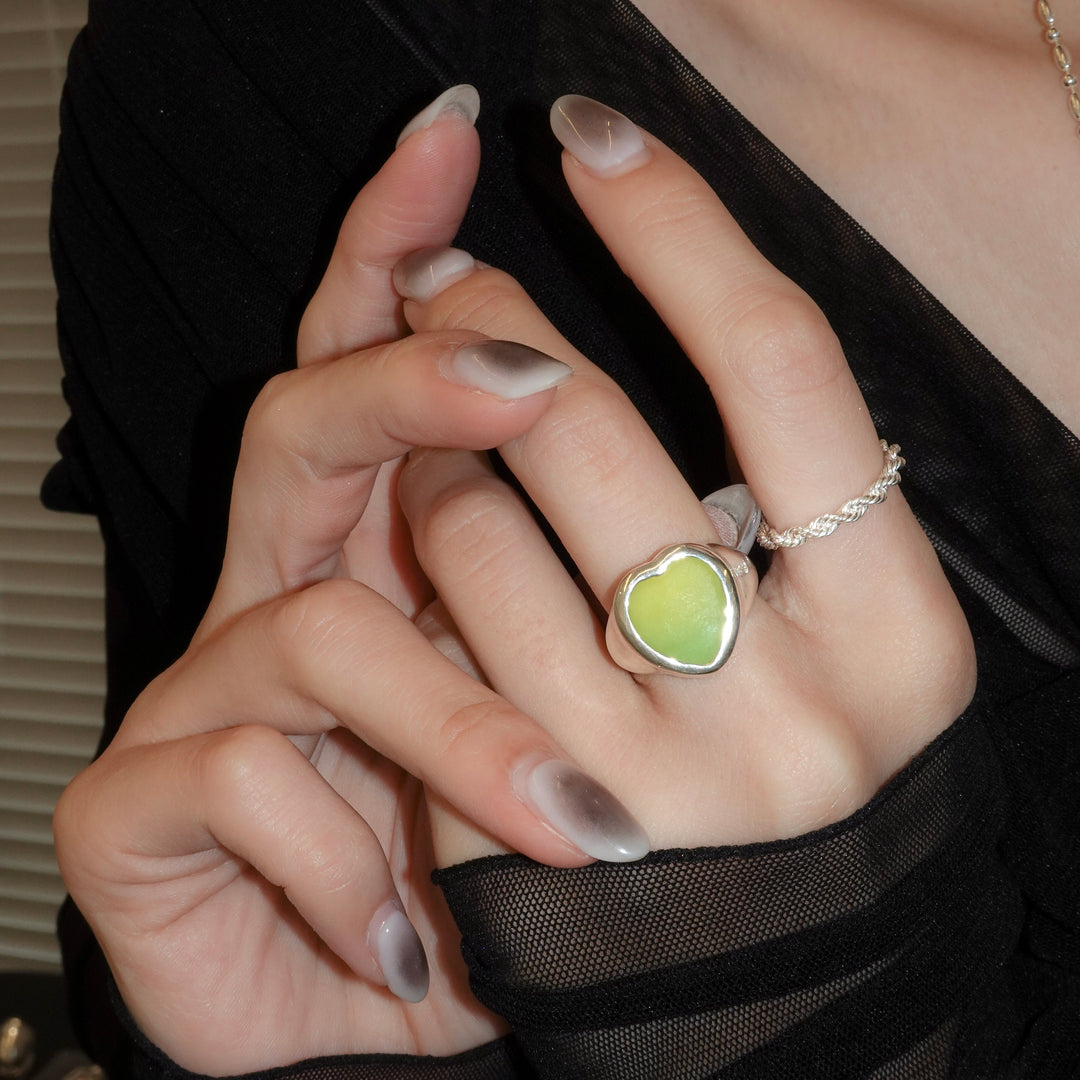 ライムイエローがポップで可愛いウグイスアゲートのハートリング。 ぽってりとしたボリューム感のあるシルバーと、天然石ならではのオーガニックな色彩。そのコントラストが美しく、思わず目を引くデザインです。 天然石の板からデザイナーが一つひとつ丁寧に選び抜き、山梨・甲府の職人によりオリジナルのハート型にカットされた一点物。