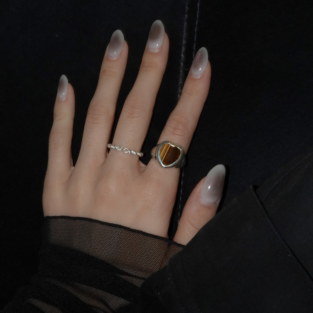 温かみのあるブラウンと美しい縞模様が特徴のタイガーアイを使ったハートリング。 ぽってりとしたボリューム感のあるシルバーと、天然石ならではのオーガニックな色彩。そのコントラストが美しく、思わず目を引くデザインです。 天然石の板からデザイナーが一つひとつ丁寧に選び抜き、山梨・甲府の職人によりオリジナルのハート型にカットされた一点物。