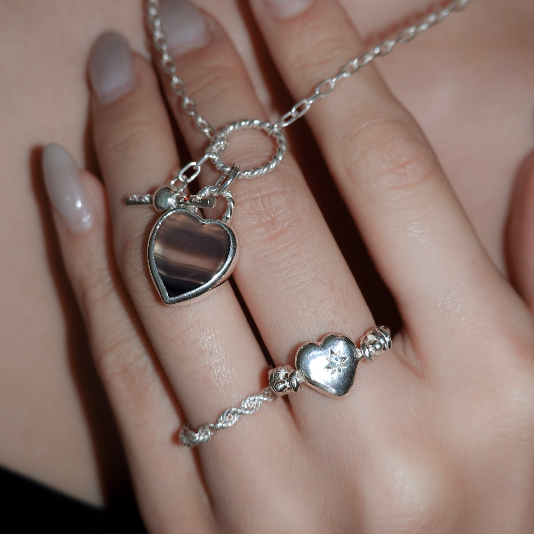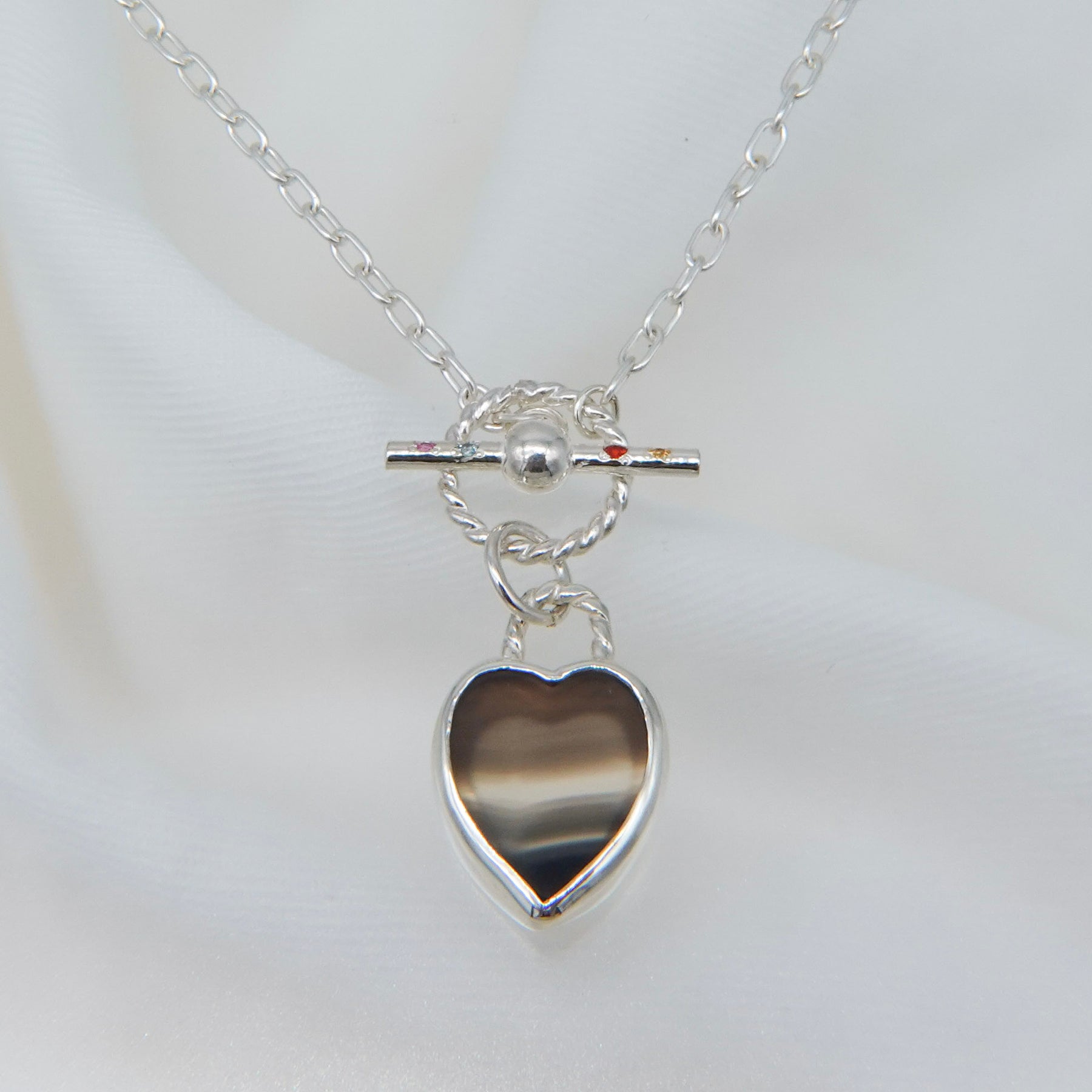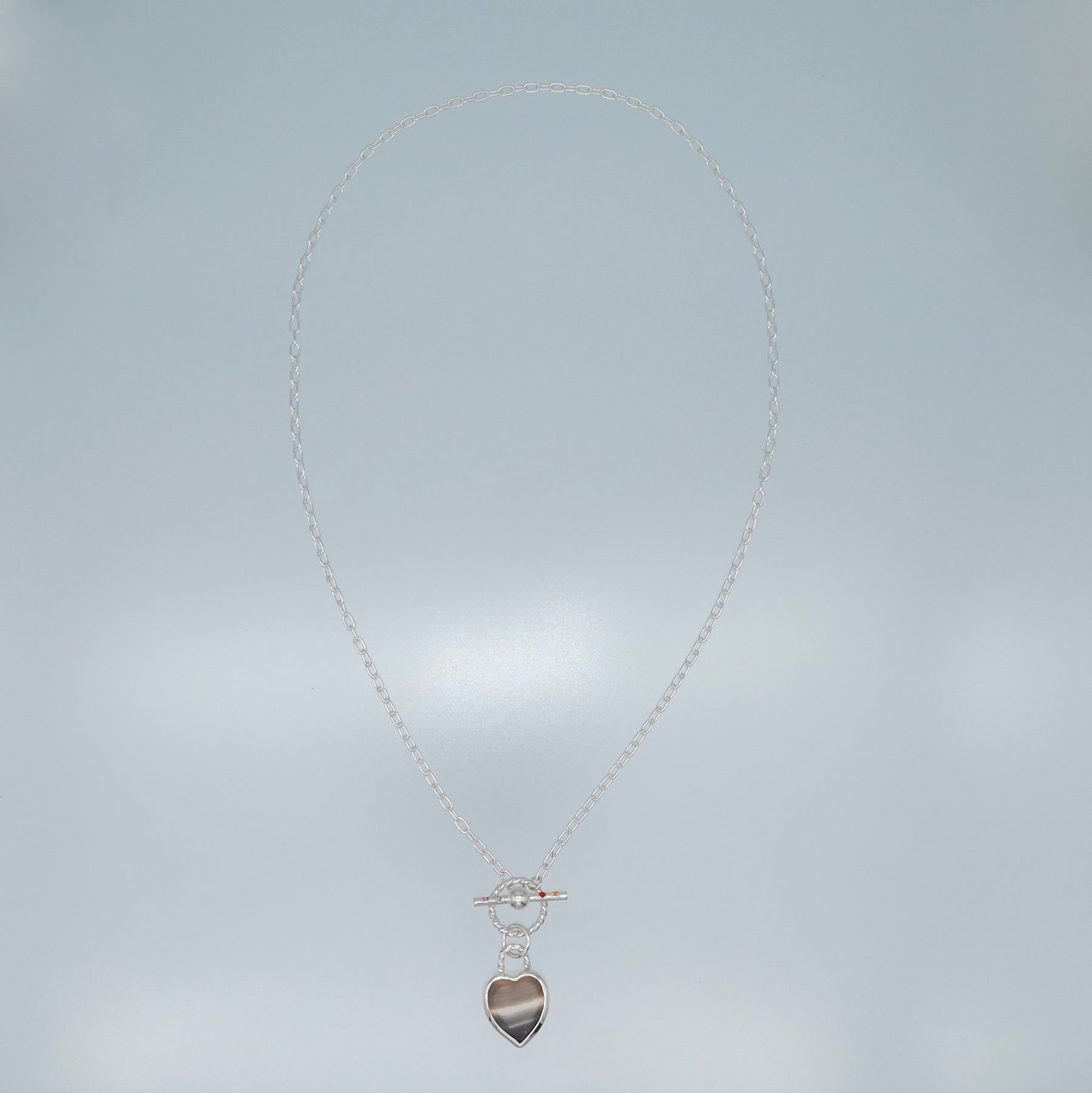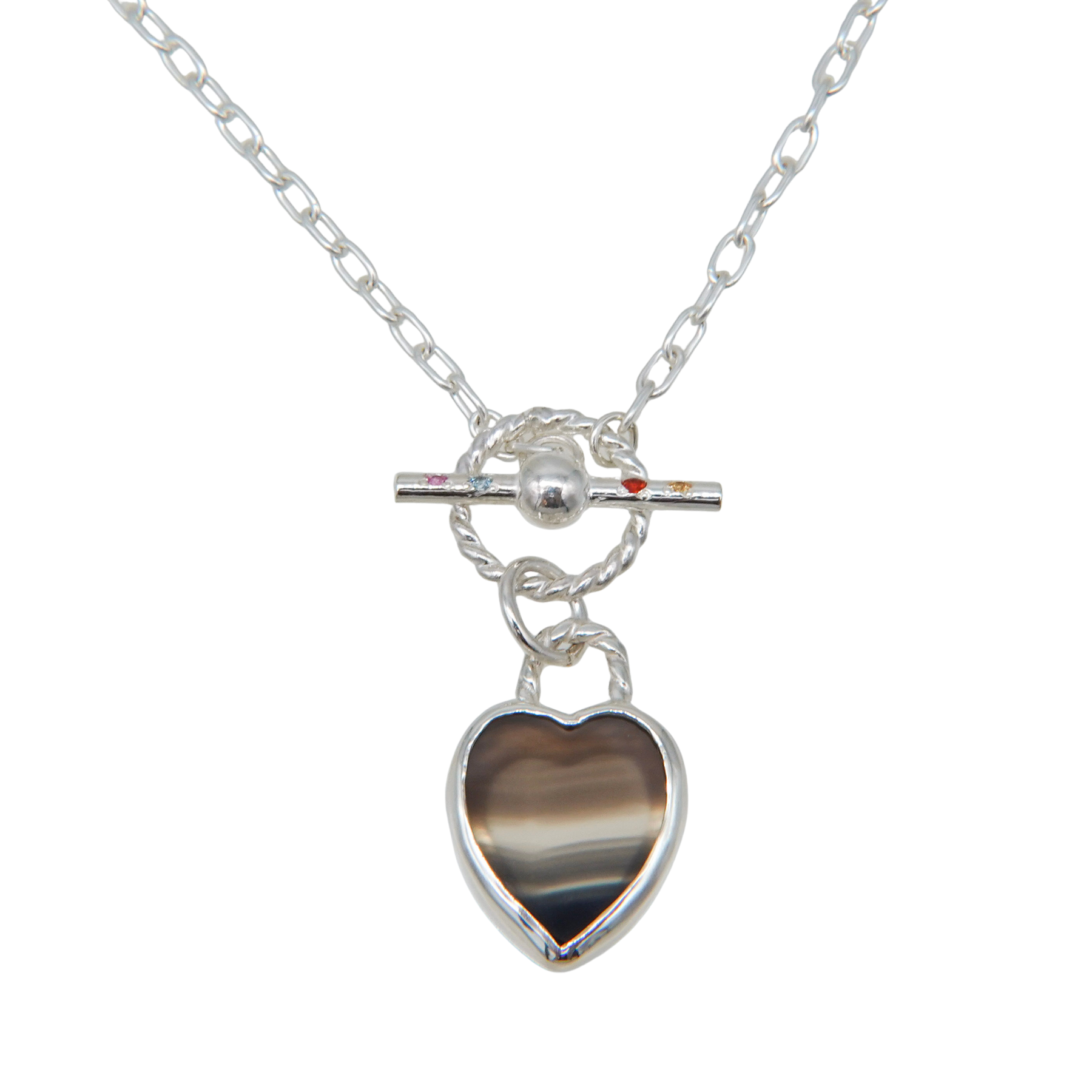 透明感のある模様と落ち着いたブラウンが美しいハート型のアゲートのネックレス。 太めのチェーンとカラフルなサファイアをあしらった金具がキュートなデザインです。