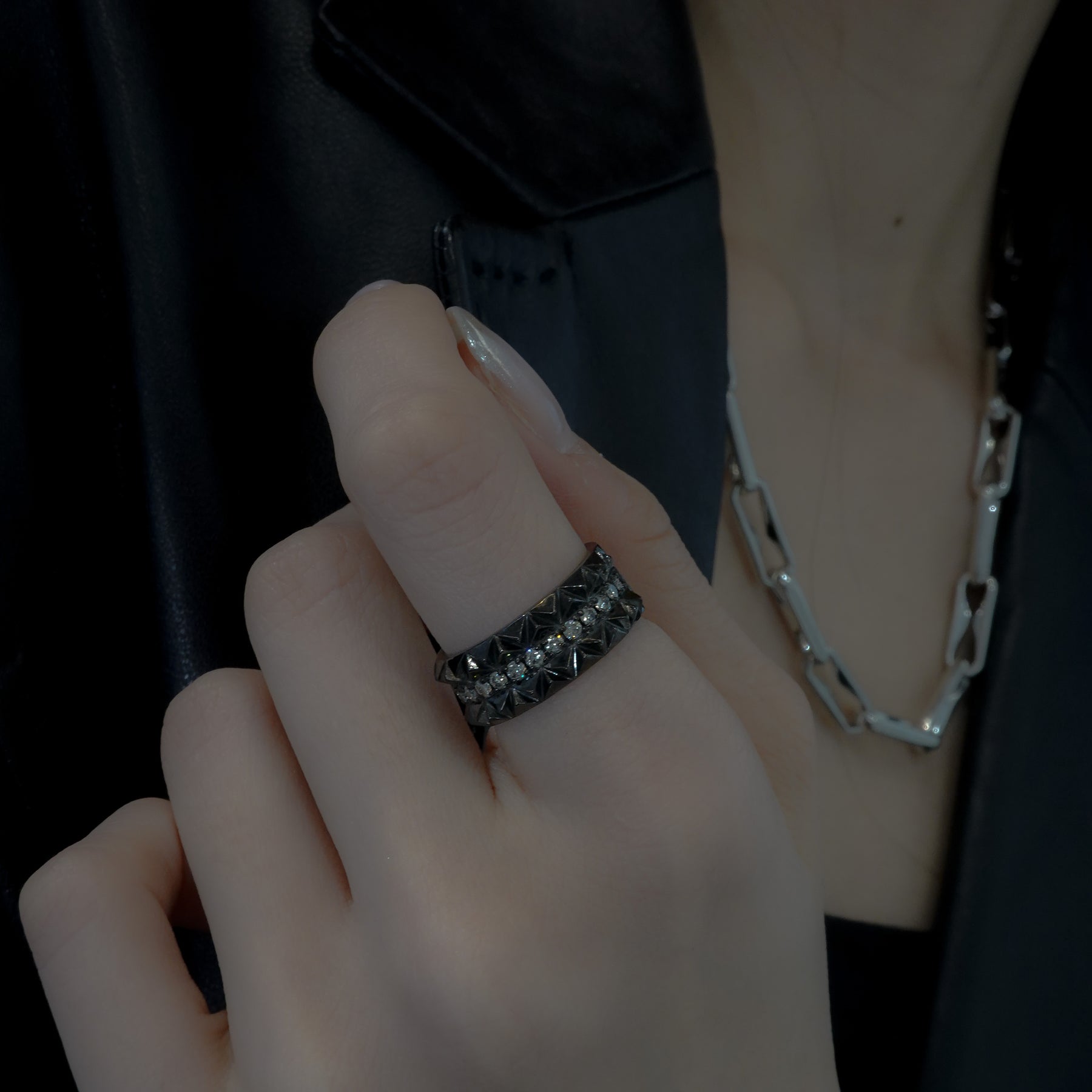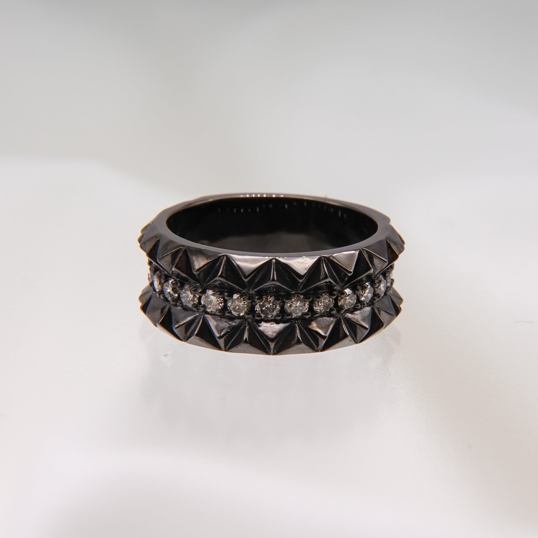 スタッズの形状を大胆に三角錐に昇華させ上下に敷き詰めることで光の反射がより届くよう緻密に計算されたコレクション。