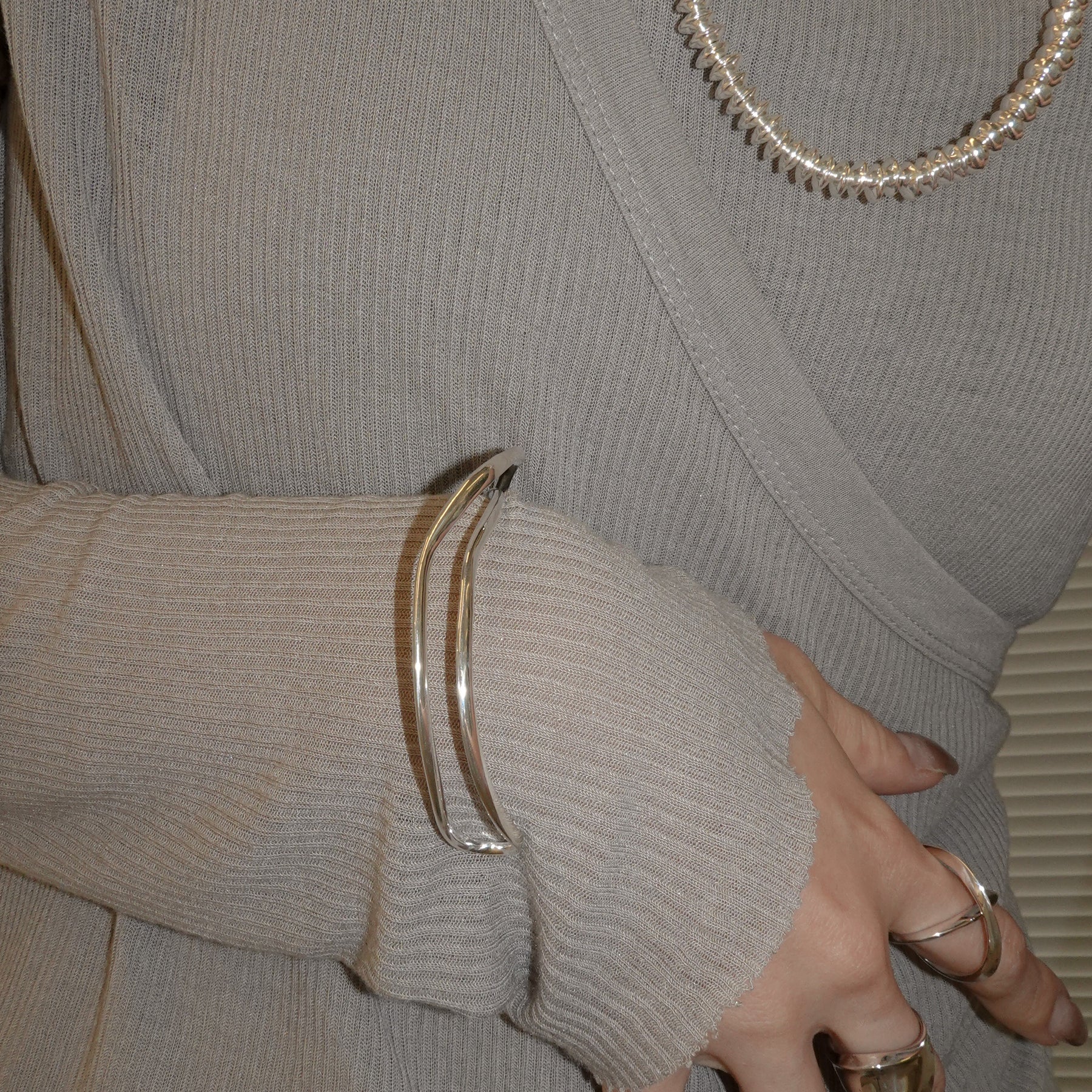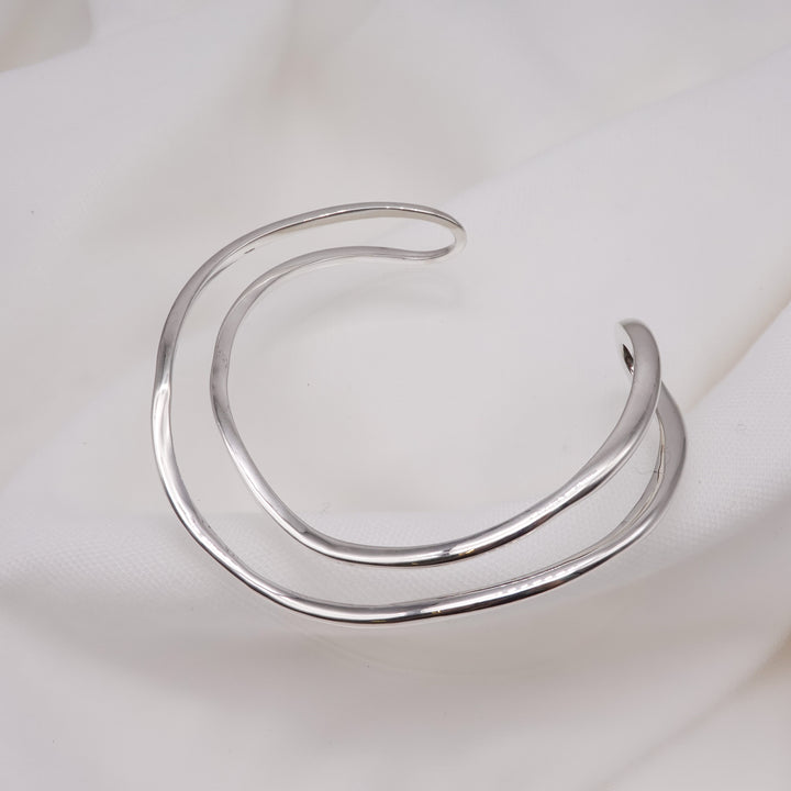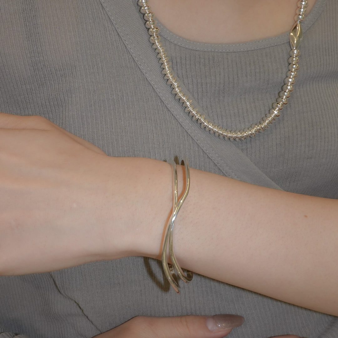 不規則な捻りやカーブを用いた立体的なフォルムのバングル。