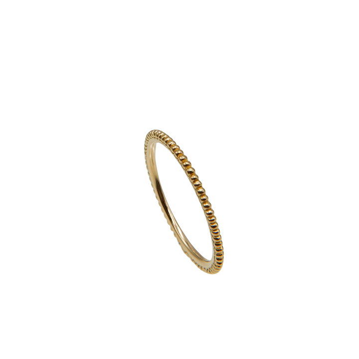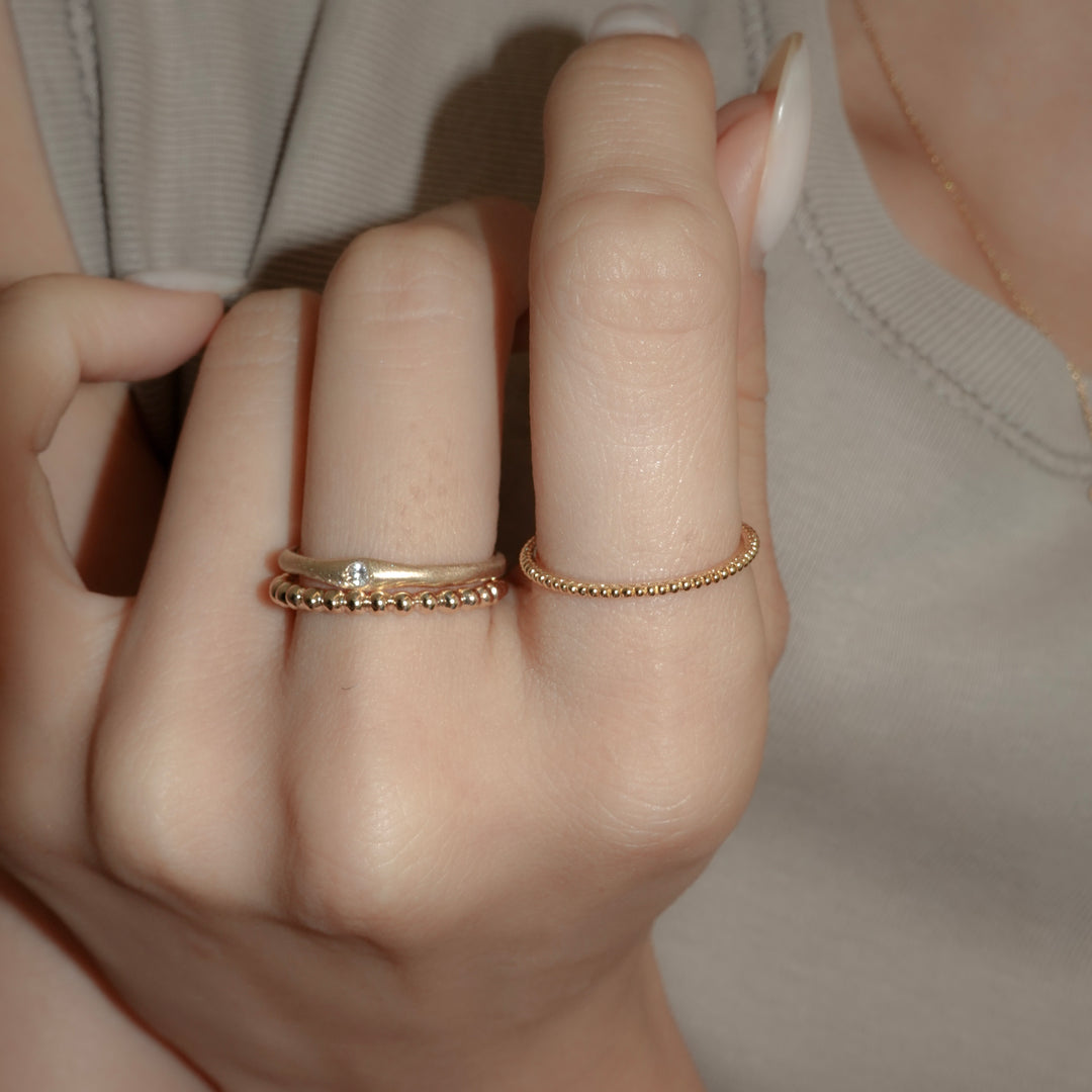 わずか1mmのミルグレインリング。高さを出すことで重ね付けした時に埋もれず、キリッと輪郭を引きしめてくれる名脇役。