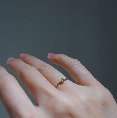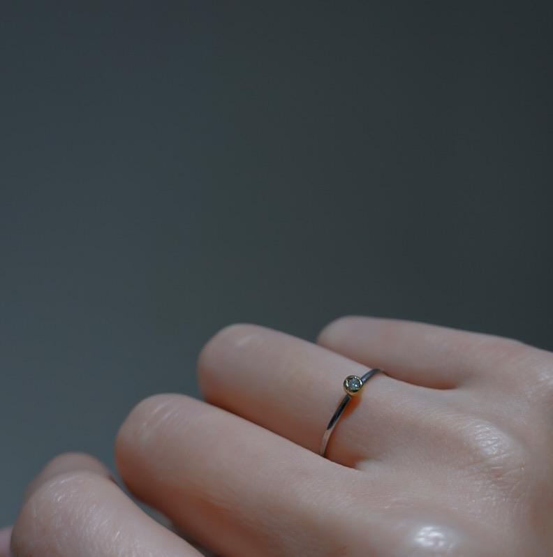 0.01ctのダイヤとリングアームの槌目模様がキラキラと繊細に輝くリング。濃いめのシルバーのアームがダイヤモンドの輝きを一層引き立てます。