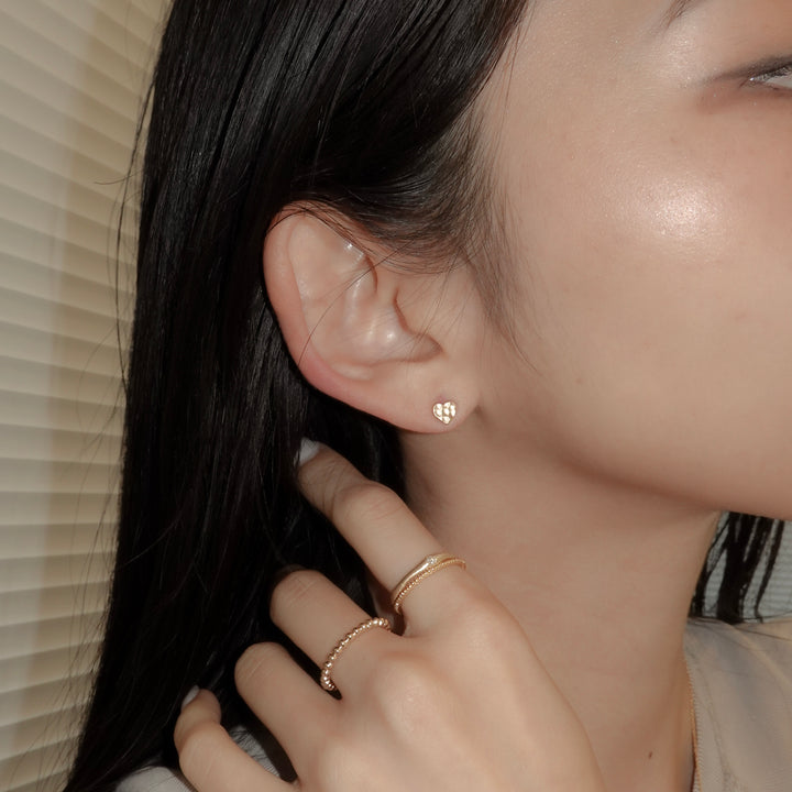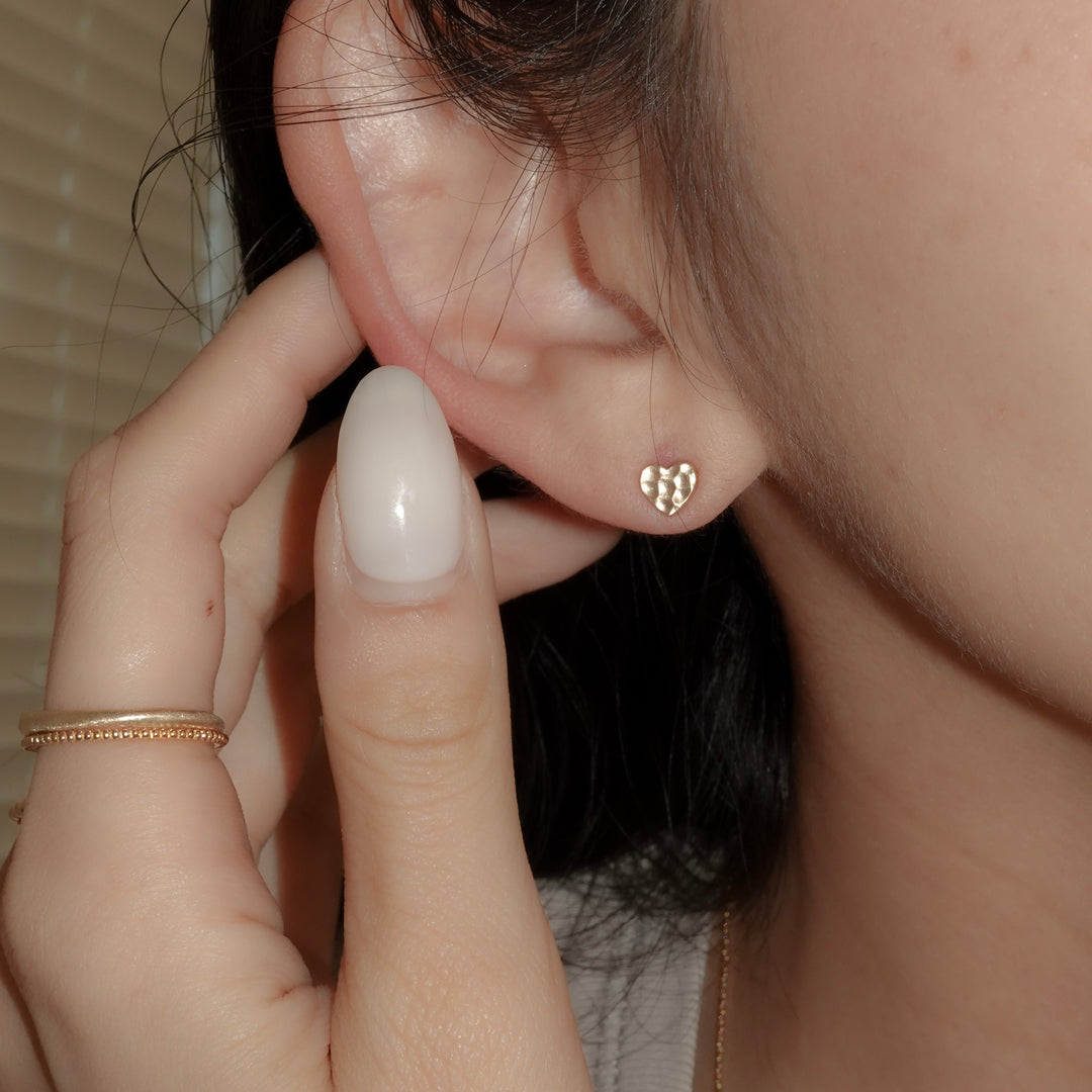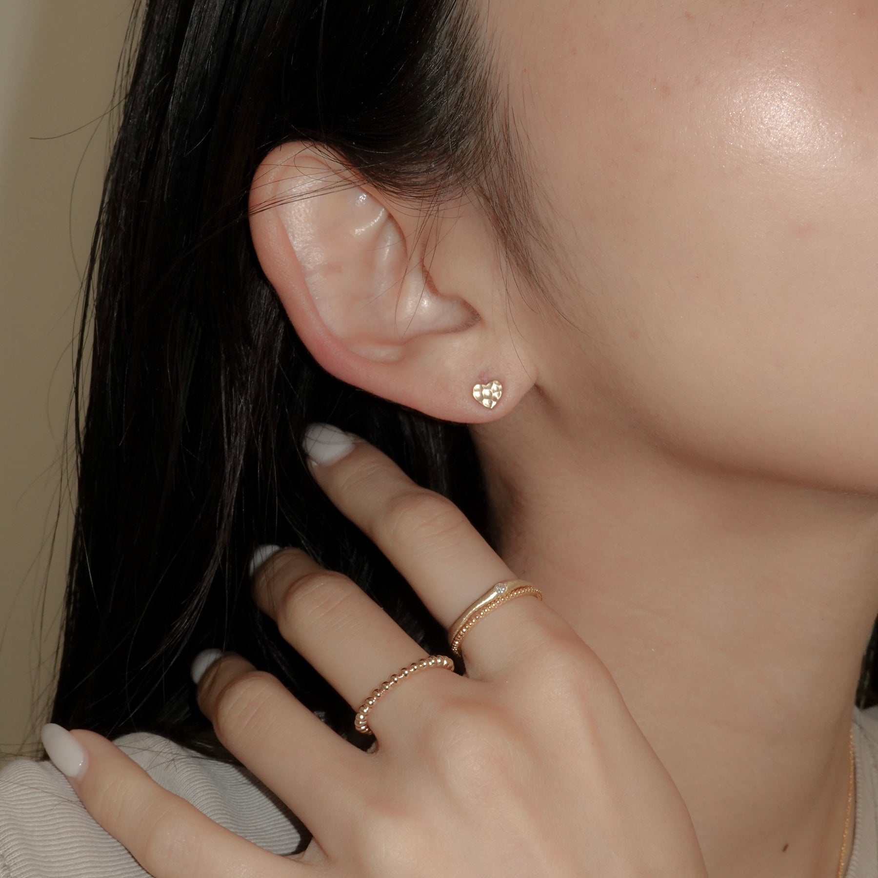 ハートモチーフのピアス。槌目模様をつけたつや消し仕上げで甘すぎないテイスト。