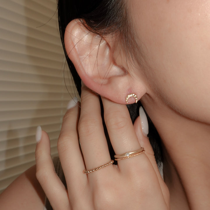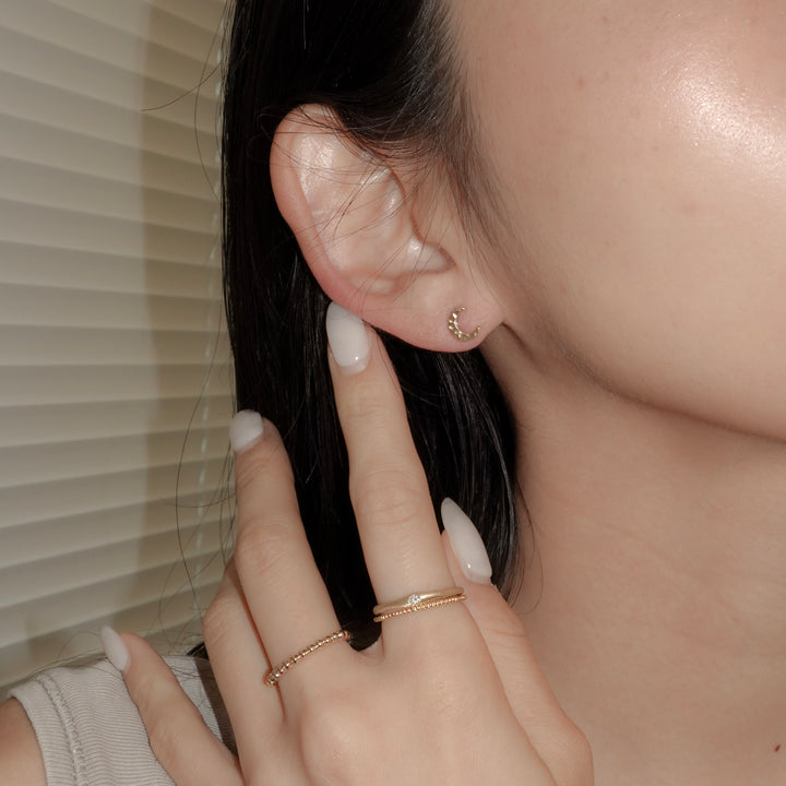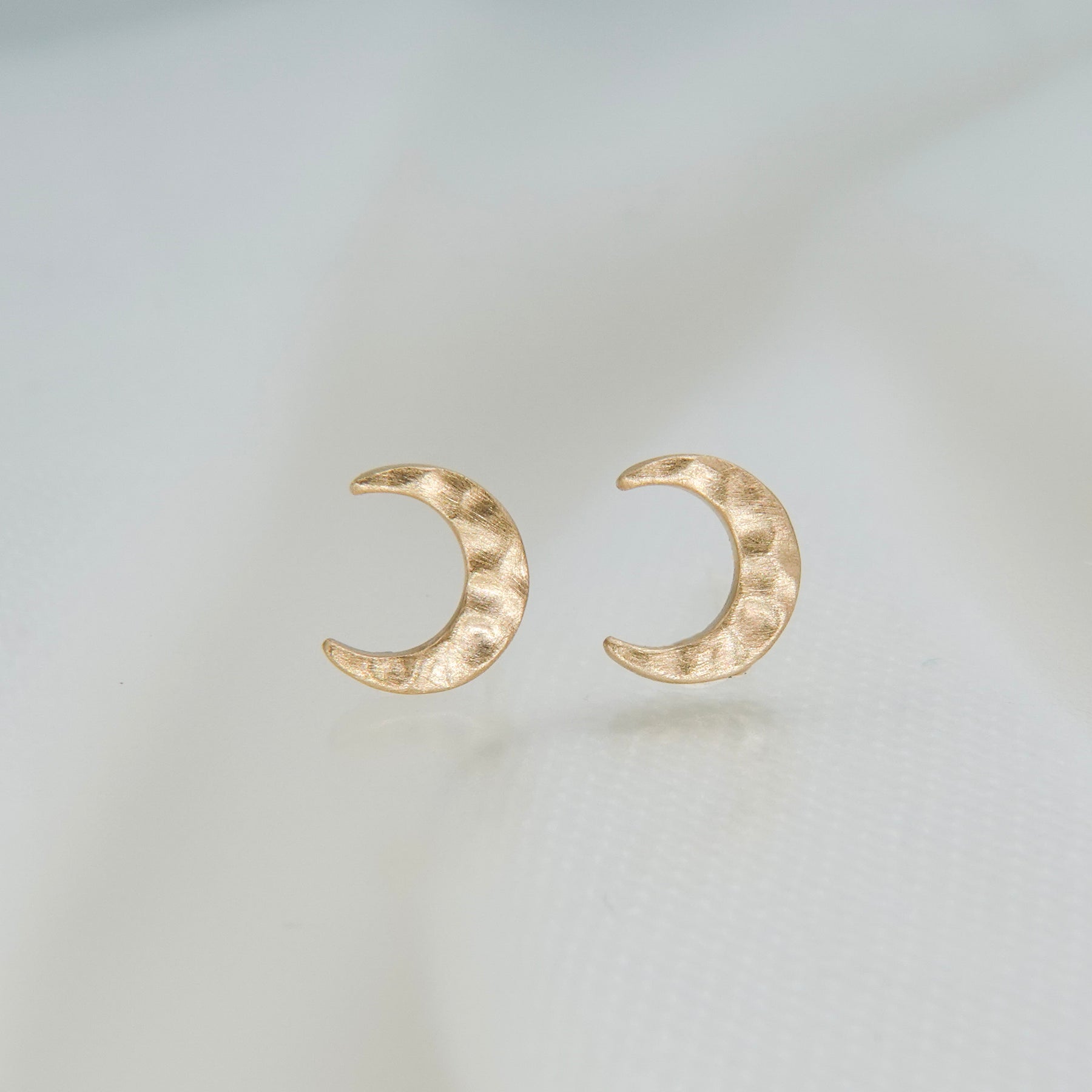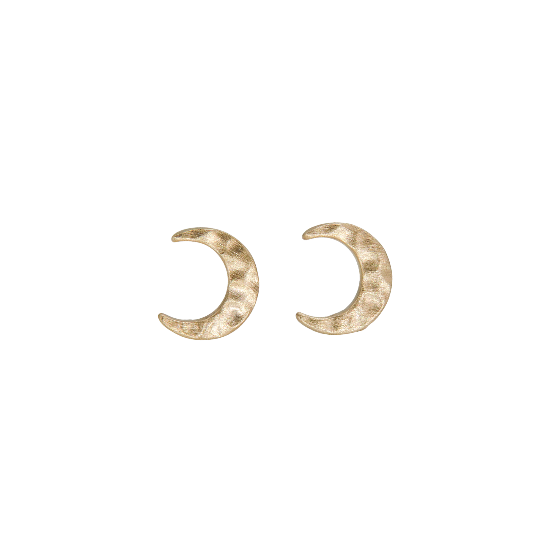 三日月モチーフのピアス。槌目模様をつけた、つや消し仕上げで甘すぎないテイスト。
