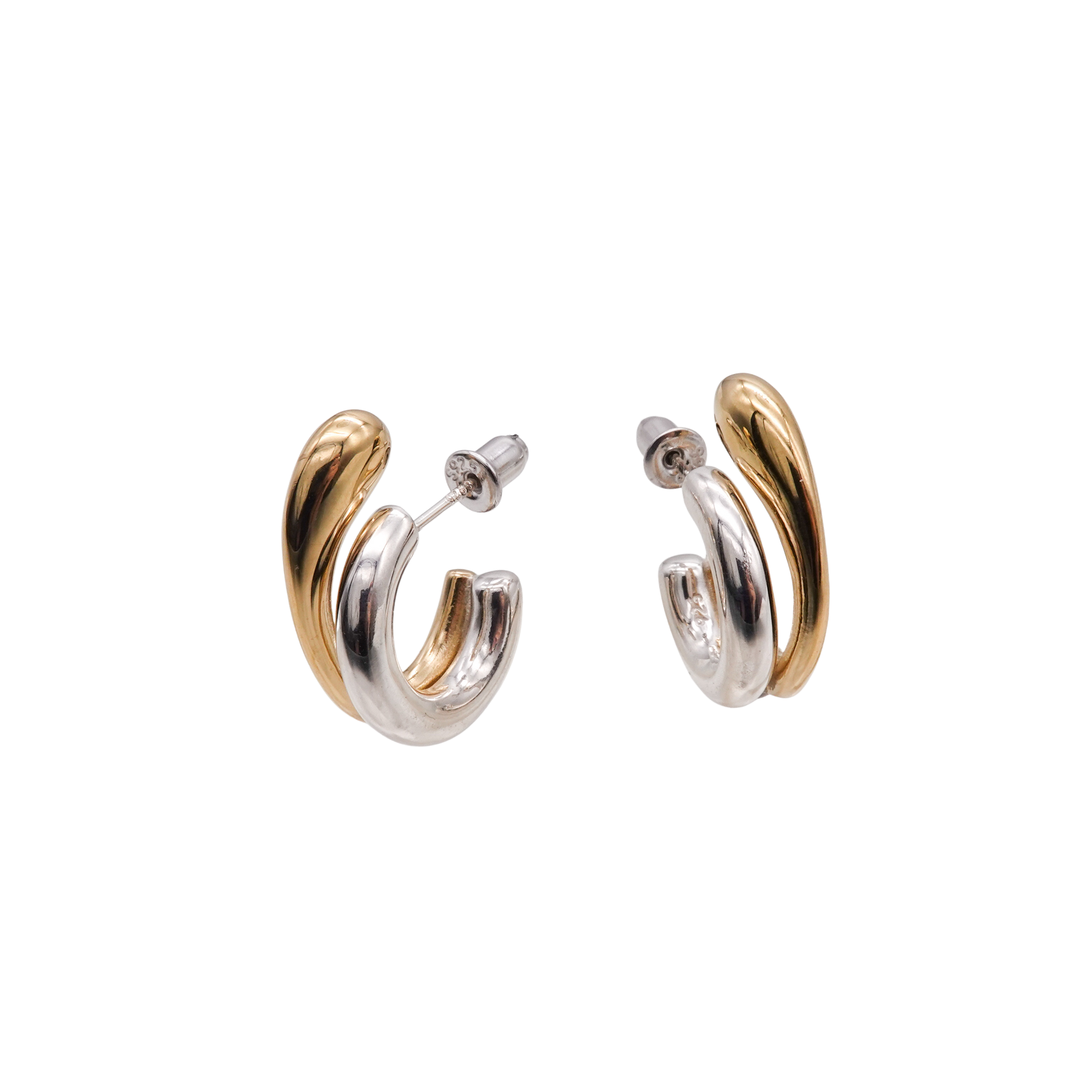 シルバー・ゴールドのミックスカラーのピアス。2つピアスを重ねづけしているかのようなデザインです。