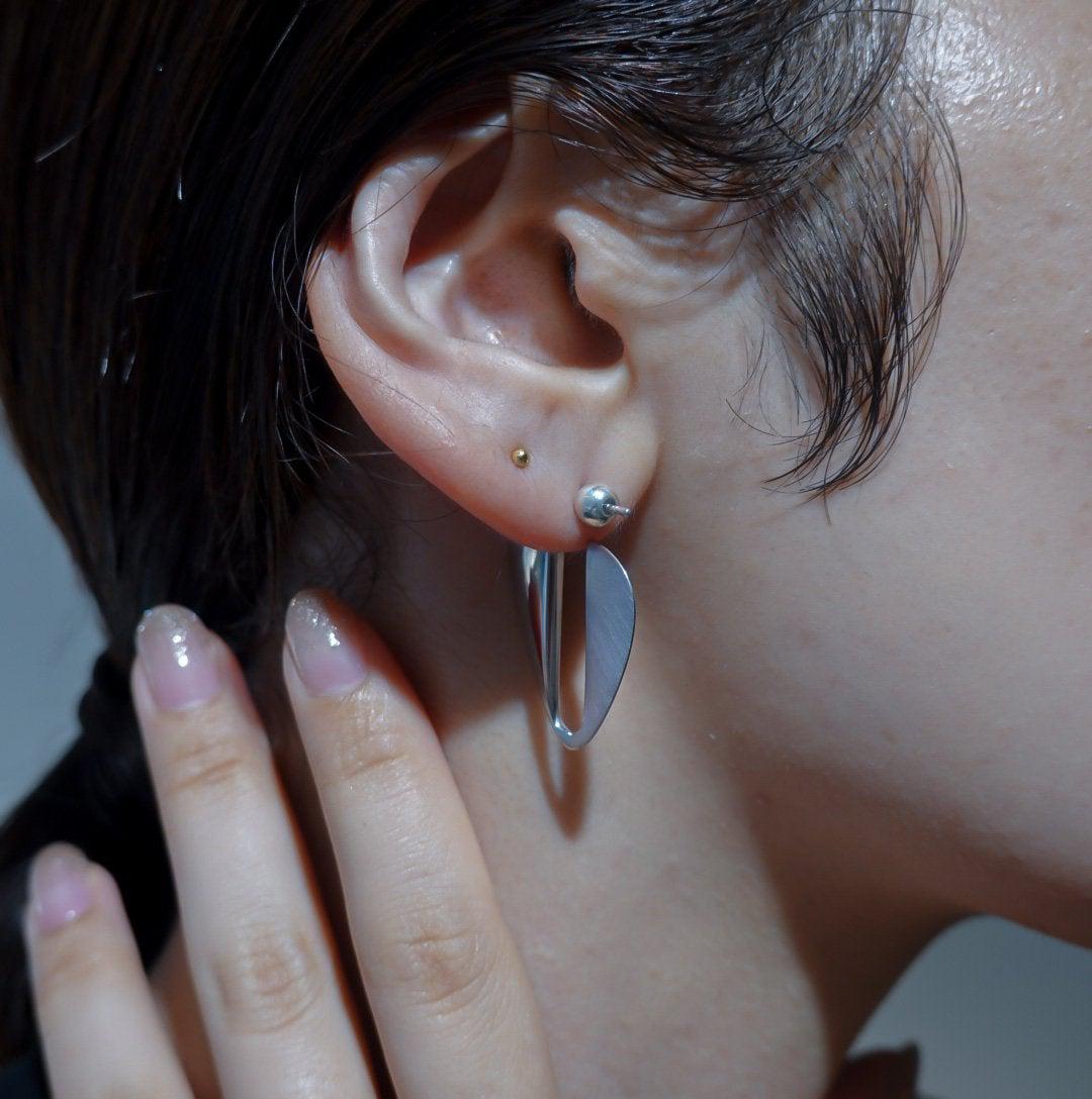 文字のようなグラフィカルな形に、起伏のコントラストが特徴的なピアス。ボールキャッチが前から見えるように着けたり、着け方によって異なる表情をお楽しみください。