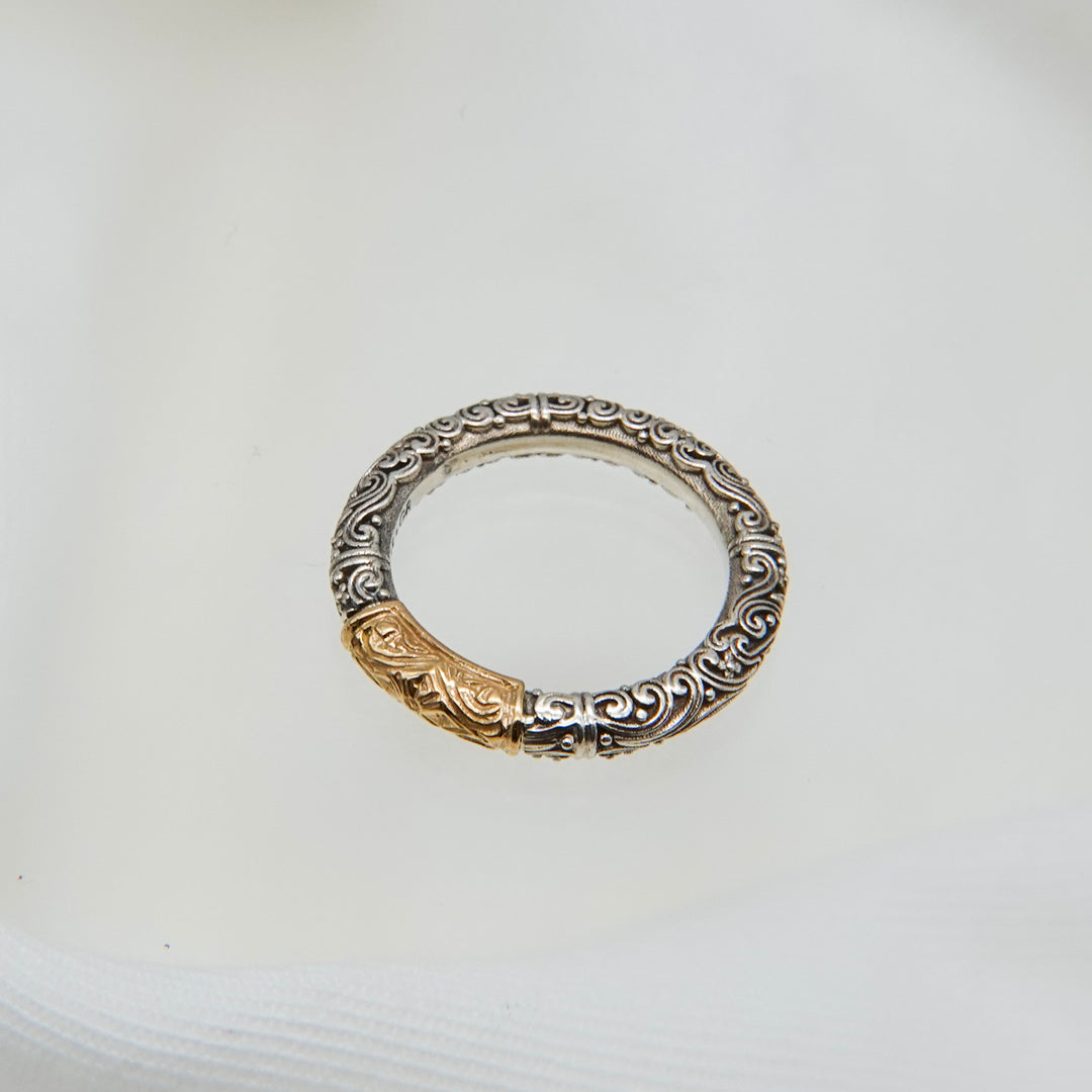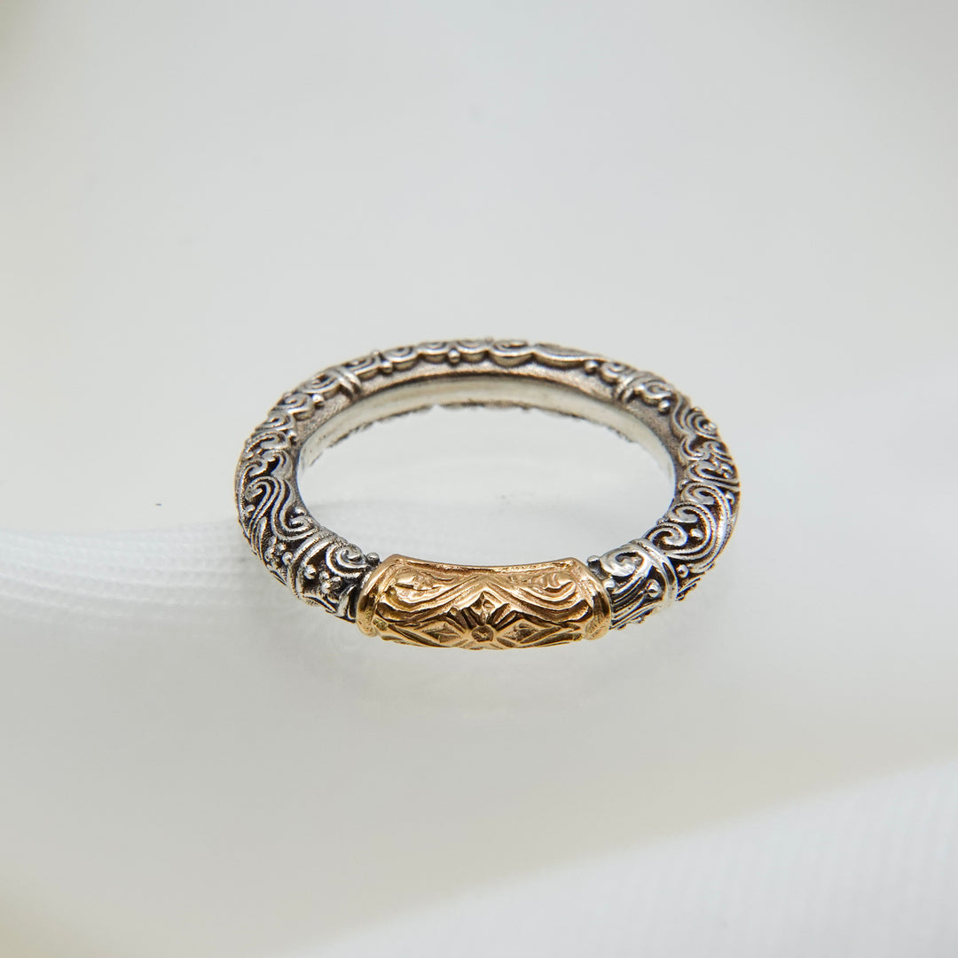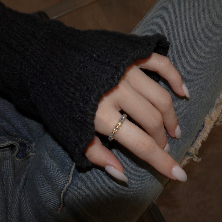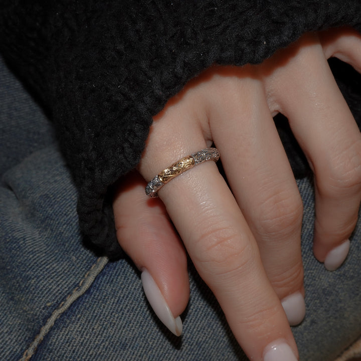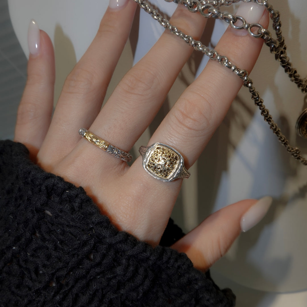 リングトップにさりげなく施されたゴールドのポイントが目を引く、洗練されたデザインのリング。シンプルな中にほんの少しのアクセントが添えられていることで、手元に上質なニュアンスを演出してくれます。重ね付けにも映える、デイリーに取り入れやすいアイテム。