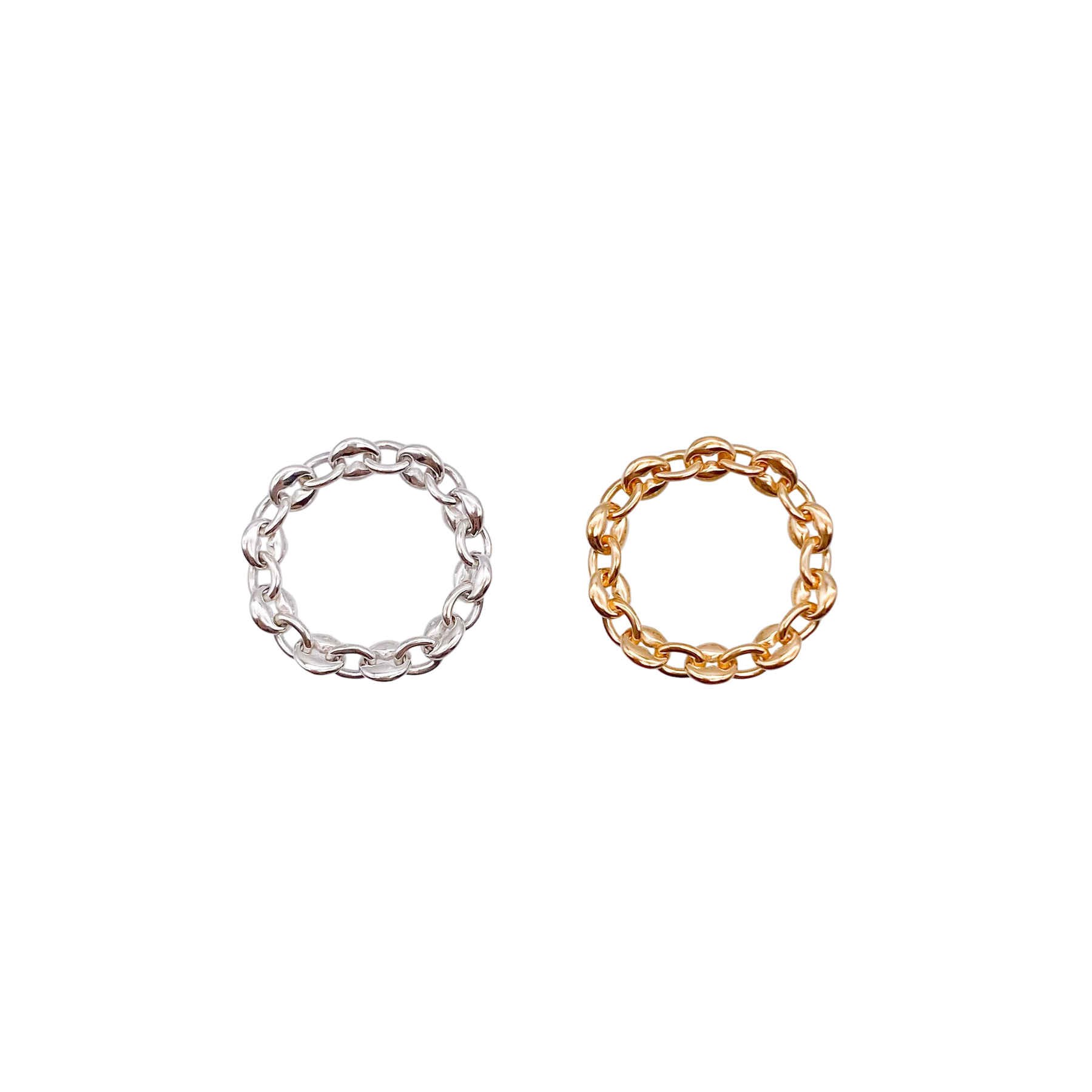 小さな円形のオリジナルパーツを繋いだ、細く丸みのある普段使いしやすいチェーンリング。