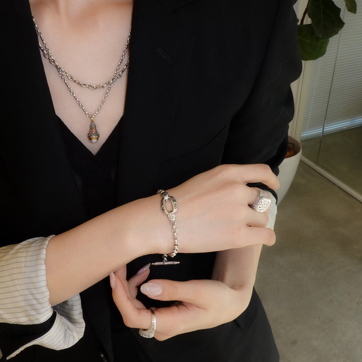 マンテルタイプのブレスレット。大きめのモチーフとマンテル部分には繊細な装飾が施されています。チェーンが細めのため、ゴツゴツとした印象ではなく、さらりと着用しやすいデザインです。