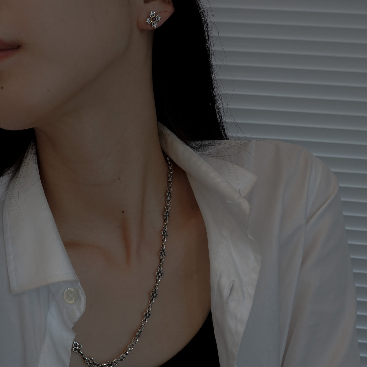 無骨なフラワーチェーンのネックレス。留める位置を変えて自由にスタイリングできます。
