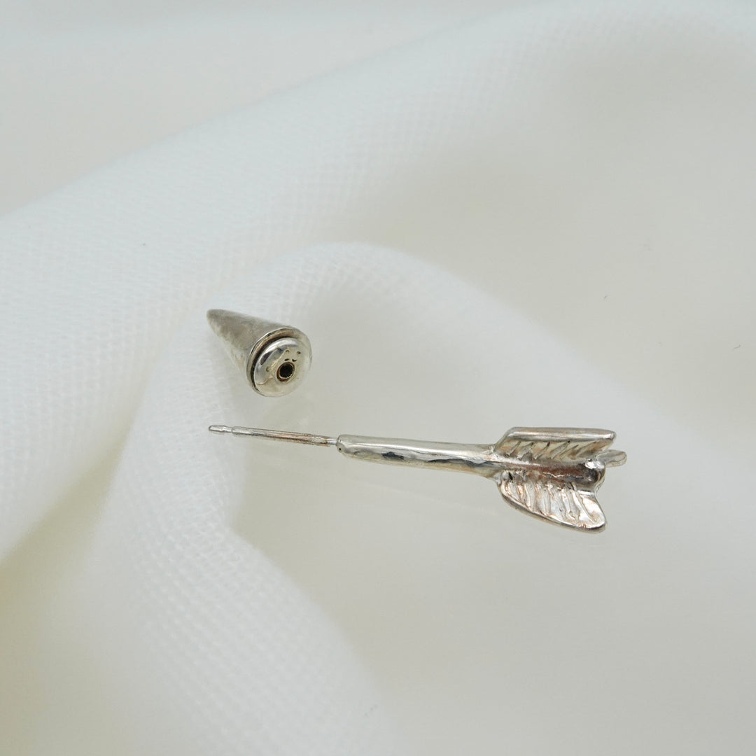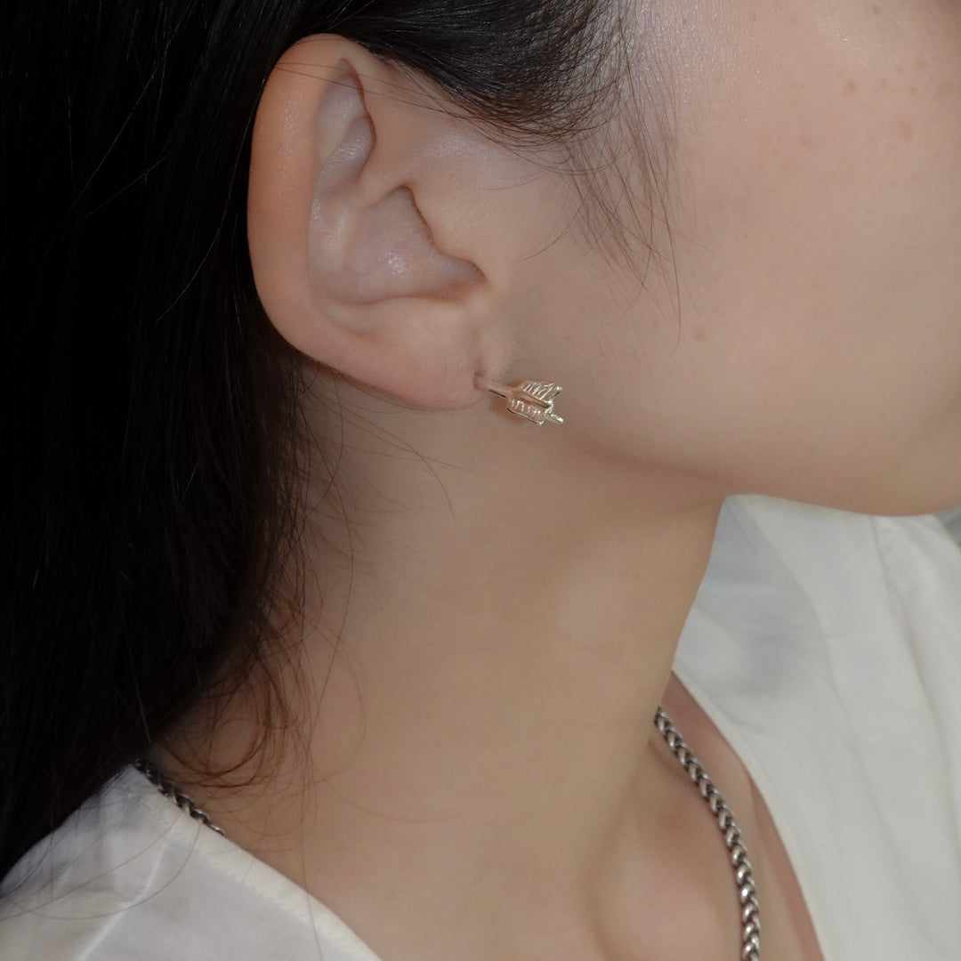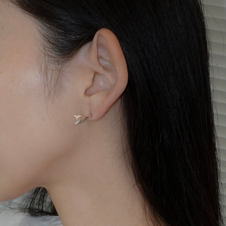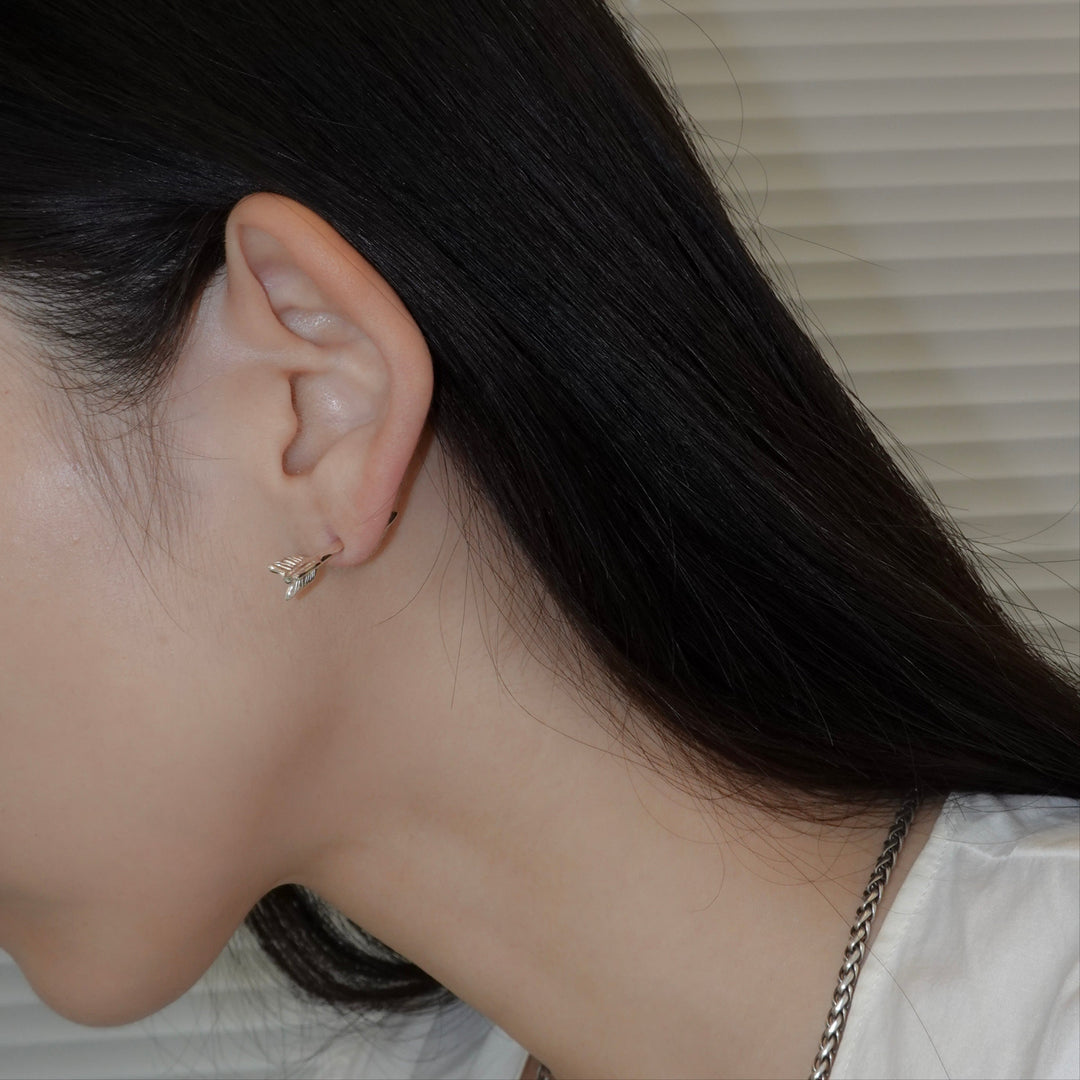 ポストが付いている羽の部分を耳たぶの裏側から刺し、表にキャッチがくるようにお留めいただくと矢が前向きに刺さっているように見えます。