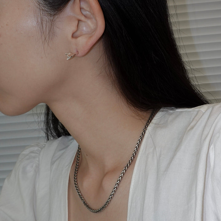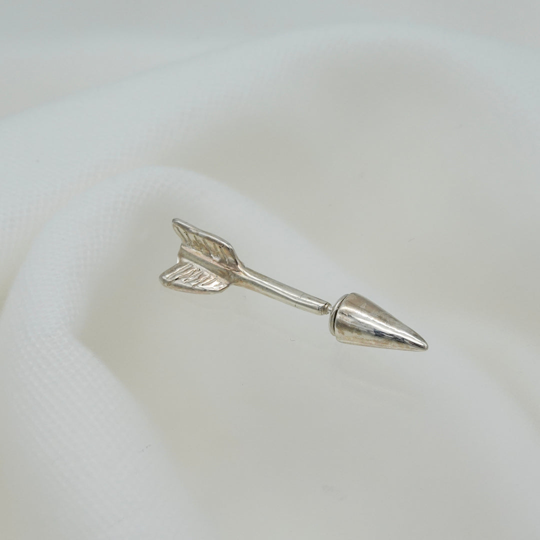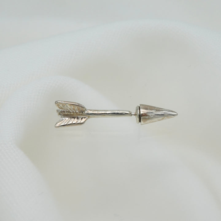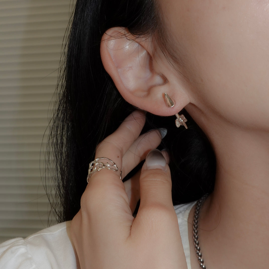 ポストが付いている羽の部分を耳たぶの裏側から刺し、表にキャッチがくるようにお留めいただくと矢が前向きに刺さっているように見えます。