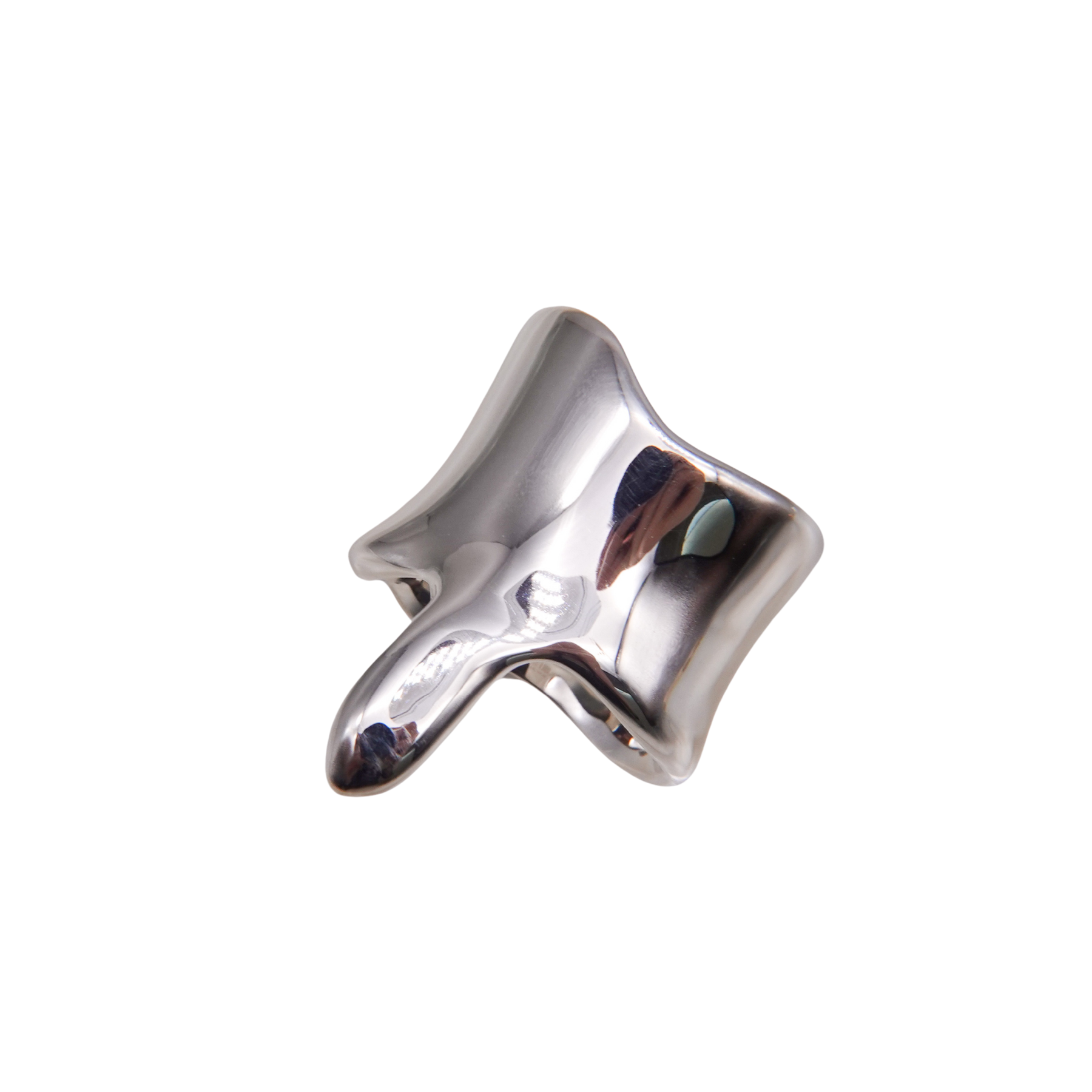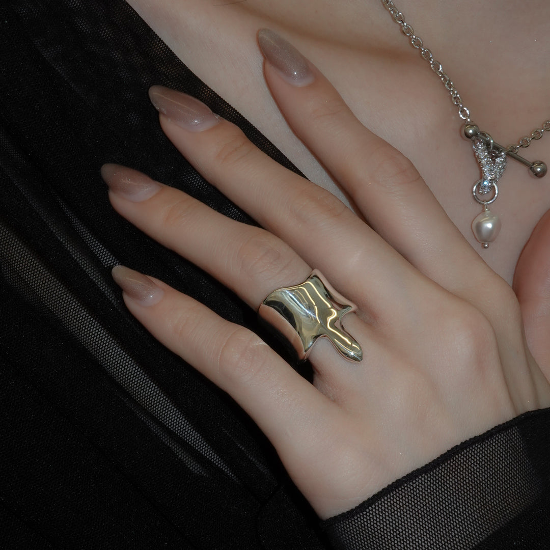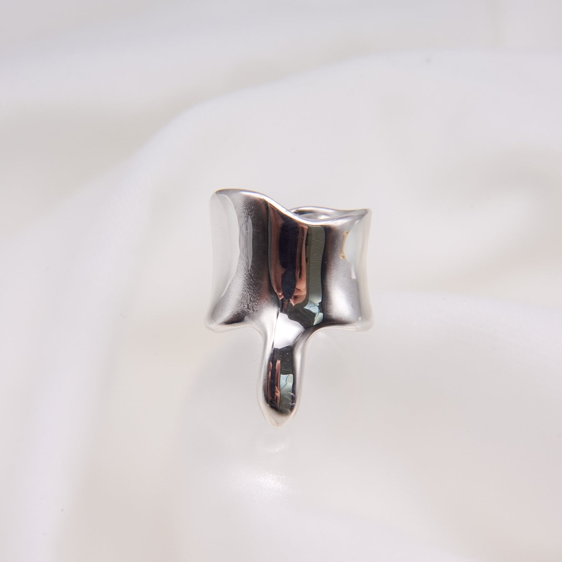 絵の具の艶やかな液ダレ感を表現した、身体にペイントの液が垂れたようなリング。垂れたシルエットは指の間にピッタリとフィットし、指に馴染んでくれます。1つでもしっかり主張のある幅広リングです。