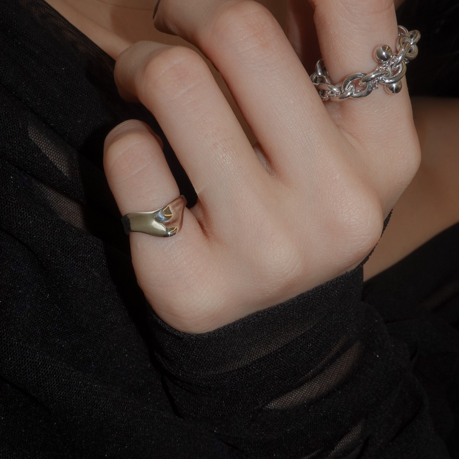 絵の具の艶やかな液ダレ感を表現した、身体にペイントの液が垂れたようなファランジリング。柔らかいVラインが、指を美しく魅せます。軽い着け心地で毎日のコーディネートに合わせやすいリングです。ピンキーリングとしてもご使用いただけます。