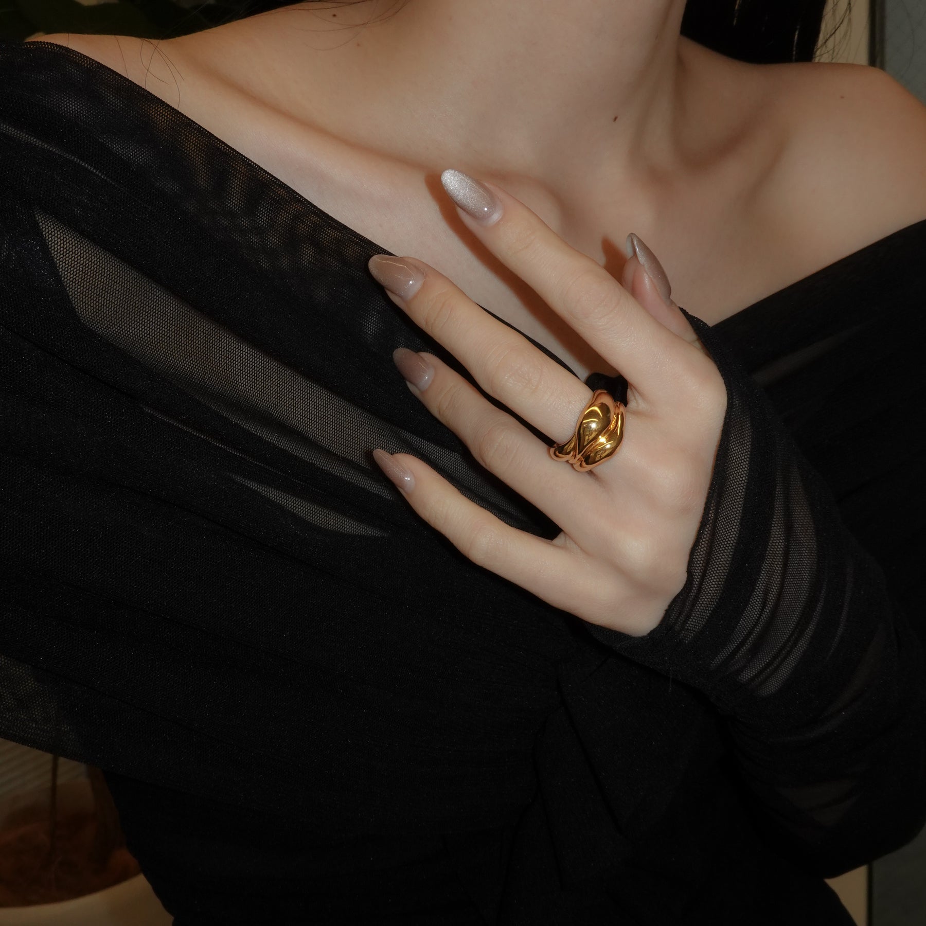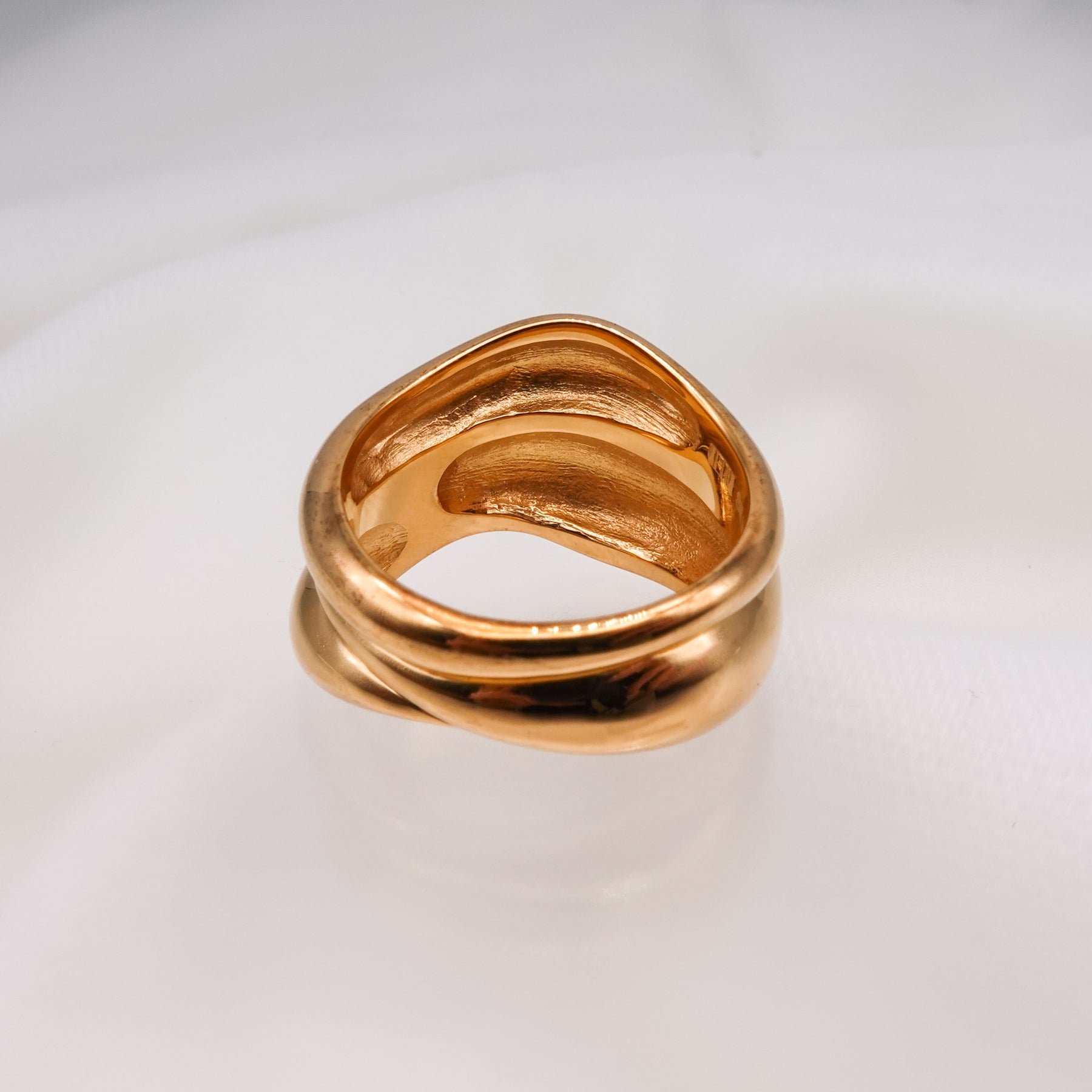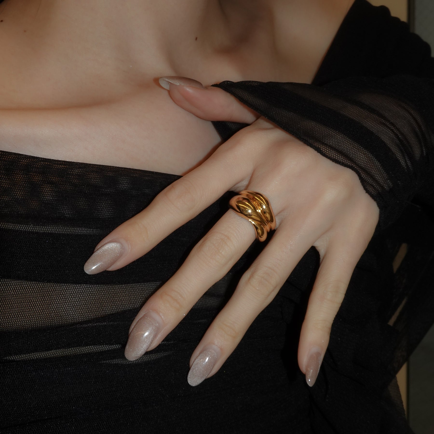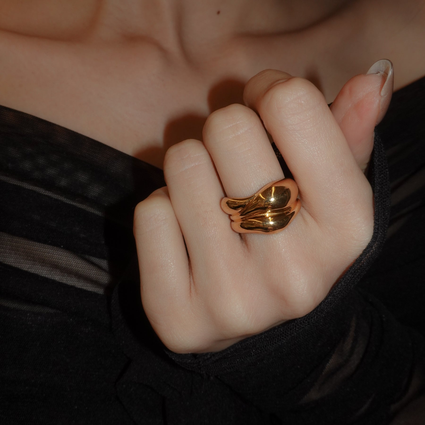 女性の身体をイメージしたリング。身体は人それぞれの愛しい個性であり、脂肪もその一つ。お腹や胸など、脂肪が密着した柔らかくもっちりとした印象をリングに落とし込んだデザイン。1つでもしっかりとボリュームがあり、主張してくれます。