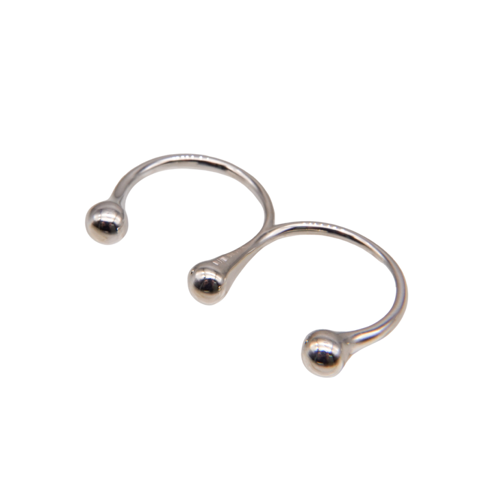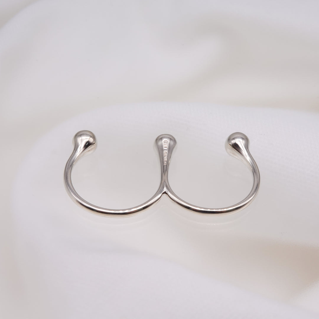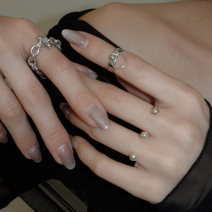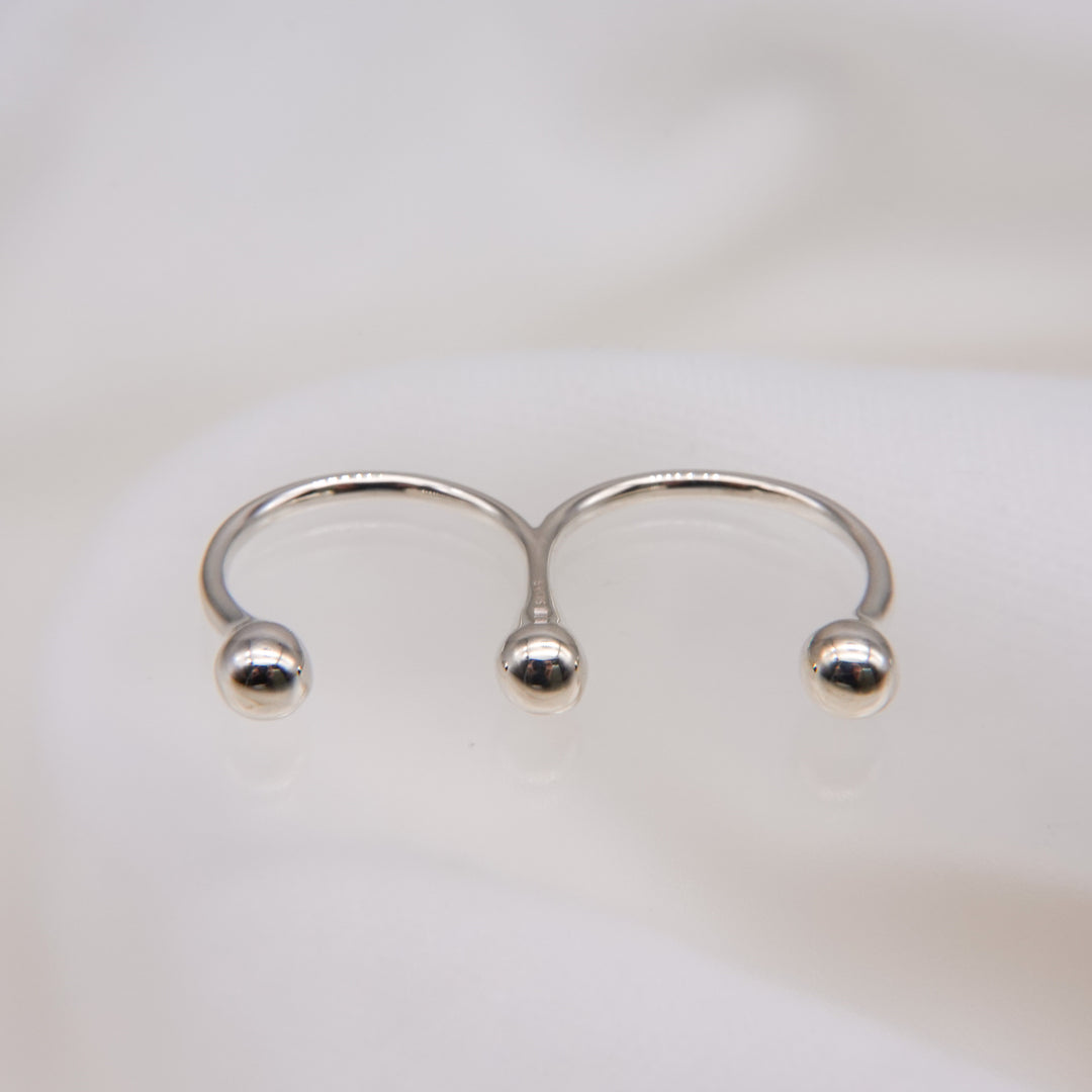 指の間にボールモチーフが飾る、ボディピアスを着けている様なダブルリング。指の間にモチーフがくることで、シンプルながらも新しい印象を手元に与えてくれます。2本の指に着けるタイプのリングのため、動きやすさが気になる方は中指、薬指に着けるのがオススメです。