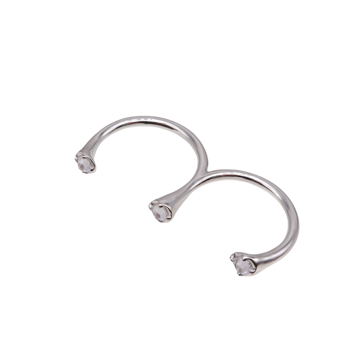 指の間にキラキラと石が輝く、ダブルリング。あえて石を逆さにセットし、スタッズが留められたようなデザインです。さり気なく、エッジィな雰囲気で輝く石がポイント。2本の指に着けるタイプのリングのため、動きやすさが気になる方は中指、薬指に着けるのがオススメです。