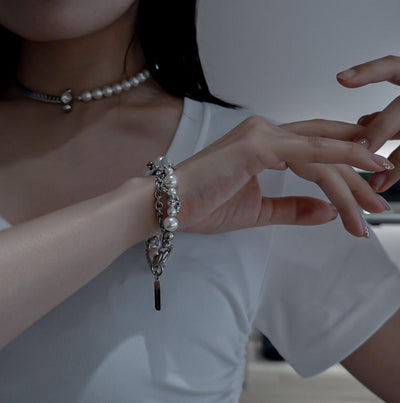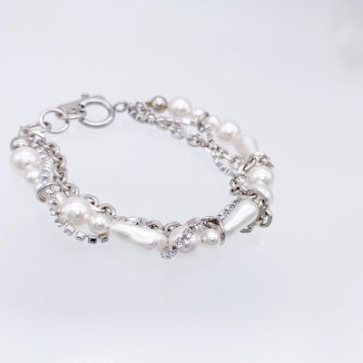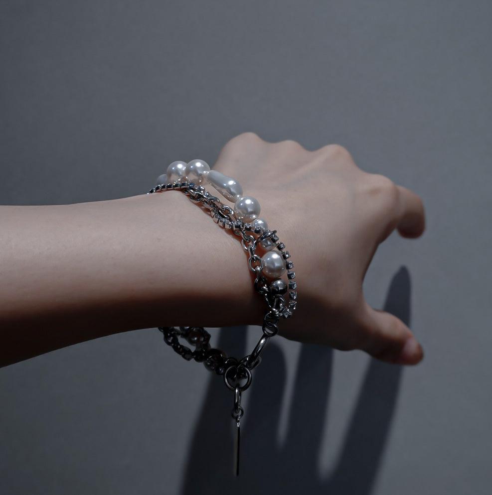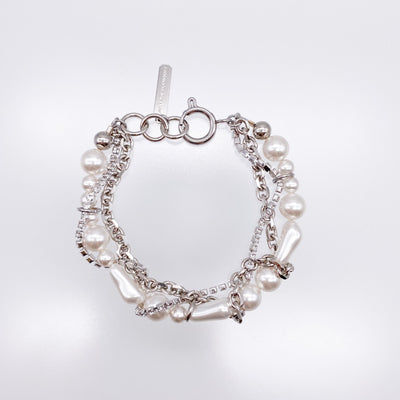 大粒のクリスタルパールにスワロフスキーチェーンが絡み合うボリューミーで華やかなブレスレット。一本で抜群の存在感を放ちます。