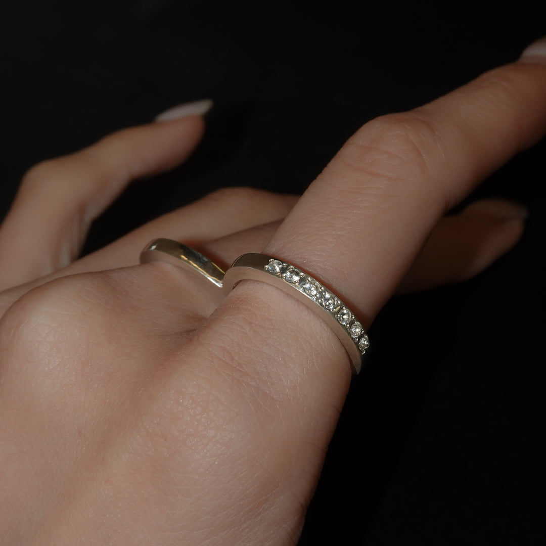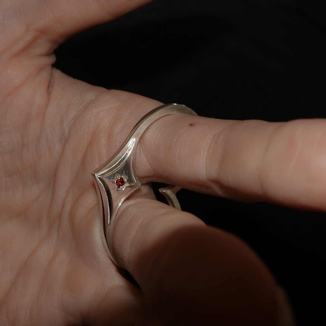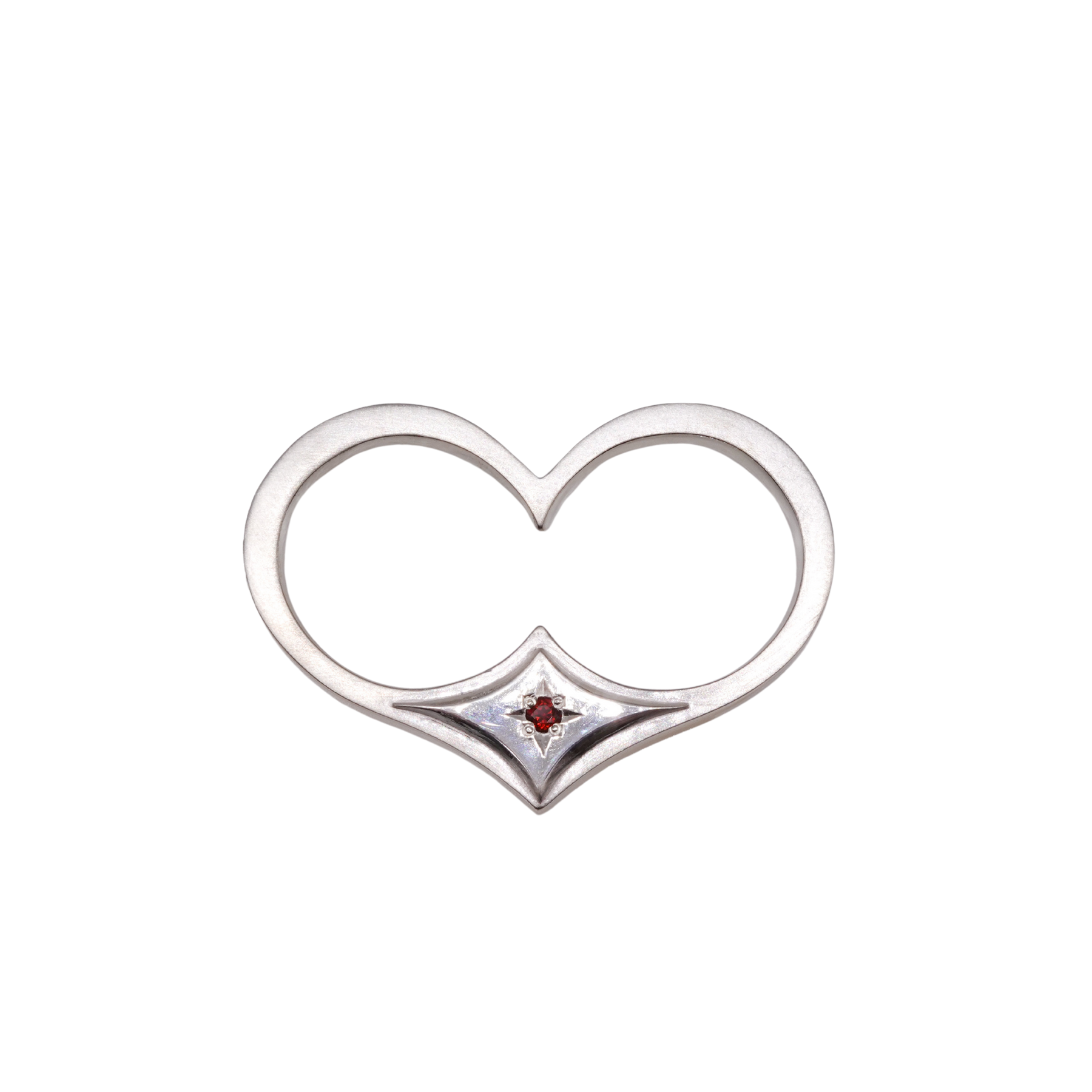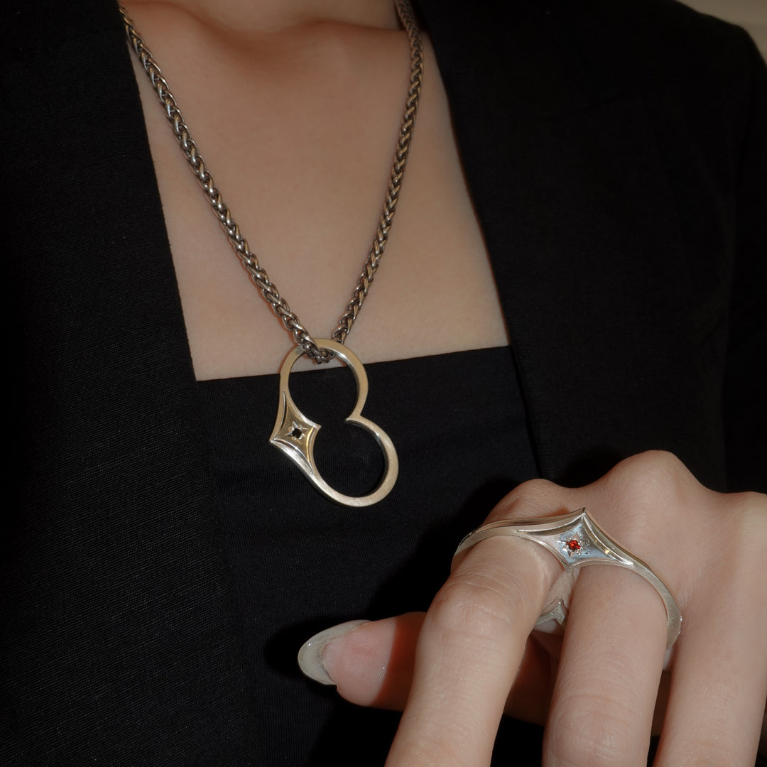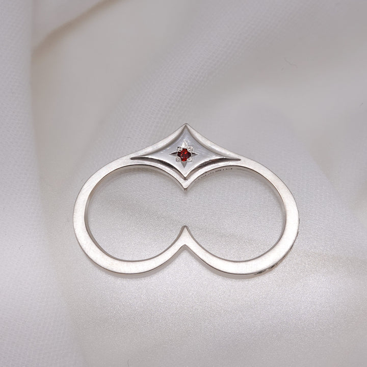 懐かしさを纏ったAMATAダブルリング。 古来より縁起が良いとされてきたHeart(猪の目)モチーフに、数多の天然石をミル留めであしらい、大胆なフォルムとその煌めきが、手元に繊細でパンクなムードを添えます。 重ね着けでも単体でも映え、快適な着け心地。11〜15号程度のフリーサイズ。人差し指から小指まで、フィットする指にご着用ください。 上下どちらの向きでも着用でき、チェーンを通してペンダントトップとしてもお楽しみいただけます。