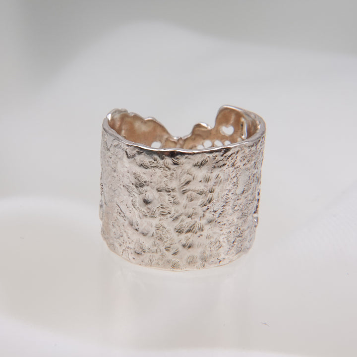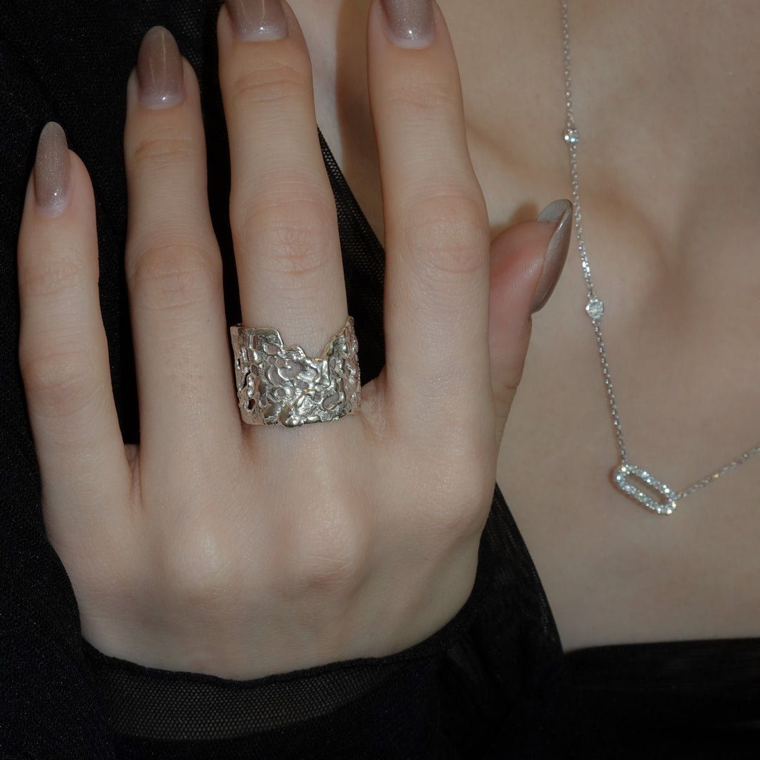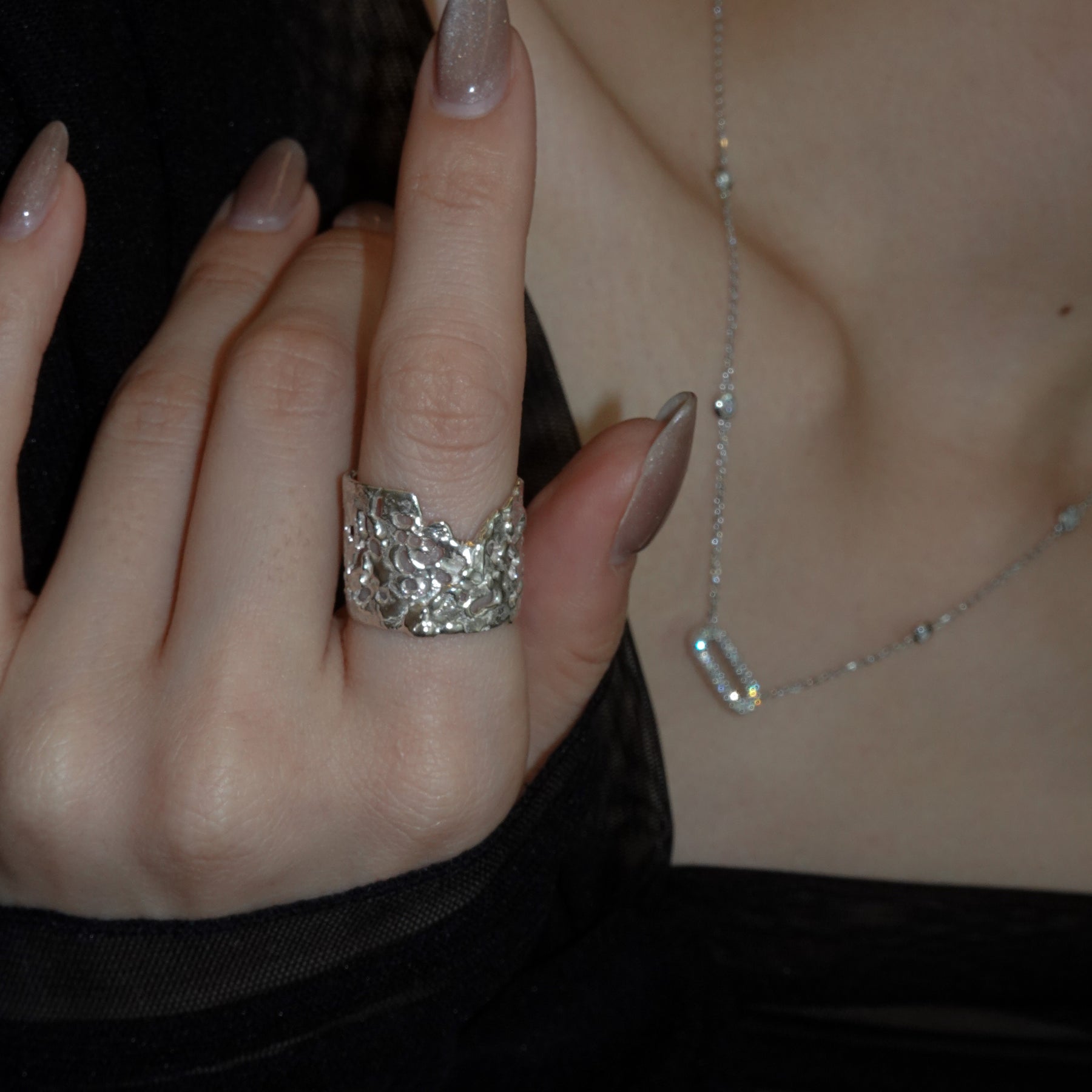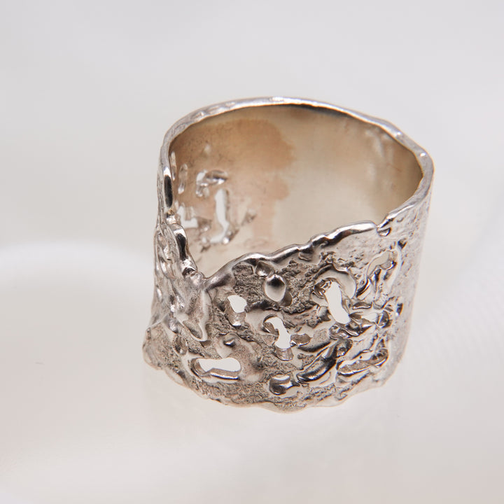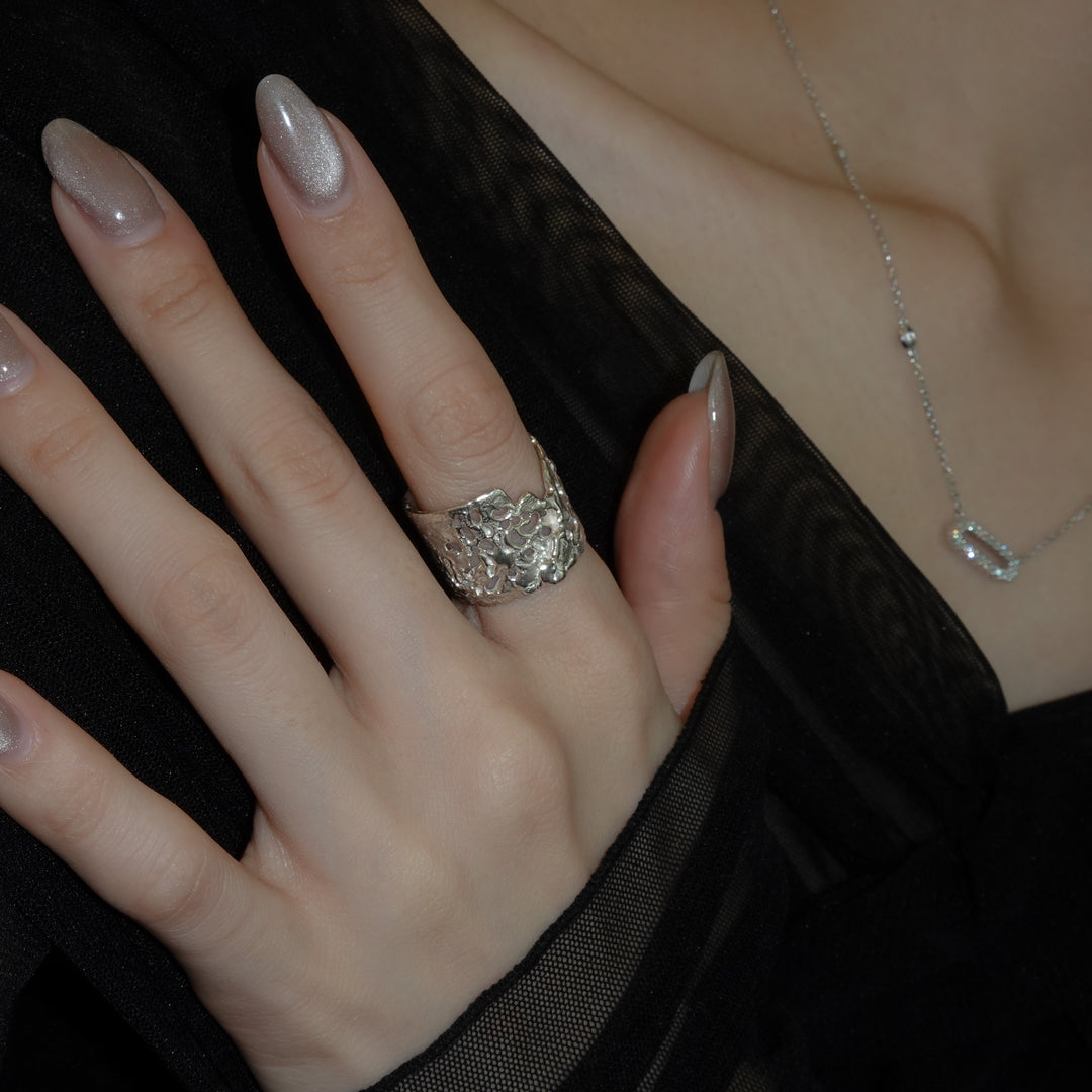 手作業でシルバーを溶かし、溶岩の様な質感を表現したリング。一つで十分なボリュームとインパクトがあり、バランスを取りやすいアイテムです。