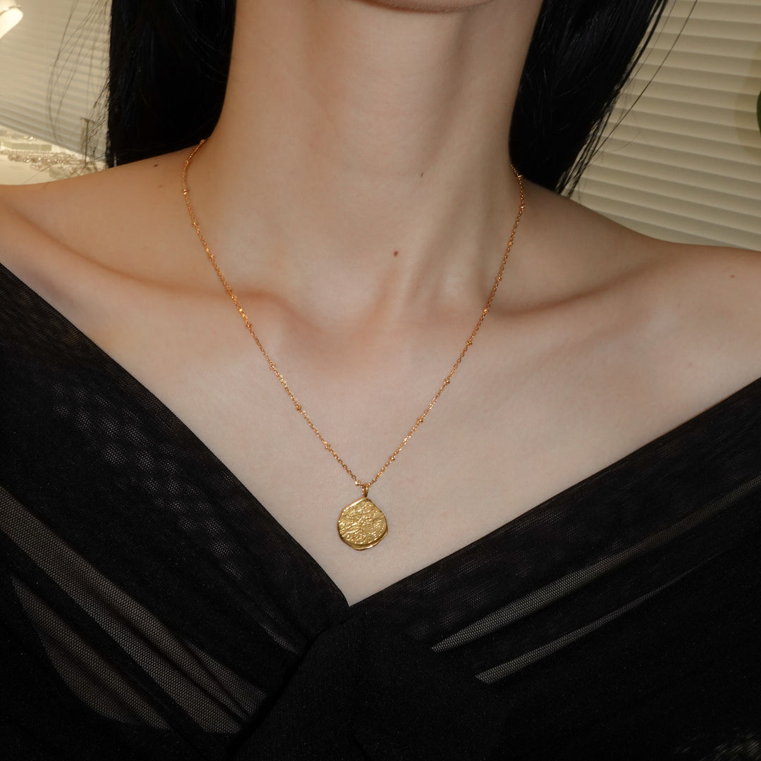 花嫁の左靴に入れると安定した結婚生活を送れるといった伝承や、また幸せな結婚や恋愛成就のアイテムとしても知られる、6ペンスコインをモチーフにしたチャームネックレス。
