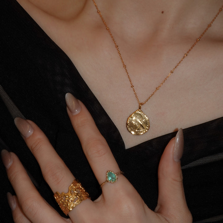 花嫁の左靴に入れると安定した結婚生活を送れるといった伝承や、また幸せな結婚や恋愛成就のアイテムとしても知られる、6ペンスコインをモチーフにしたチャームネックレス。